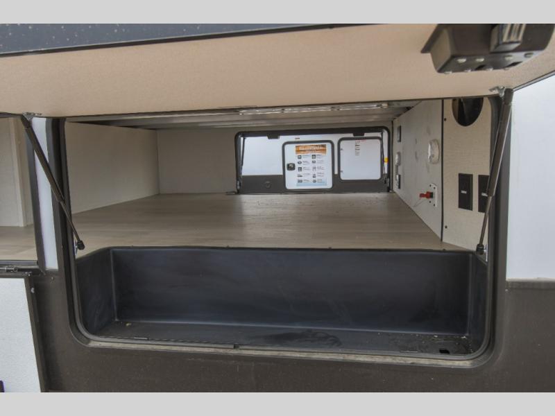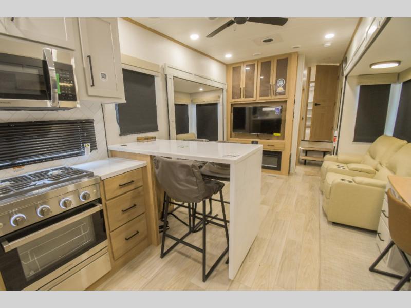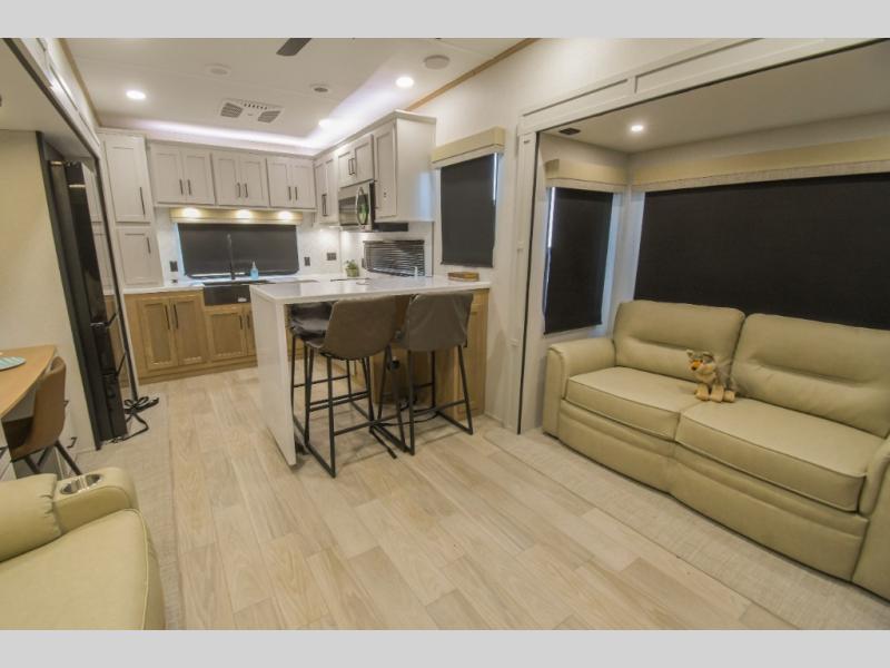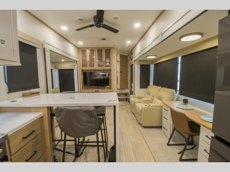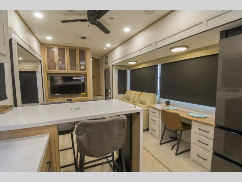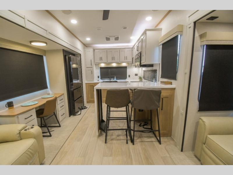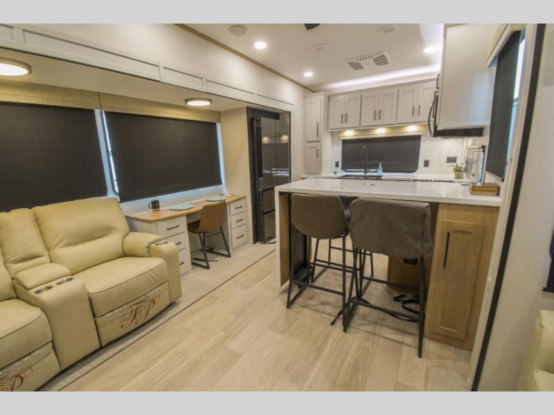 If you're looking to go full-time RVing, this fifth wheel is packed with convenient features! The master bedroom includes a king bed slide out with USB ports on either side of the bed so you both can charge your phones, and there is a dresser for your folded clothes. You will love the front bathroom with dual bath sinks, a shower with a seat, plus a walk-in closet with shelves! There is a unique middle utility room with washer and dryer prep and a counter that will make a perfect laundry room, or you can utilize this space for storage! Head to the main living area to relax on the theater seating or hide-a-bed sofa, and if you have guests stay over, they can sleep here. There is also an entertainment center with a 50" flat screen TV, but you might just leave that off if you're working at the desk with a chair that is provided. We've saved the best part for last; the kitchen! Here, you'll find ample counter space to prep home-cooked meals, a three burner range with a 24" oven, plus a large counter with barstools where you can enjoy breakfast at each morning. Choosing this fifth wheel is a no-brainer!