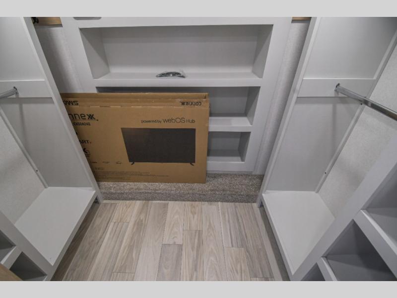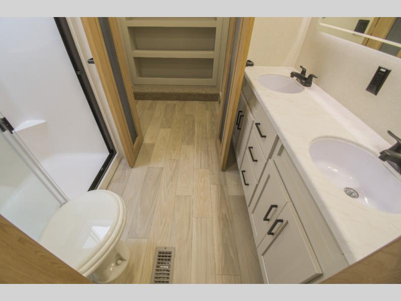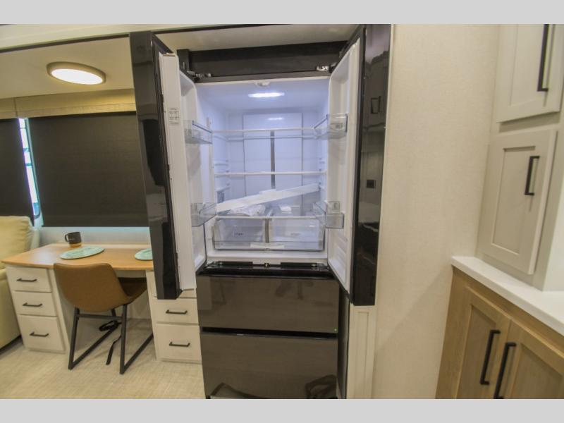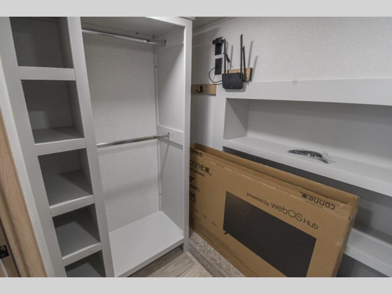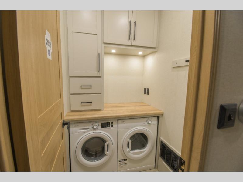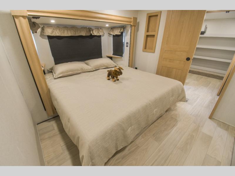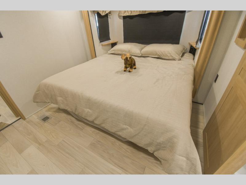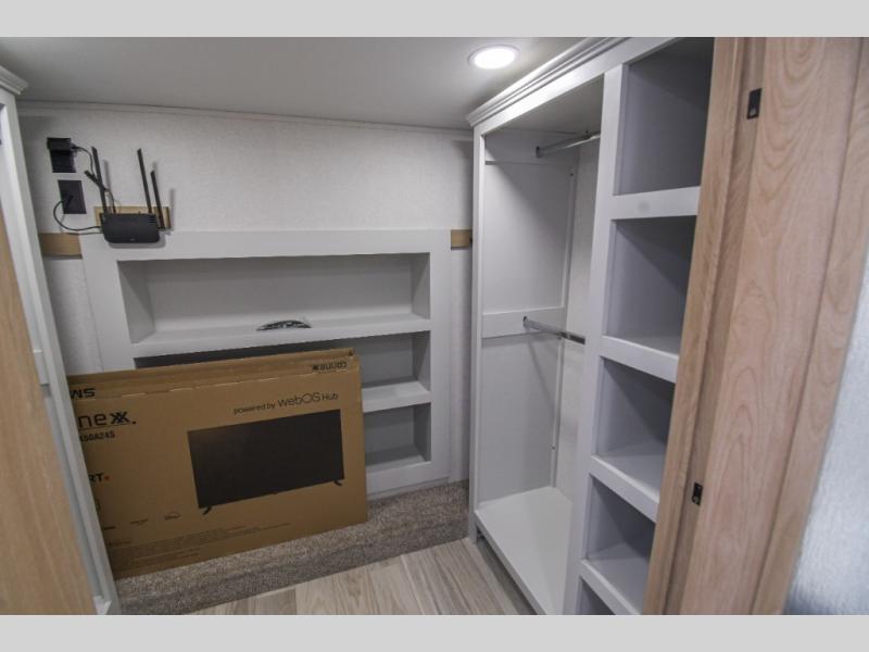 If you're looking to go full-time RVing, this fifth wheel is packed with convenient features! The master bedroom includes a king bed slide out with USB ports on either side of the bed so you both can charge your phones, and there is a dresser for your folded clothes. You will love the front bathroom with dual bath sinks, a shower with a seat, plus a walk-in closet with shelves! There is a unique middle utility room with washer and dryer prep and a counter that will make a perfect laundry room, or you can utilize this space for storage! Head to the main living area to relax on the theater seating or hide-a-bed sofa, and if you have guests stay over, they can sleep here. There is also an entertainment center with a 50" flat screen TV, but you might just leave that off if you're working at the desk with a chair that is provided. We've saved the best part for last; the kitchen! Here, you'll find ample counter space to prep home-cooked meals, a three burner range with a 24" oven, plus a large counter with barstools where you can enjoy breakfast at each morning. Choosing this fifth wheel is a no-brainer!