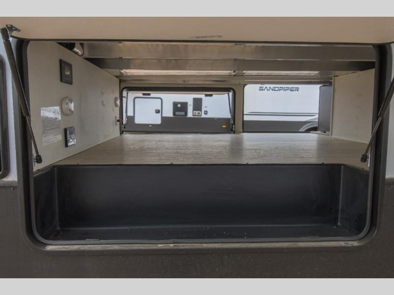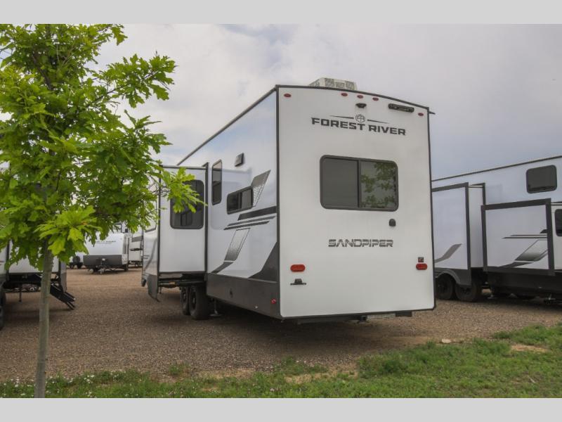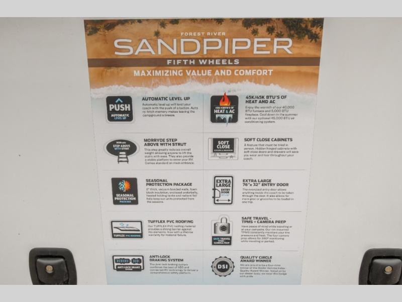 You will find the perfect balance of size, space, features, and luxury with any one of these Forest River Sandpiper fifth wheels! They are constructed with a welded aluminum framed vacuum bonded laminated superstructure, a cambered powder coated frame with rust prohibitor, and a fully enclosed underbelly for added protection against the elements. The large tinted windows come with a 80/20 UV prohibitor or you can choose the optional dual pane windows. Some hassle-free amenities include a 60k BTU on-demand water heater, full coach water filter system, tire pressure monitor system, and an electric leveling system! Inside, you'll enjoy stainless steel appliances, solid surface countertops, Beachside Sundance linoleum, recessed residential lighting, and many more comforts!