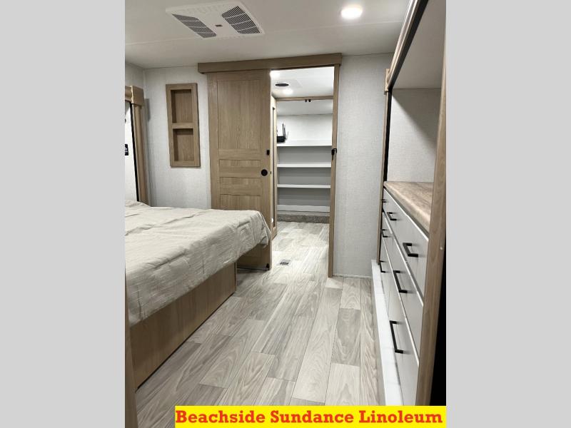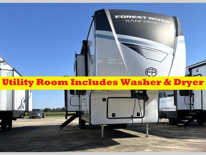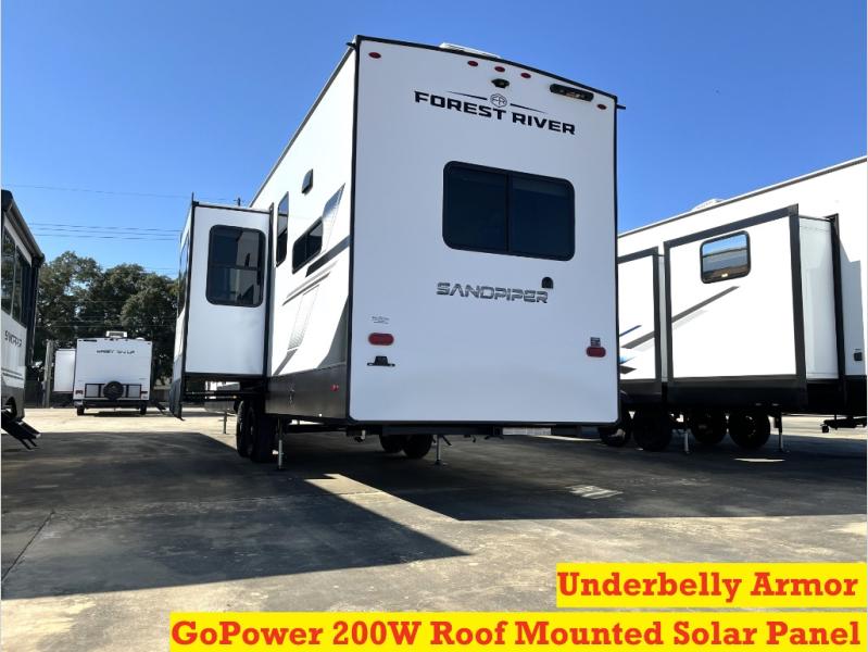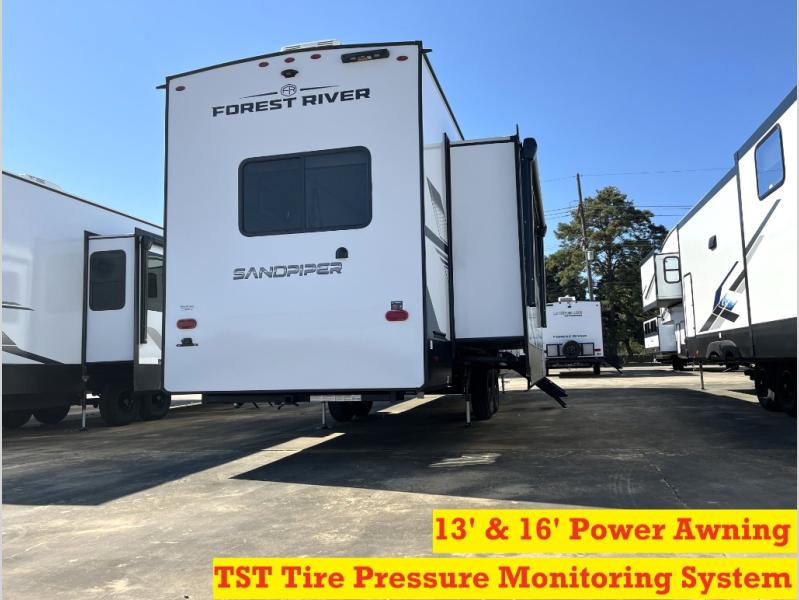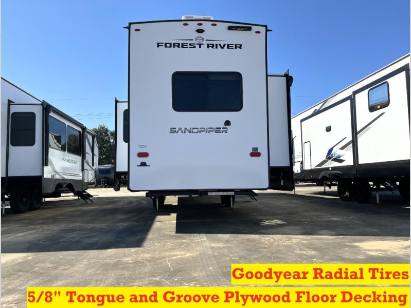 You will find the perfect balance of size, space, features, and luxury with any one of these Forest River Sandpiper fifth wheels! They are constructed with a welded aluminum framed vacuum bonded laminated superstructure, a cambered powder coated frame with rust prohibitor, and a fully enclosed underbelly for added protection against the elements. The large tinted windows come with a 80/20 UV prohibitor or you can choose the optional dual pane windows. Some hassle-free amenities include a 60k BTU on-demand water heater, full coach water filter system, tire pressure monitor system, and an electric leveling system! Inside, you'll enjoy stainless steel appliances, solid surface countertops, Beachside Sundance linoleum, recessed residential lighting, and many more comforts!