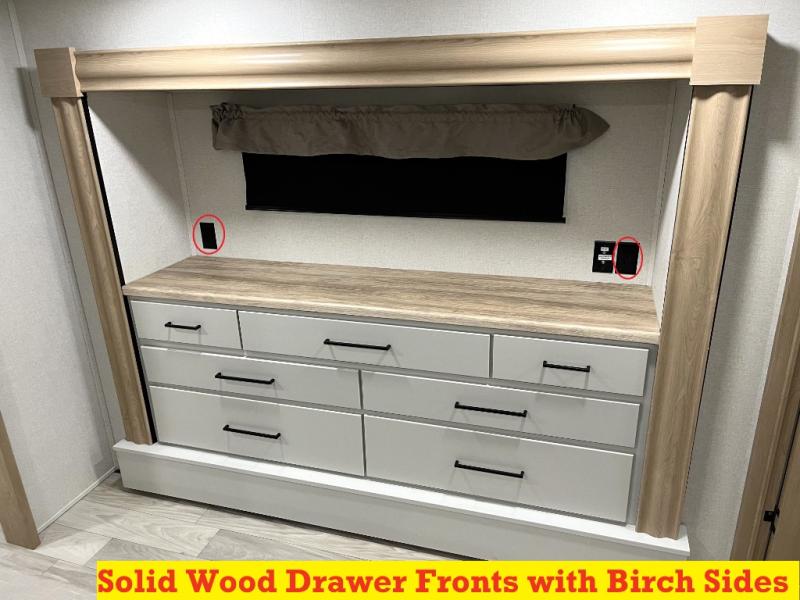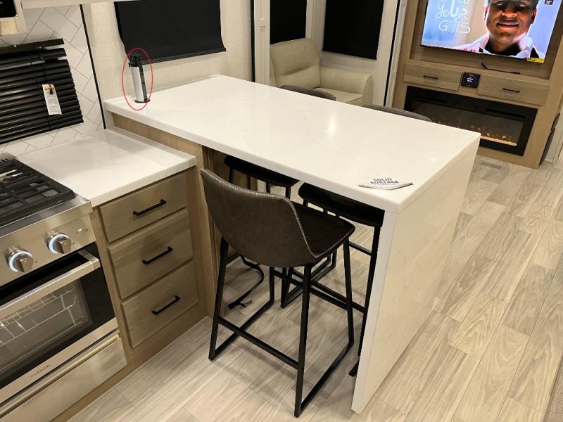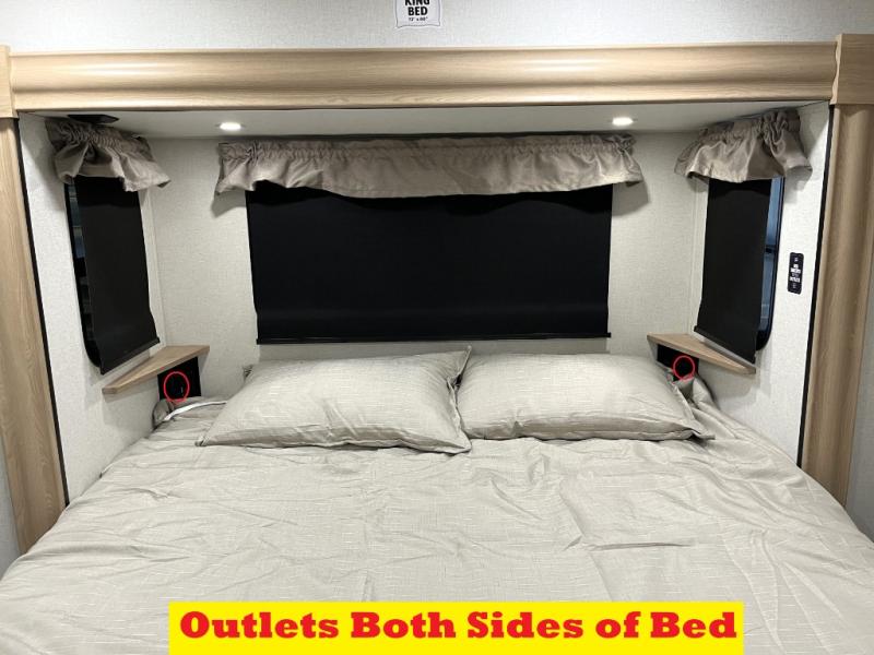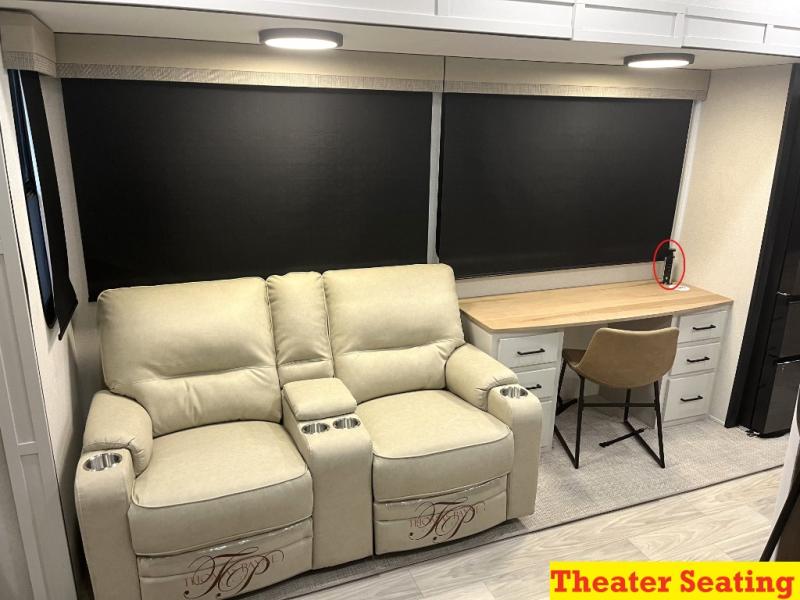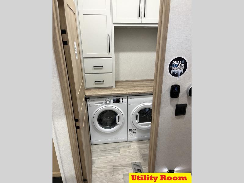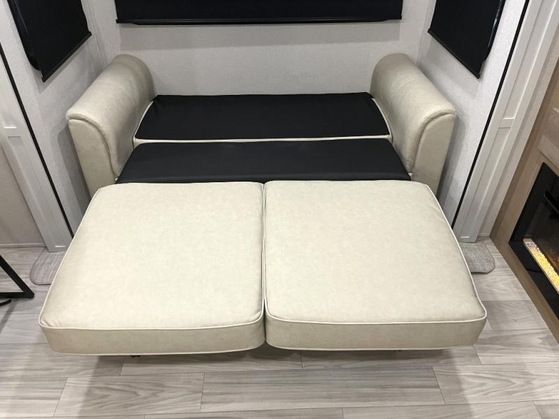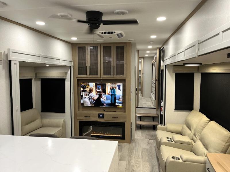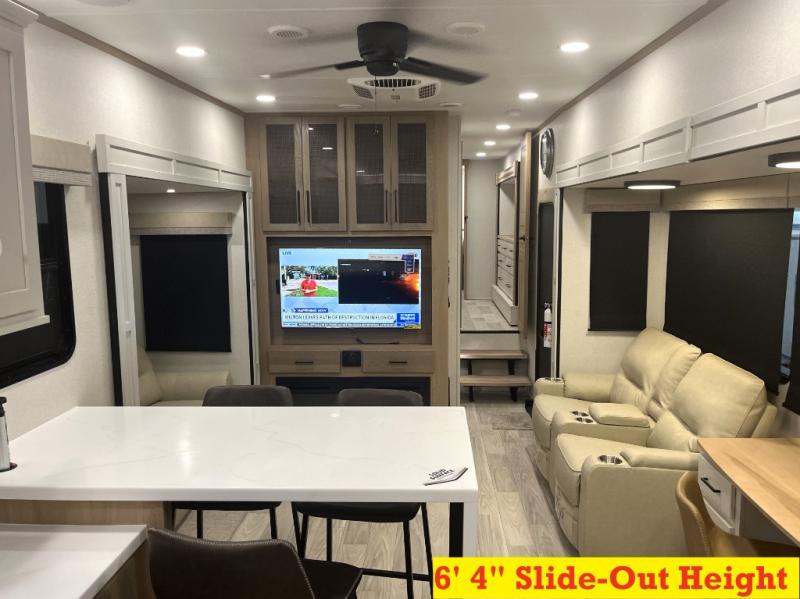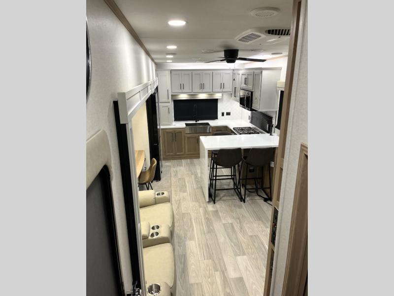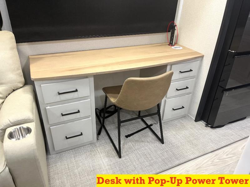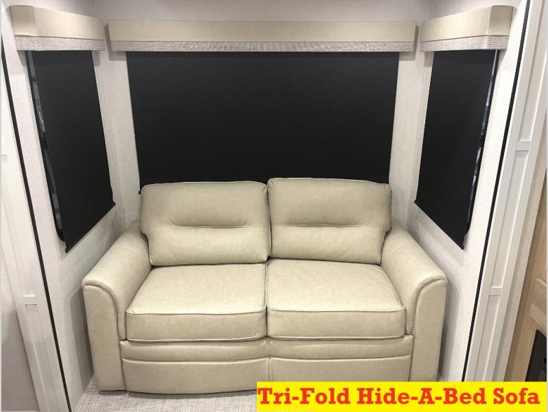 If you're looking to go full-time RVing, this fifth wheel is packed with convenient features! The master bedroom includes a king bed slide out with USB ports on either side of the bed so you both can charge your phones, and there is a dresser for your folded clothes. You will love the front bathroom with dual bath sinks, a shower with a seat, plus a walk-in closet with shelves! There is a unique middle utility room with washer and dryer prep and a counter that will make a perfect laundry room, or you can utilize this space for storage! Head to the main living area to relax on the theater seating or hide-a-bed sofa, and if you have guests stay over, they can sleep here. There is also an entertainment center with a 50" flat screen TV, but you might just leave that off if you're working at the desk with a chair that is provided. We've saved the best part for last; the kitchen! Here, you'll find ample counter space to prep home-cooked meals, a three burner range with a 24" oven, plus a large counter with barstools where you can enjoy breakfast at each morning. Choosing this fifth wheel is a no-brainer!