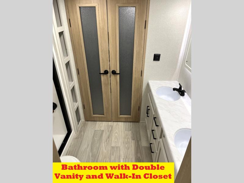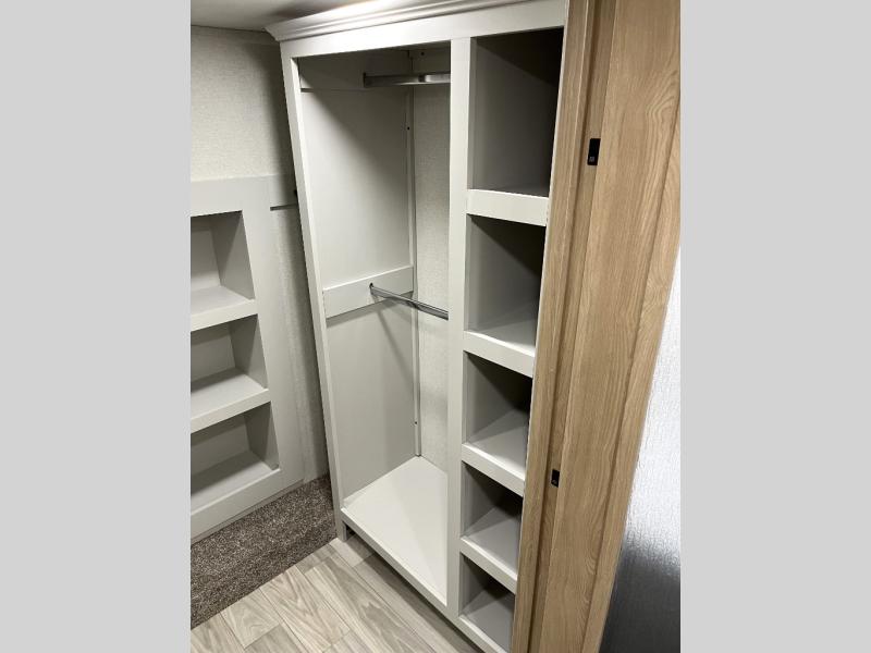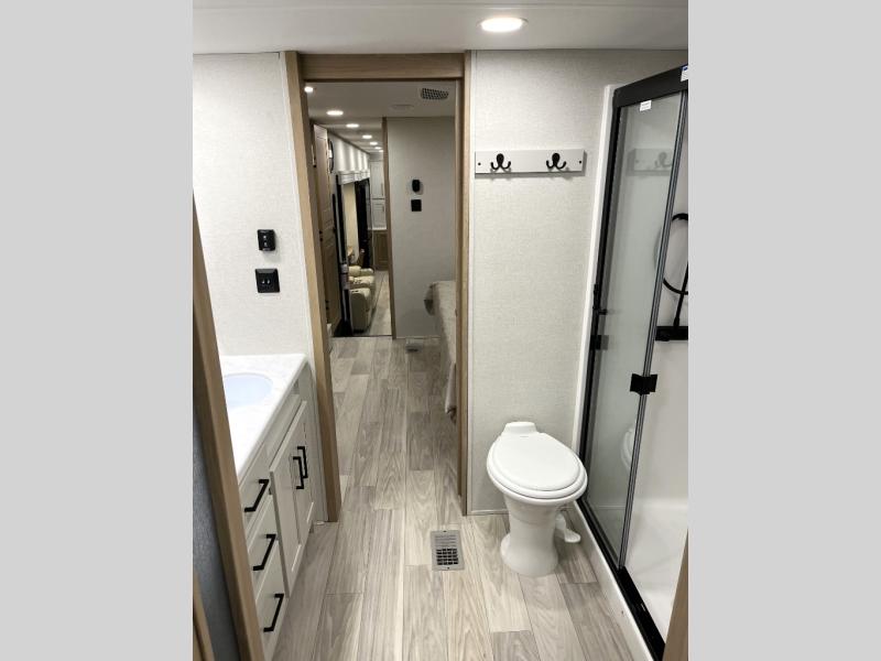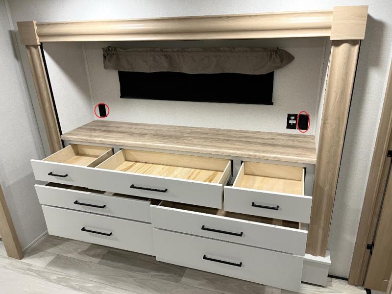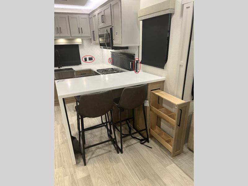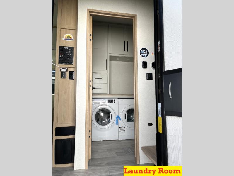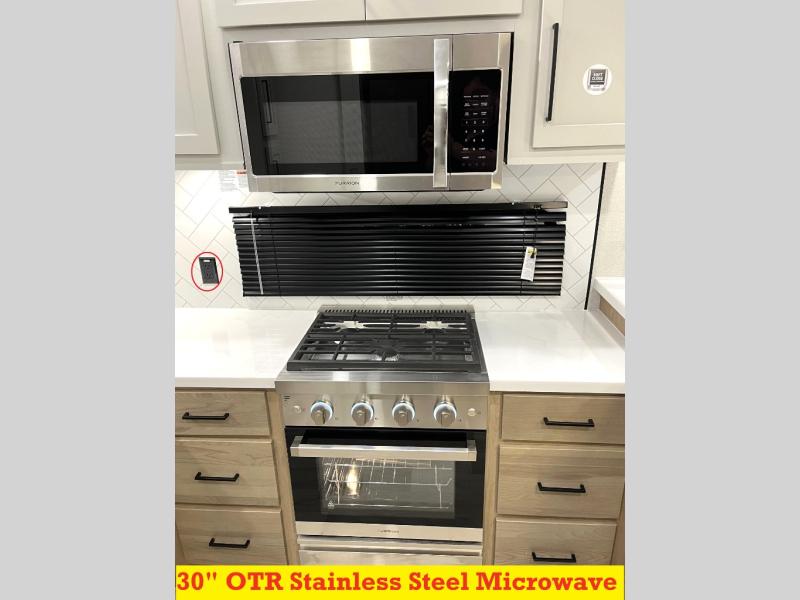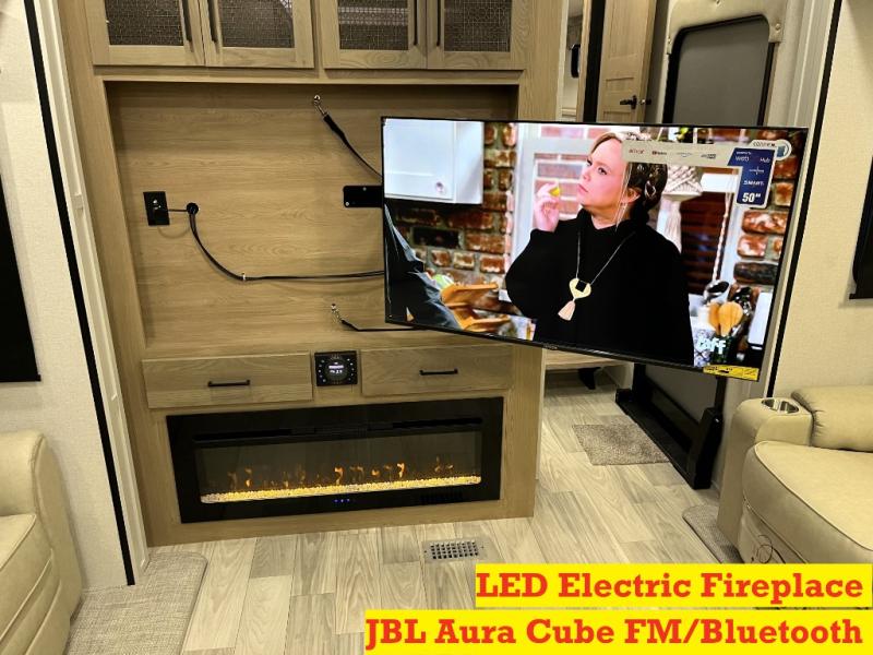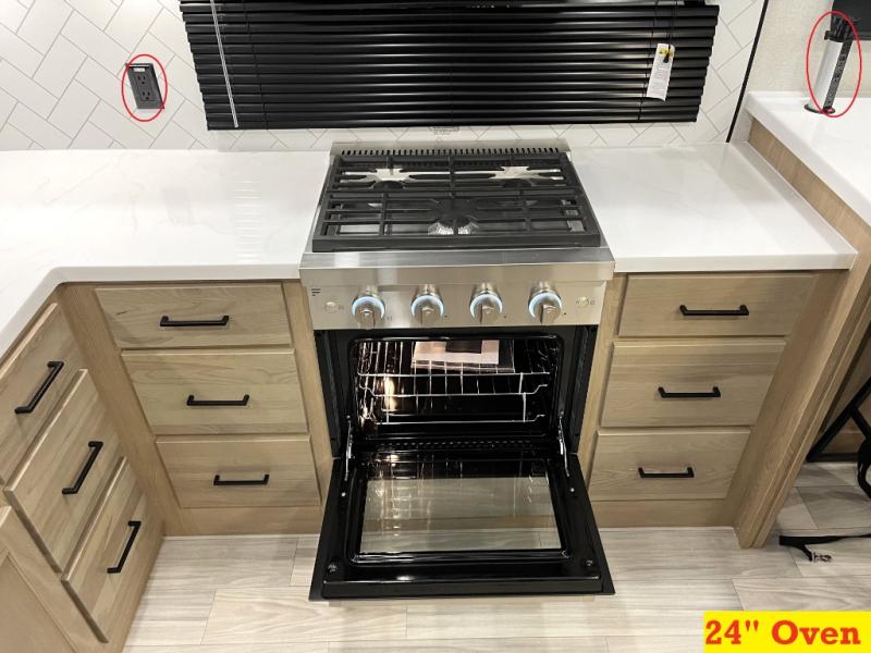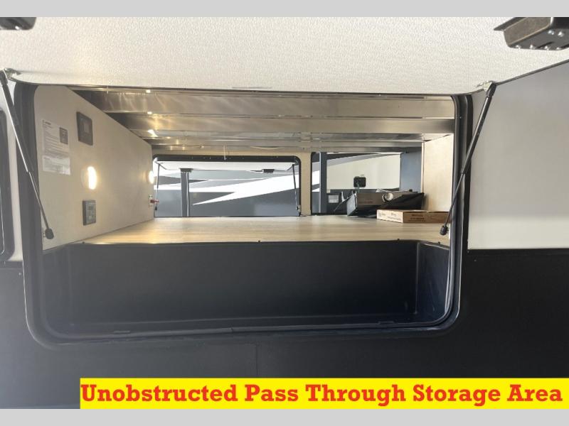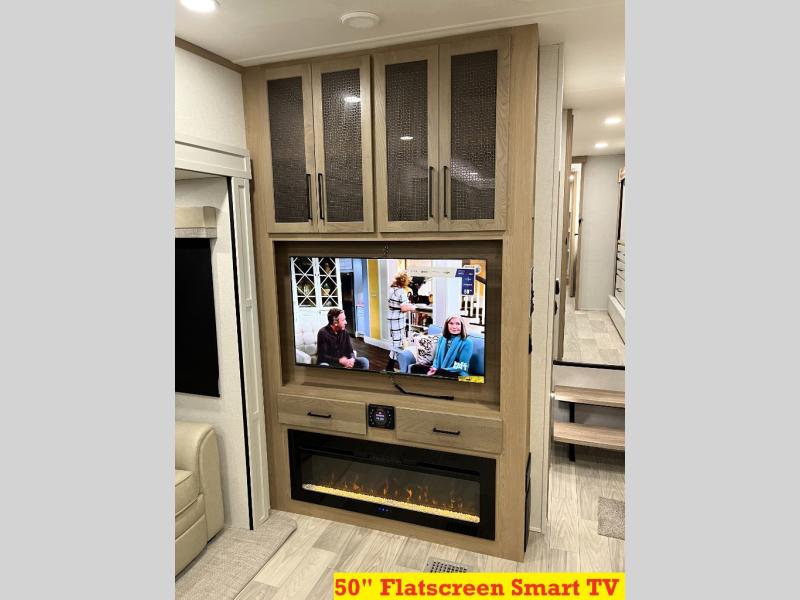If you're looking to go full-time RVing, this fifth wheel is packed with convenient features! The master bedroom includes a king bed slide out with USB ports on either side of the bed so you both can charge your phones, and there is a dresser for your folded clothes. You will love the front bathroom with dual bath sinks, a shower with a seat, plus a walk-in closet with shelves! There is a unique middle utility room with washer and dryer prep and a counter that will make a perfect laundry room, or you can utilize this space for storage! Head to the main living area to relax on the theater seating or hide-a-bed sofa, and if you have guests stay over, they can sleep here. There is also an entertainment center with a 50" flat screen TV, but you might just leave that off if you're working at the desk with a chair that is provided. We've saved the best part for last; the kitchen! Here, you'll find ample counter space to prep home-cooked meals, a three burner range with a 24" oven, plus a large counter with barstools where you can enjoy breakfast at each morning. Choosing this fifth wheel is a no-brainer!