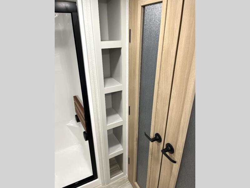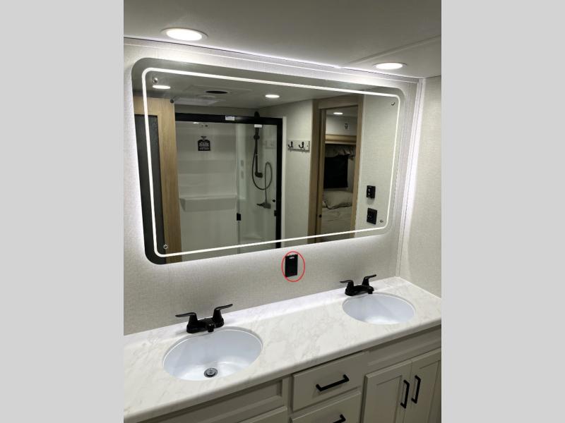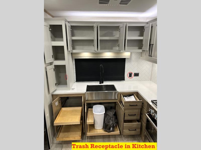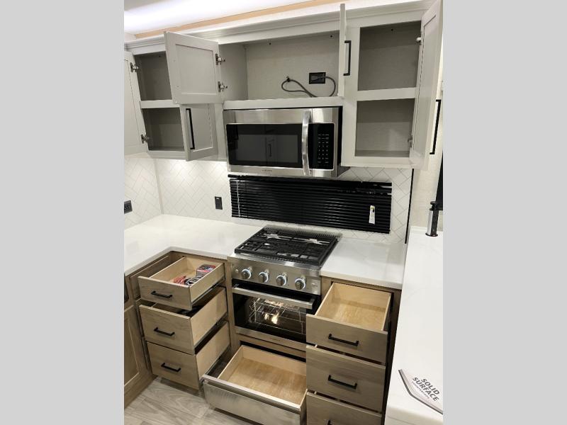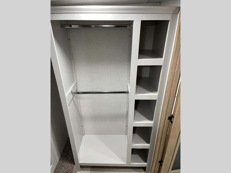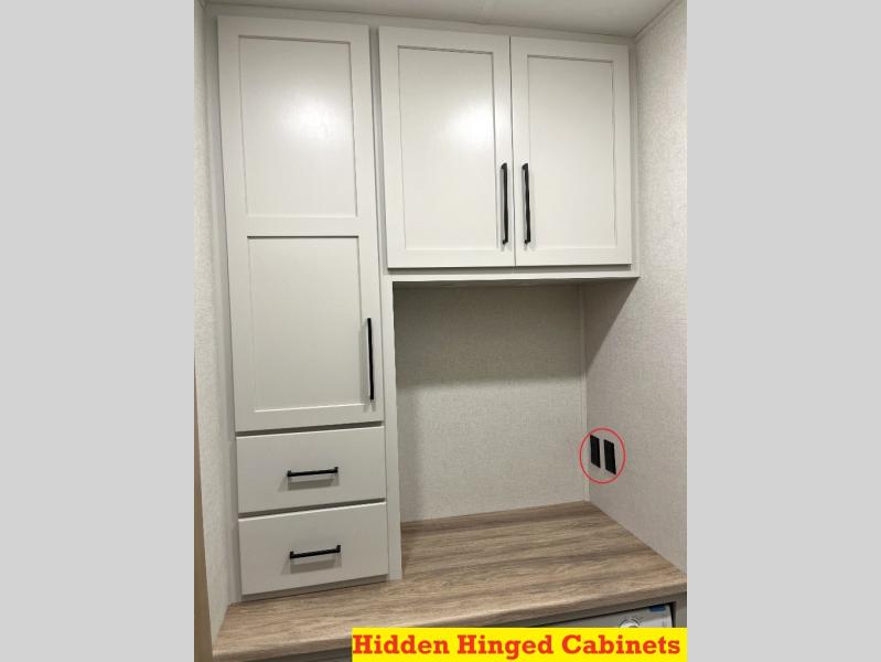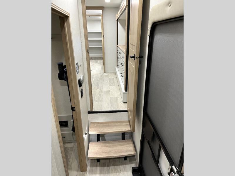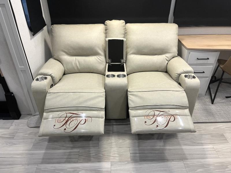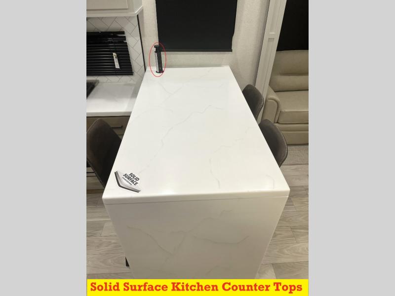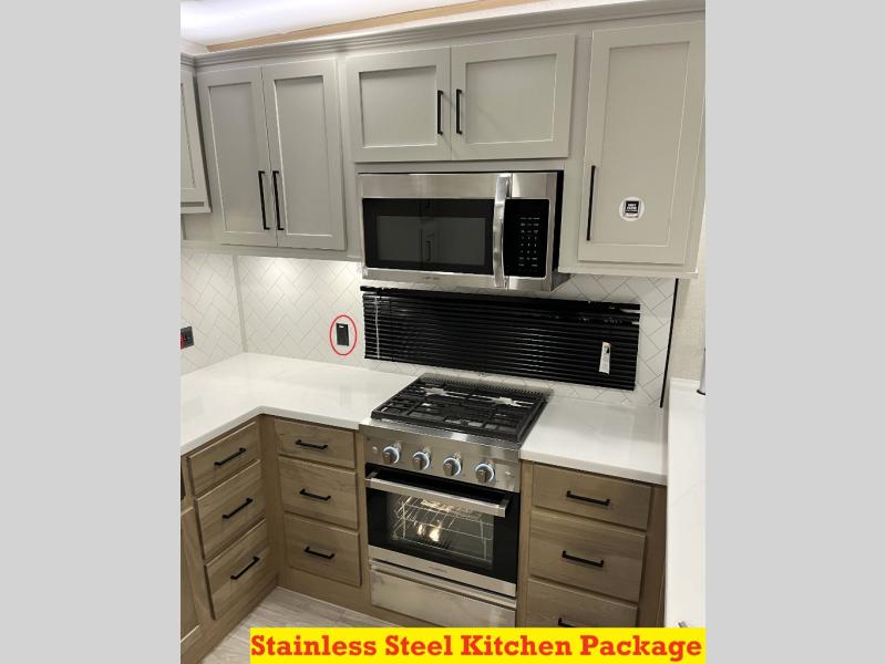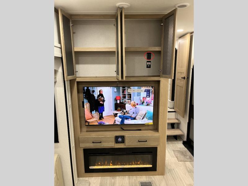 If you're looking to go full-time RVing, this fifth wheel is packed with convenient features! The master bedroom includes a king bed slide out with USB ports on either side of the bed so you both can charge your phones, and there is a dresser for your folded clothes. You will love the front bathroom with dual bath sinks, a shower with a seat, plus a walk-in closet with shelves! There is a unique middle utility room with washer and dryer prep and a counter that will make a perfect laundry room, or you can utilize this space for storage! Head to the main living area to relax on the theater seating or hide-a-bed sofa, and if you have guests stay over, they can sleep here. There is also an entertainment center with a 50" flat screen TV, but you might just leave that off if you're working at the desk with a chair that is provided. We've saved the best part for last; the kitchen! Here, you'll find ample counter space to prep home-cooked meals, a three burner range with a 24" oven, plus a large counter with barstools where you can enjoy breakfast at each morning. Choosing this fifth wheel is a no-brainer!