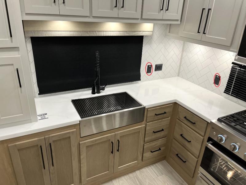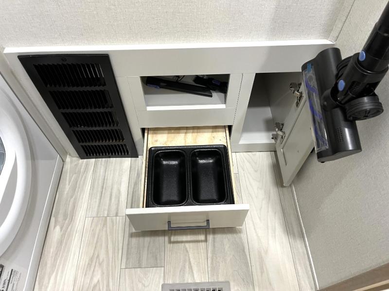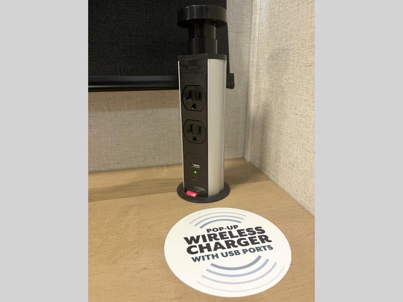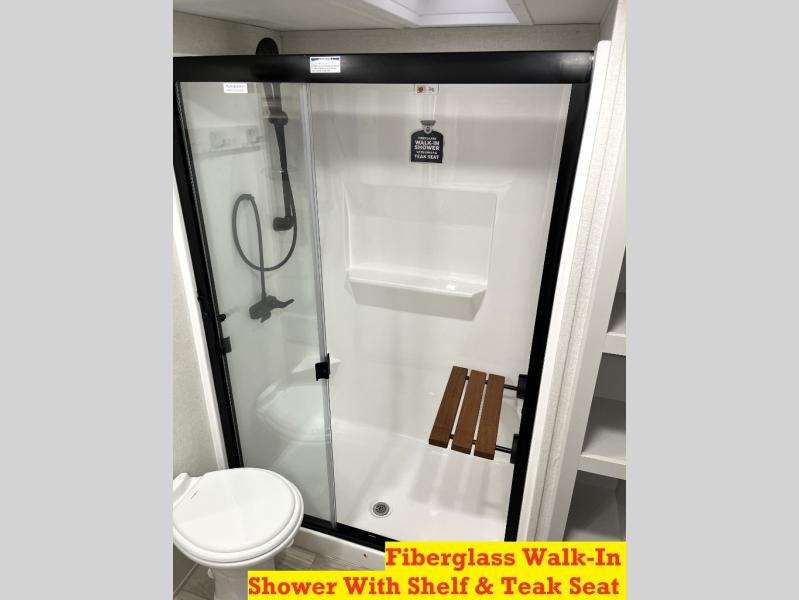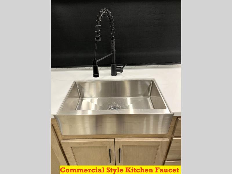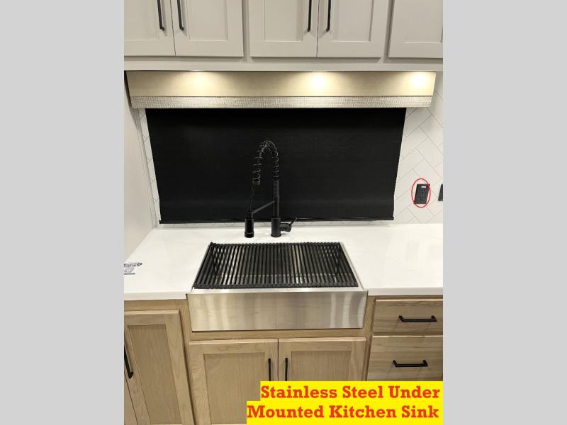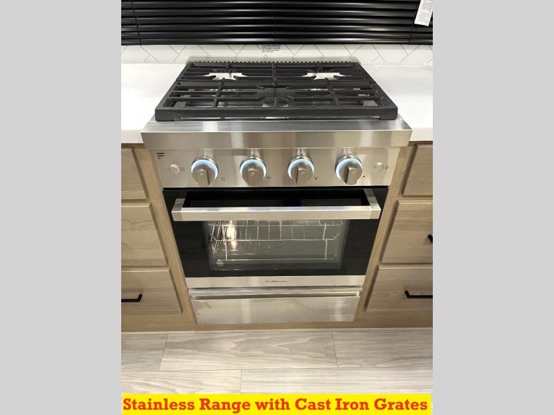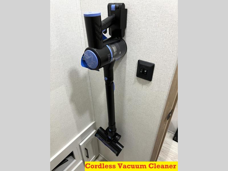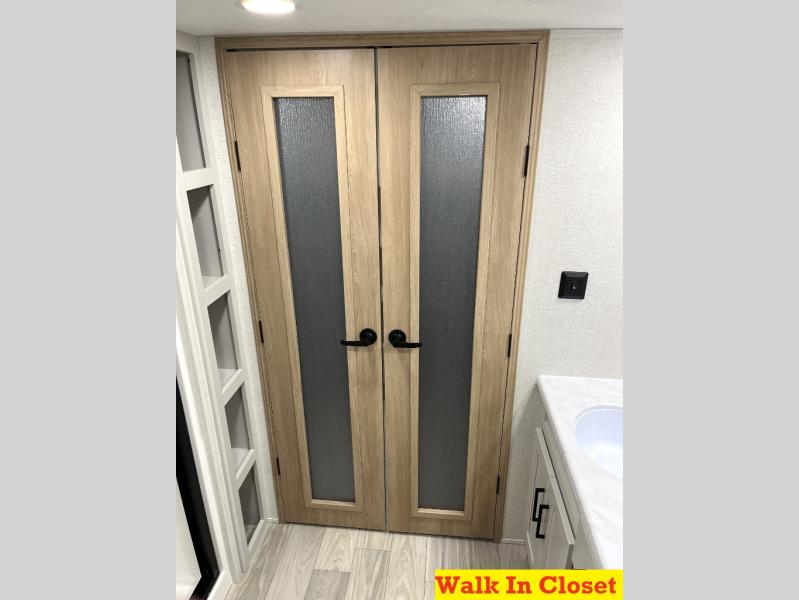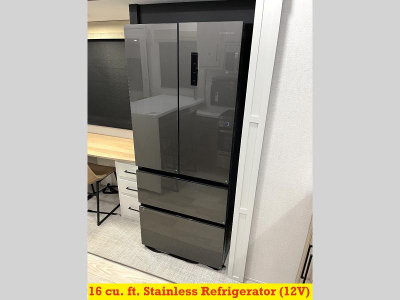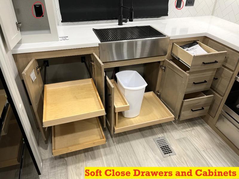 If you're looking to go full-time RVing, this fifth wheel is packed with convenient features! The master bedroom includes a king bed slide out with USB ports on either side of the bed so you both can charge your phones, and there is a dresser for your folded clothes. You will love the front bathroom with dual bath sinks, a shower with a seat, plus a walk-in closet with shelves! There is a unique middle utility room with washer and dryer prep and a counter that will make a perfect laundry room, or you can utilize this space for storage! Head to the main living area to relax on the theater seating or hide-a-bed sofa, and if you have guests stay over, they can sleep here. There is also an entertainment center with a 50" flat screen TV, but you might just leave that off if you're working at the desk with a chair that is provided. We've saved the best part for last; the kitchen! Here, you'll find ample counter space to prep home-cooked meals, a three burner range with a 24" oven, plus a large counter with barstools where you can enjoy breakfast at each morning. Choosing this fifth wheel is a no-brainer!