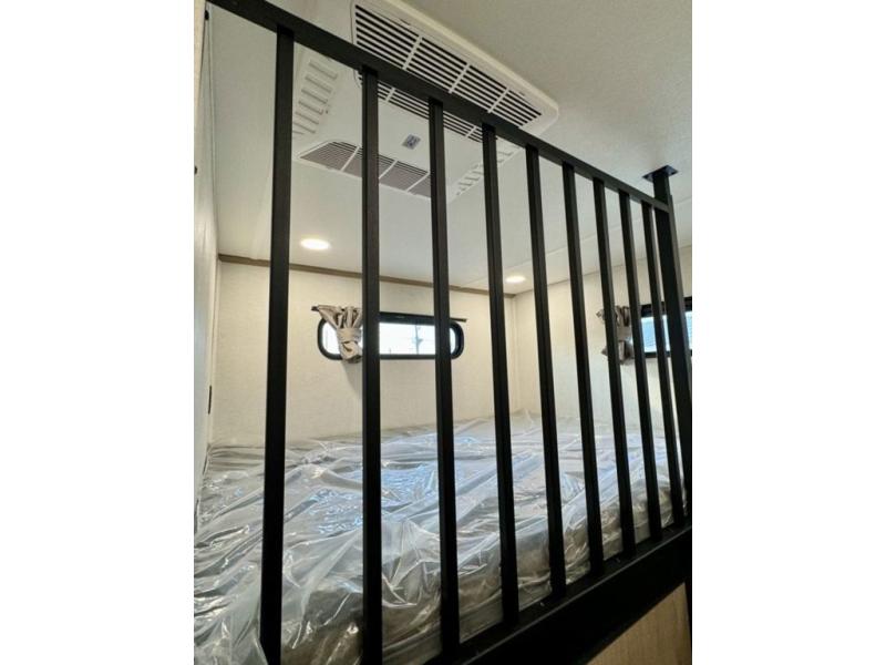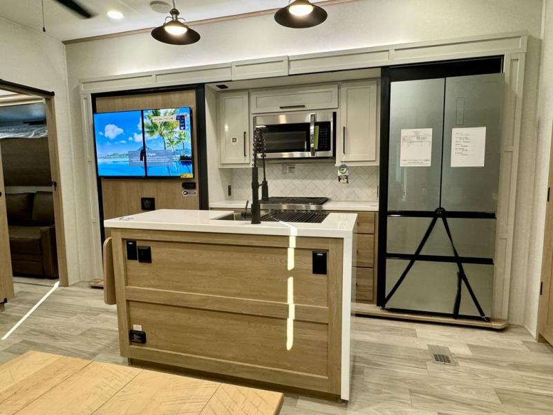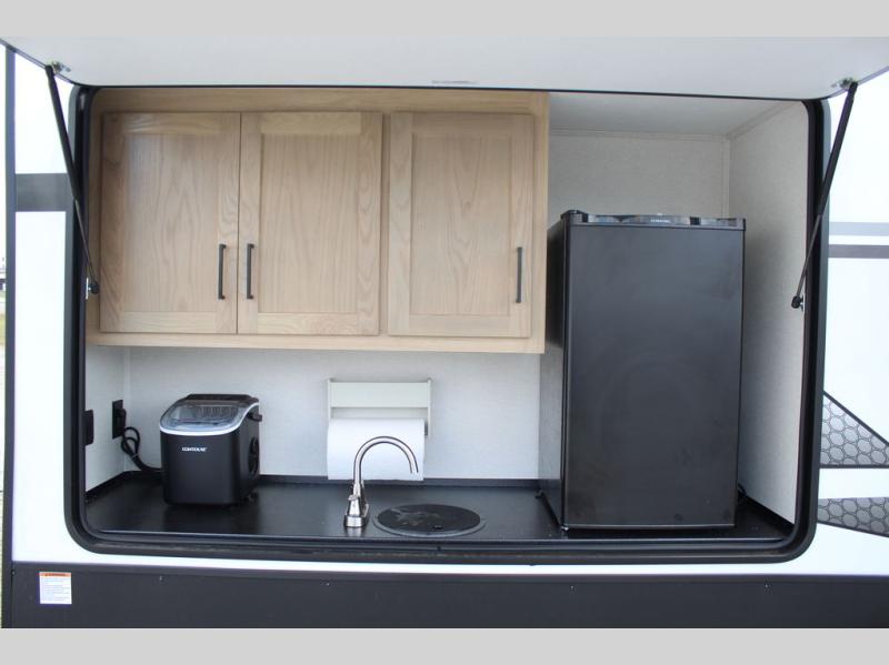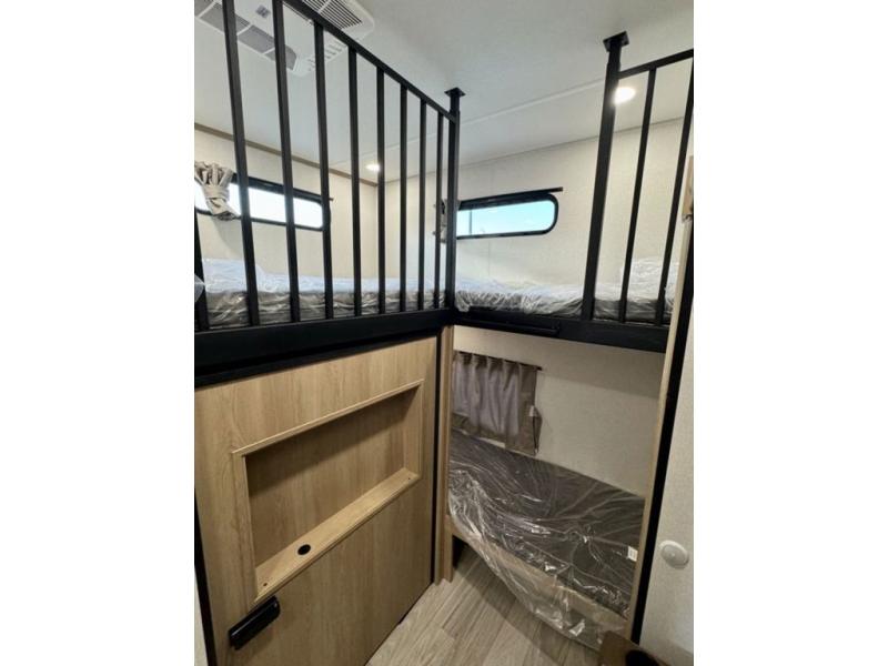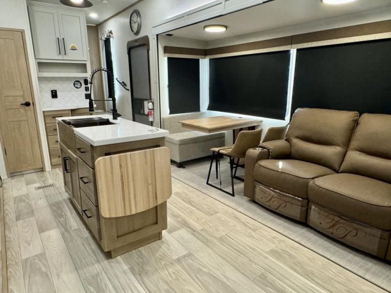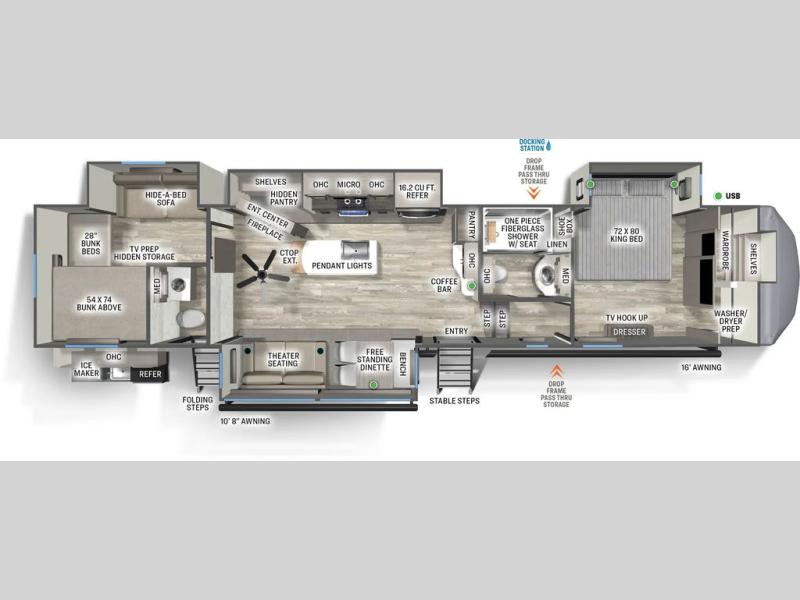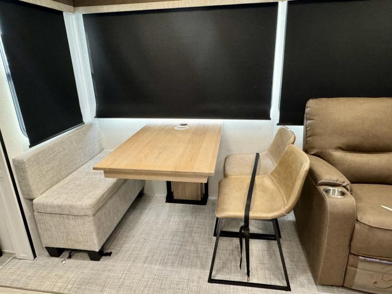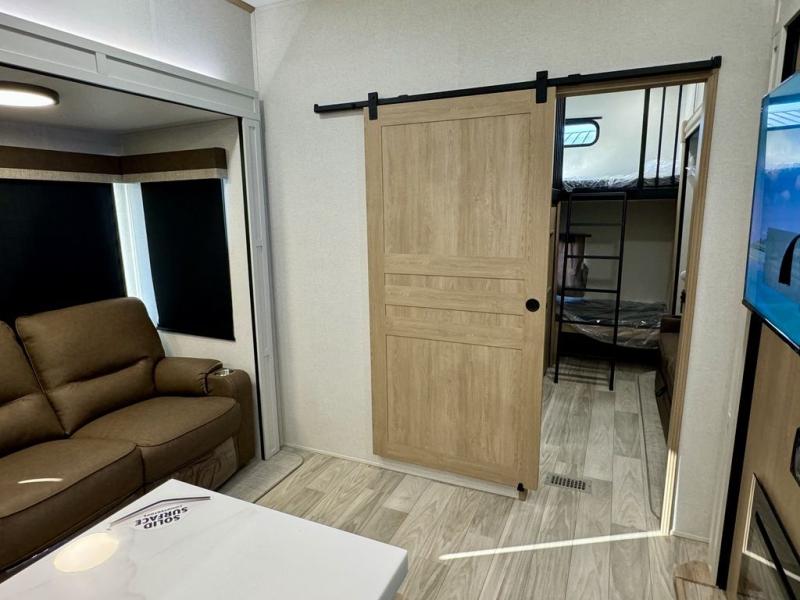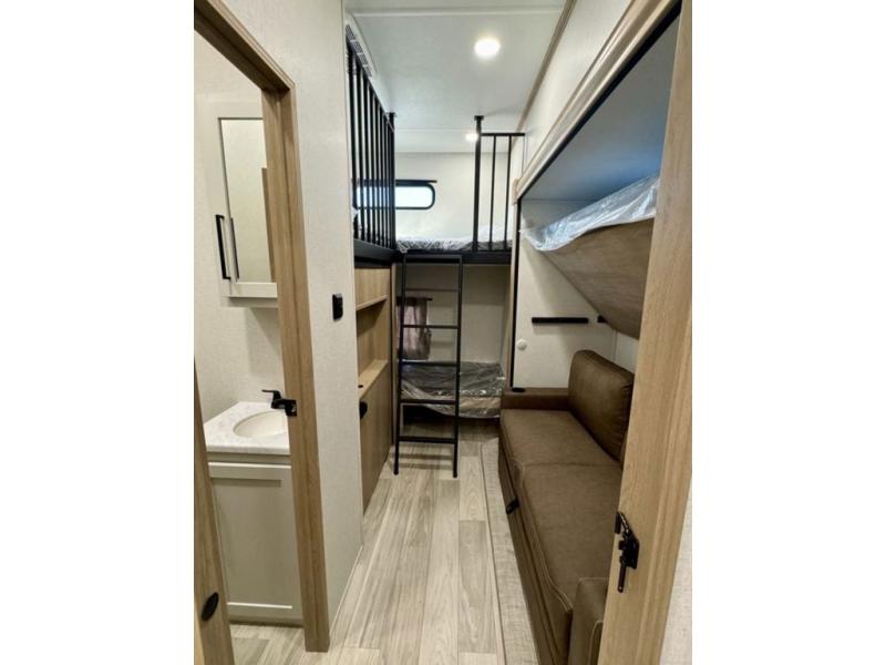 If you're looking for a fifth wheel that will house your whole gang, this is the one! The rear bunkhouse suite includes triple bunks, a hide-a-bed sofa, plus a half bath with one of the dual entry doors to the unit; how convenient! A front private bedroom will be perfect for the owners, which includes a king bed slide, a large front wardrobe with shelves plus washer and dryer prep, and a dresser with a TV hook up if you want the option to watch movies in bed. Everyone can meet in the combined kitchen and living room in the morning as the chef of your group makes breakfast on the three burner cooktop. There is a free-standing dinette with two chairs and a bench, theater seating, and even a coffee bar where you can set up your own Keurig machine. Outside, you'll enjoy the two power awnings, drop-frame pass-thru storage, and outdoor ice maker and refrigerator plus an overhead cabinet, perfect for snacks!