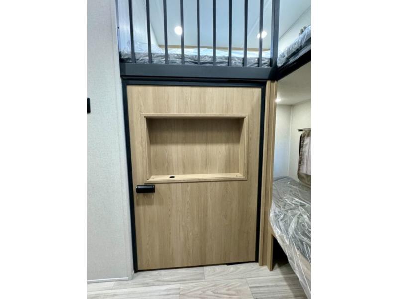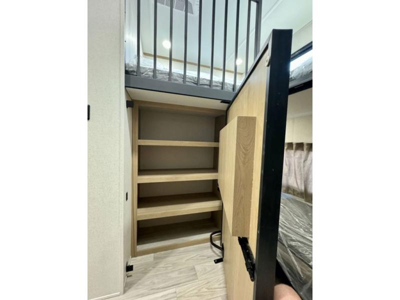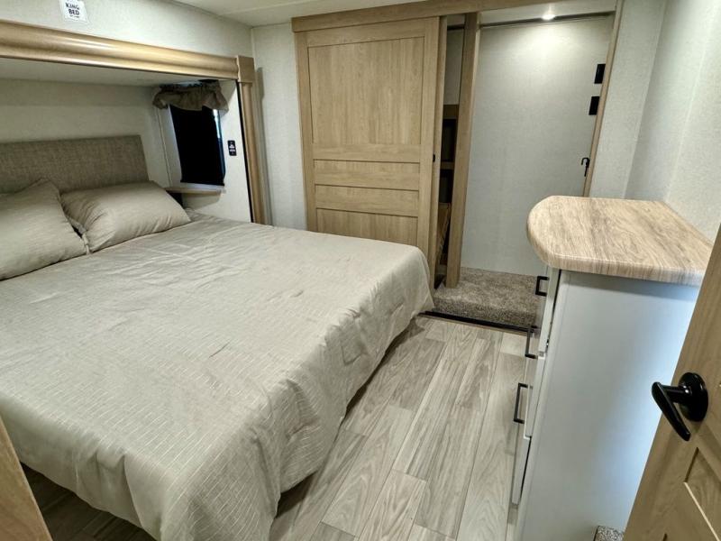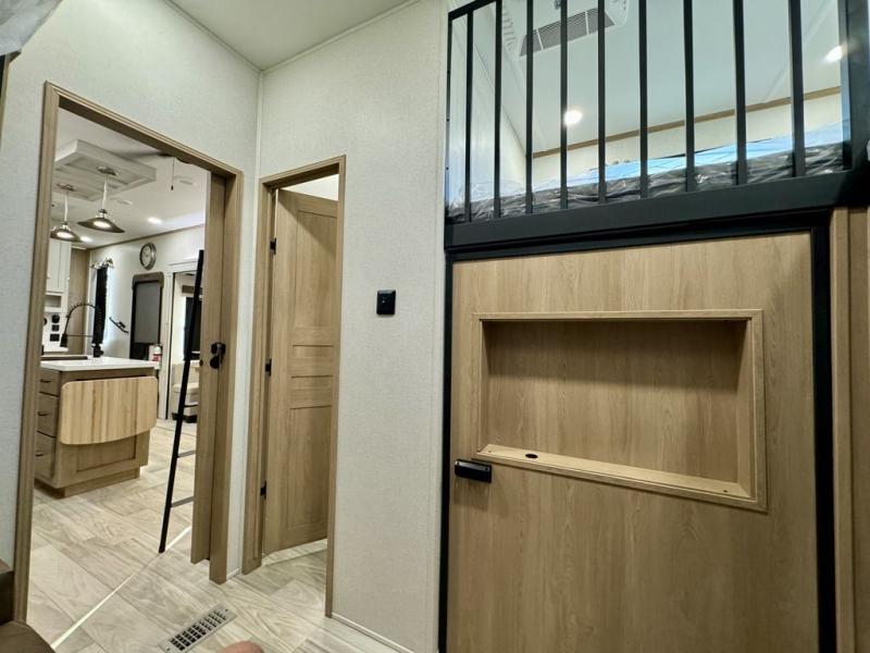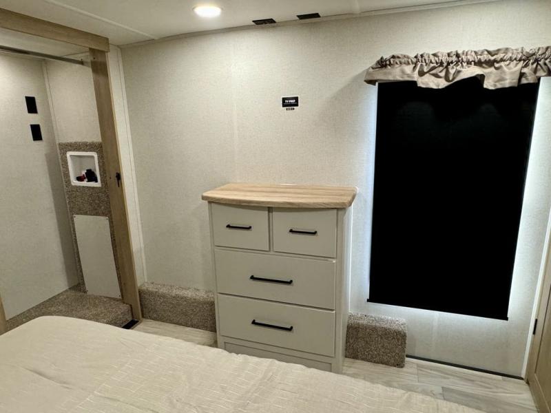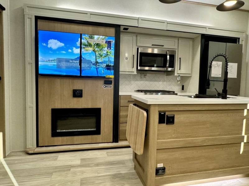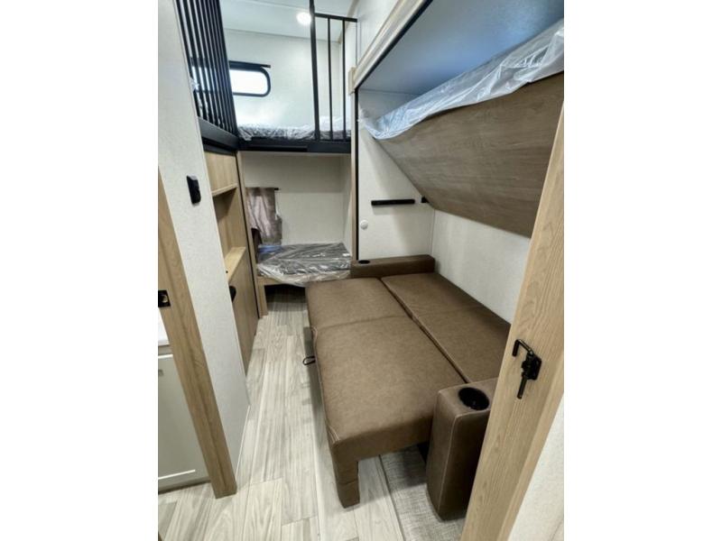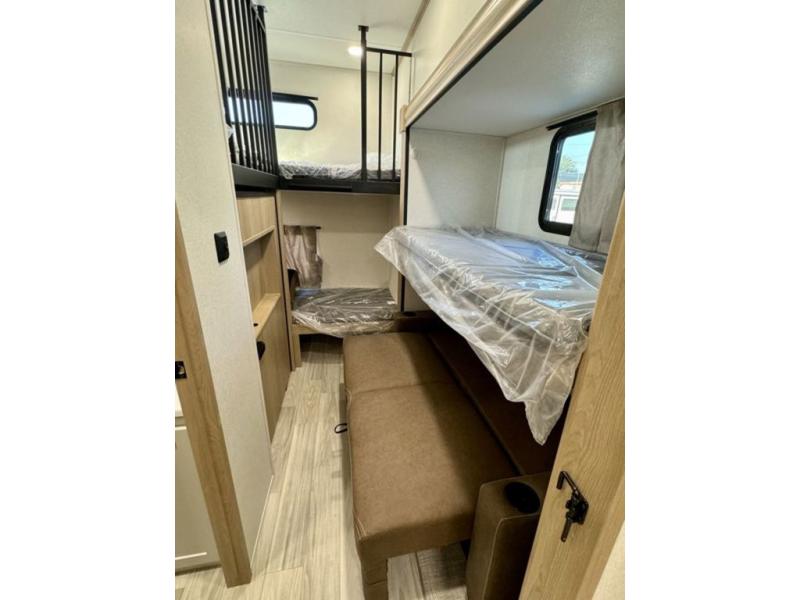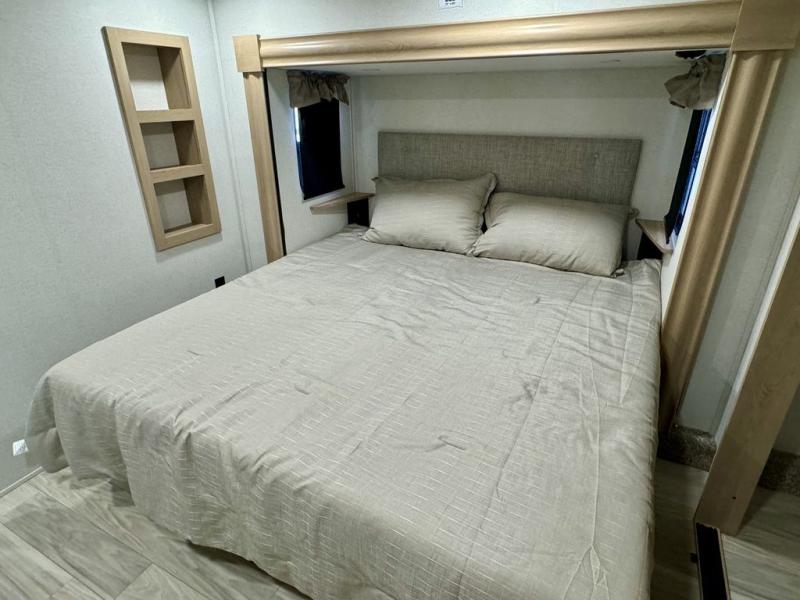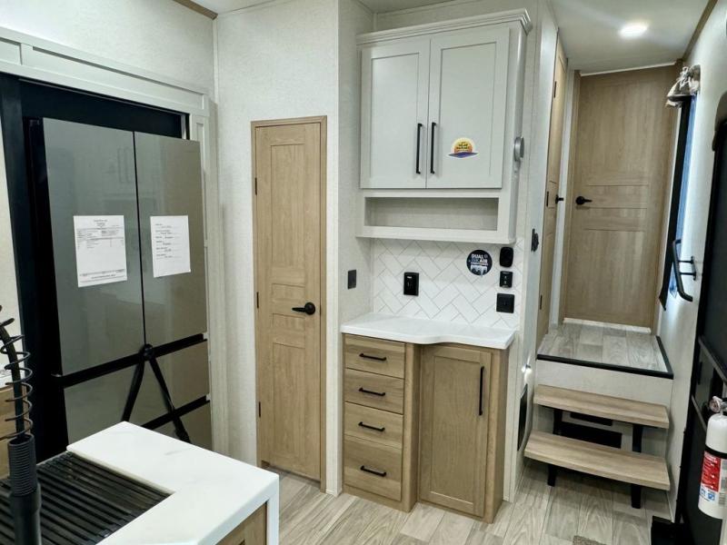 If you're looking for a fifth wheel that will house your whole gang, this is the one! The rear bunkhouse suite includes triple bunks, a hide-a-bed sofa, plus a half bath with one of the dual entry doors to the unit; how convenient! A front private bedroom will be perfect for the owners, which includes a king bed slide, a large front wardrobe with shelves plus washer and dryer prep, and a dresser with a TV hook up if you want the option to watch movies in bed. Everyone can meet in the combined kitchen and living room in the morning as the chef of your group makes breakfast on the three burner cooktop. There is a free-standing dinette with two chairs and a bench, theater seating, and even a coffee bar where you can set up your own Keurig machine. Outside, you'll enjoy the two power awnings, drop-frame pass-thru storage, and outdoor ice maker and refrigerator plus an overhead cabinet, perfect for snacks!