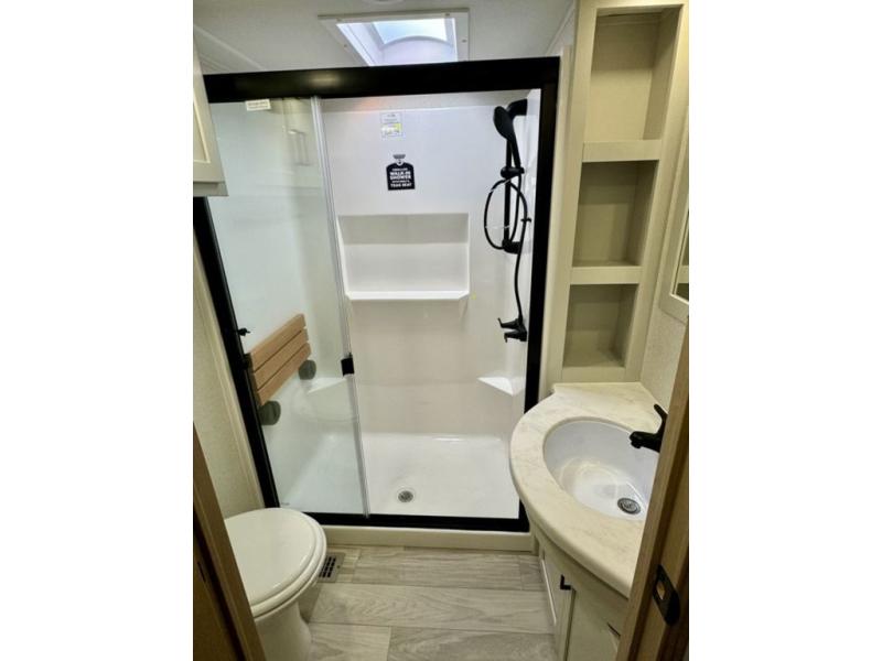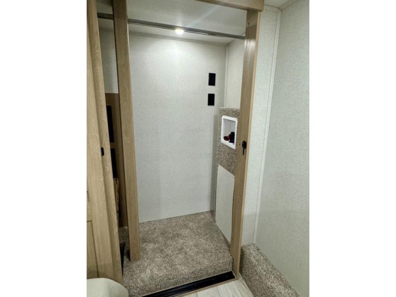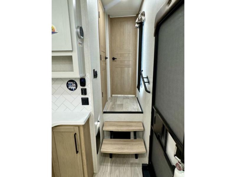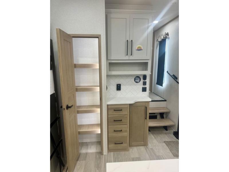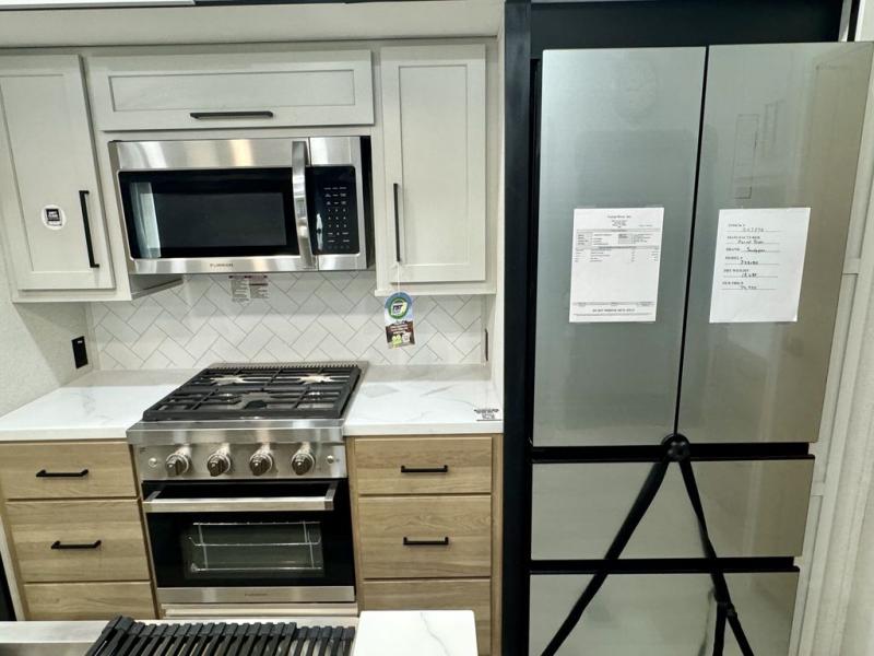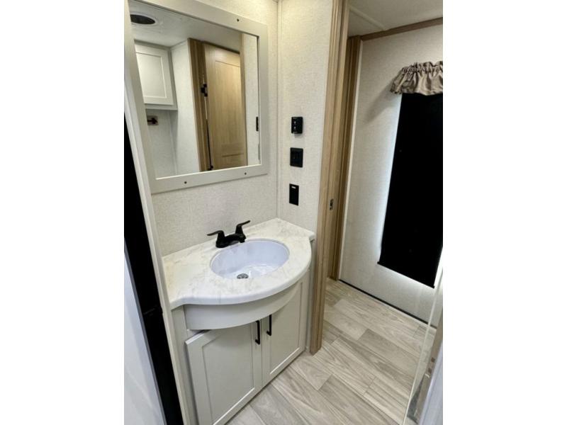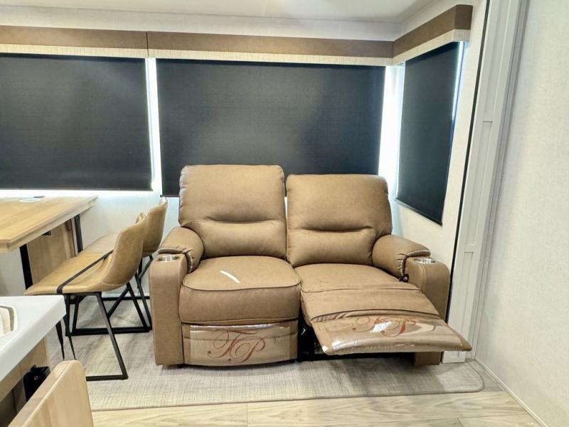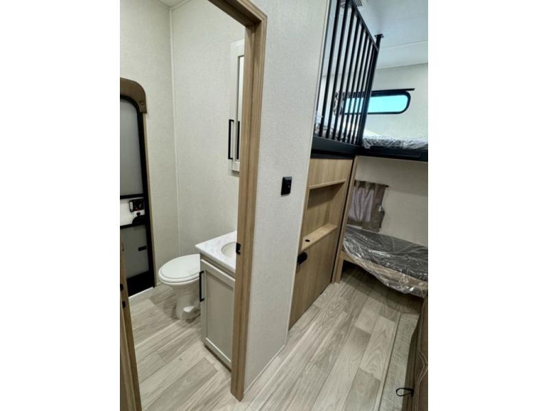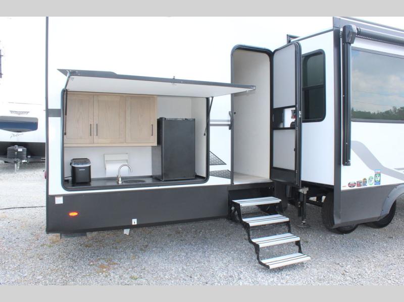 If you're looking for a fifth wheel that will house your whole gang, this is the one! The rear bunkhouse suite includes triple bunks, a hide-a-bed sofa, plus a half bath with one of the dual entry doors to the unit; how convenient! A front private bedroom will be perfect for the owners, which includes a king bed slide, a large front wardrobe with shelves plus washer and dryer prep, and a dresser with a TV hook up if you want the option to watch movies in bed. Everyone can meet in the combined kitchen and living room in the morning as the chef of your group makes breakfast on the three burner cooktop. There is a free-standing dinette with two chairs and a bench, theater seating, and even a coffee bar where you can set up your own Keurig machine. Outside, you'll enjoy the two power awnings, drop-frame pass-thru storage, and outdoor ice maker and refrigerator plus an overhead cabinet, perfect for snacks!