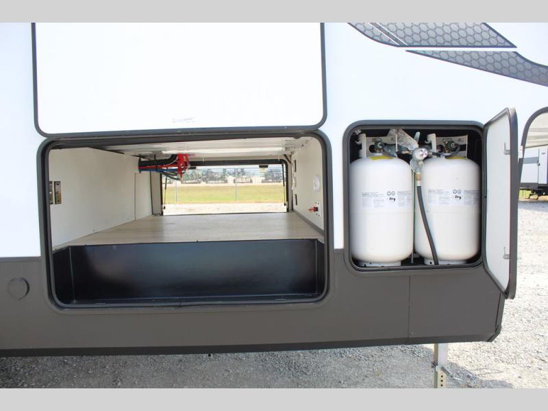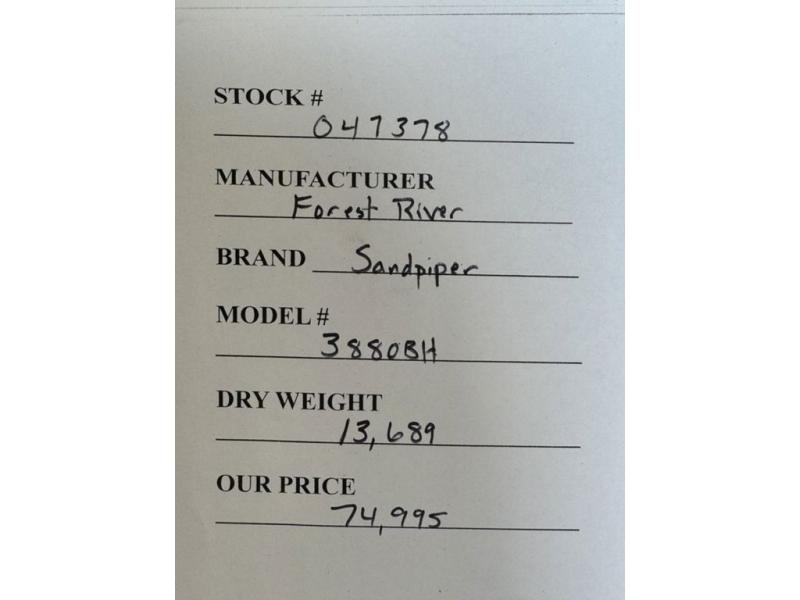 You will find the perfect balance of size, space, features, and luxury with any one of these Forest River Sandpiper fifth wheels! They are constructed with a welded aluminum framed vacuum bonded laminated superstructure, a cambered powder coated frame with rust prohibitor, and a fully enclosed underbelly for added protection against the elements. The large tinted windows come with a 80/20 UV prohibitor or you can choose the optional dual pane windows. Some hassle-free amenities include a 60k BTU on-demand water heater, full coach water filter system, tire pressure monitor system, and an electric leveling system! Inside, you'll enjoy stainless steel appliances, solid surface countertops, Beachside Sundance linoleum, recessed residential lighting, and many more comforts!
