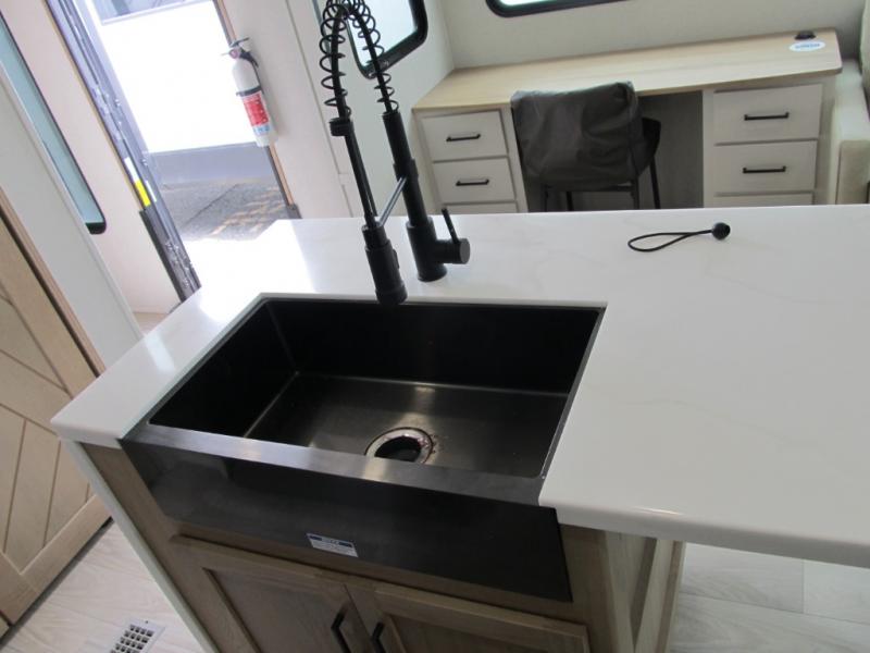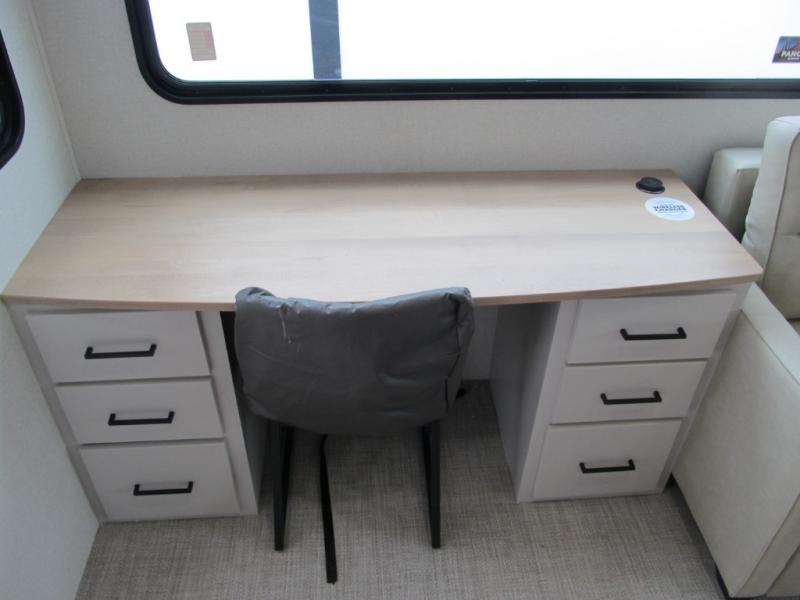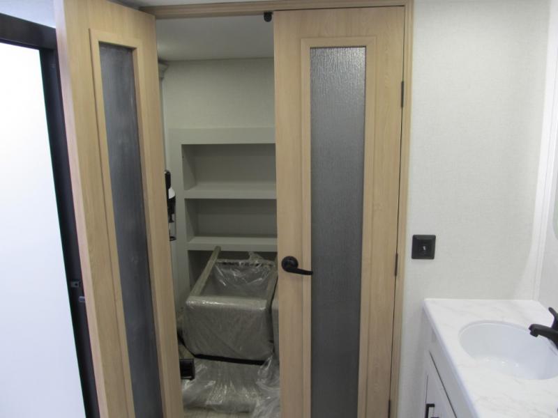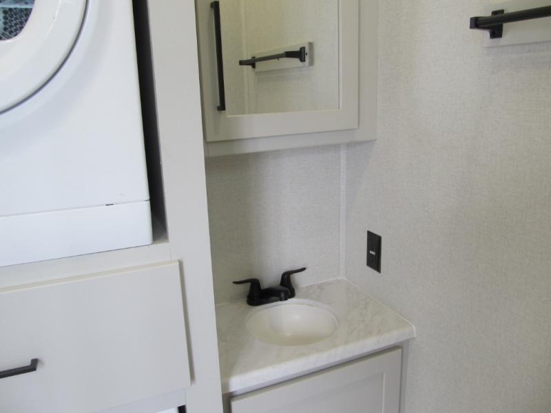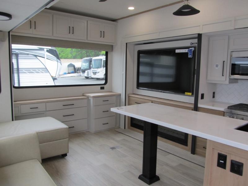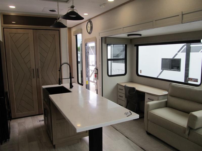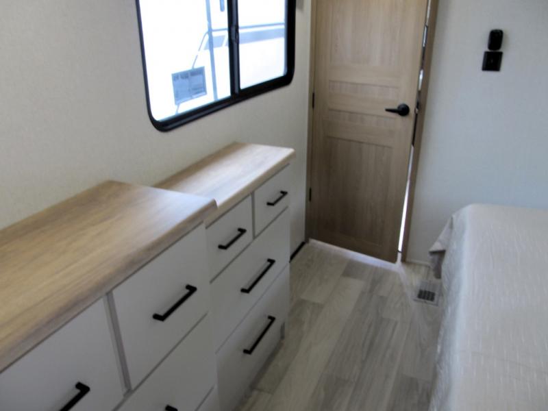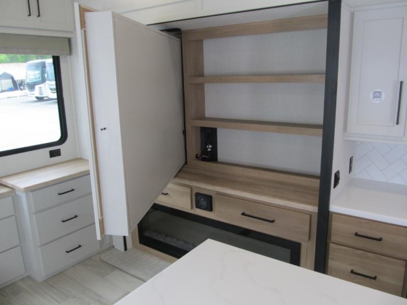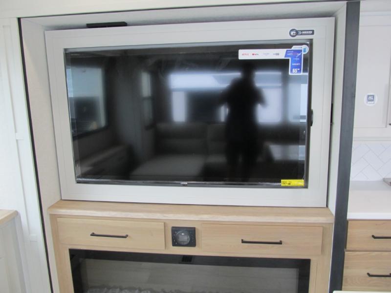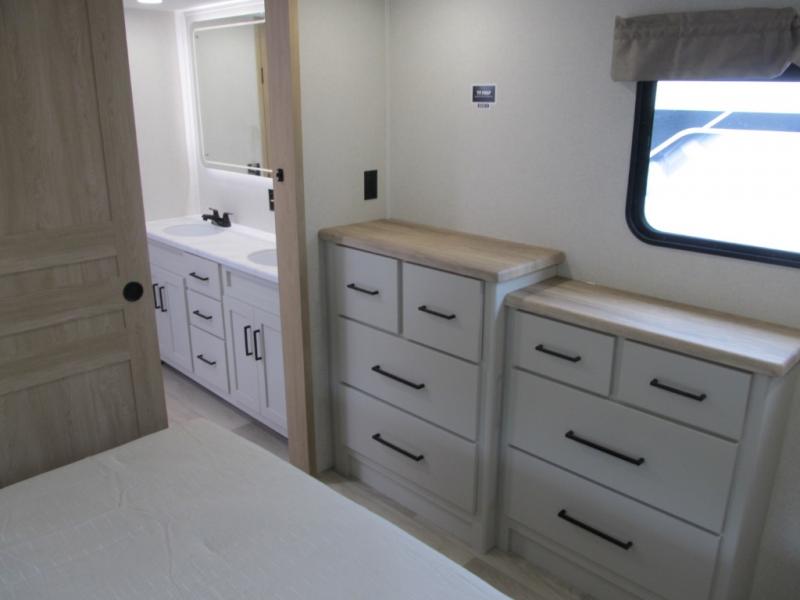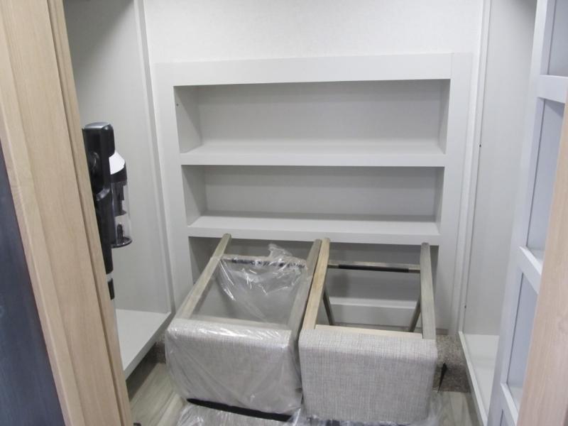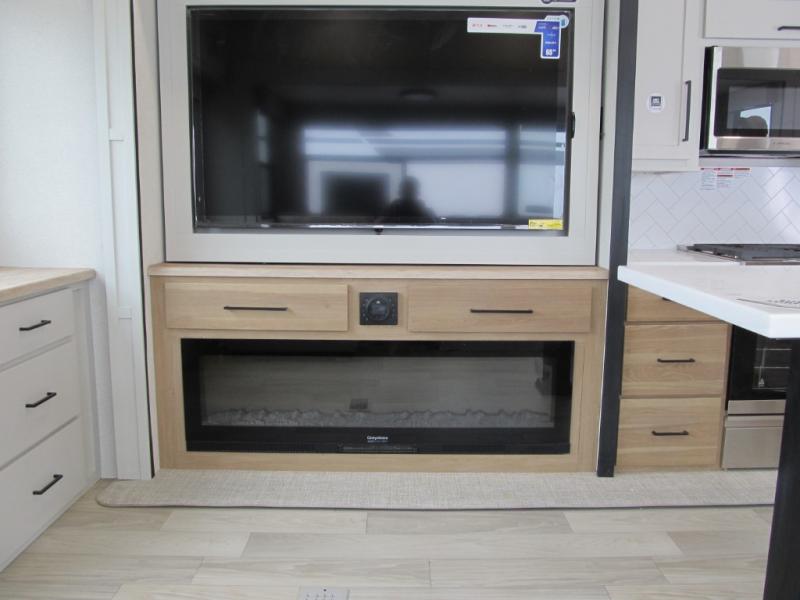 It will be easier than ever to enjoy camping trips in this triple slide out fifth wheel, or even go full-time! The combined kitchen and living area features dual opposing slides for ample space, an L-shaped sofa with a chaise lounge, and a fireplace with a hidden pantry behind for snacks! A desk with a chair and a USB port will provide a place to work if you need to send some emails, and the large kitchen island will give you ample room to prep dinner when you get hungry. There are also pendant lights here, along with a waterfall edge and barstools for dining space. The mid-coach half bath includes a toilet, sink, plus washer and dryer prep, giving you the option to make this the perfect laundry room! The master bedroom up front may be your favorite place to unwind in this unit. There is a king bed slide, a small dresser plus a tall dresser, and a TV hookup if you want the option to watch movies in bed. And you'll be wowed by the front master bedroom with its fiberglass shower with a seat, dual bath sinks, and large walk-in closet!