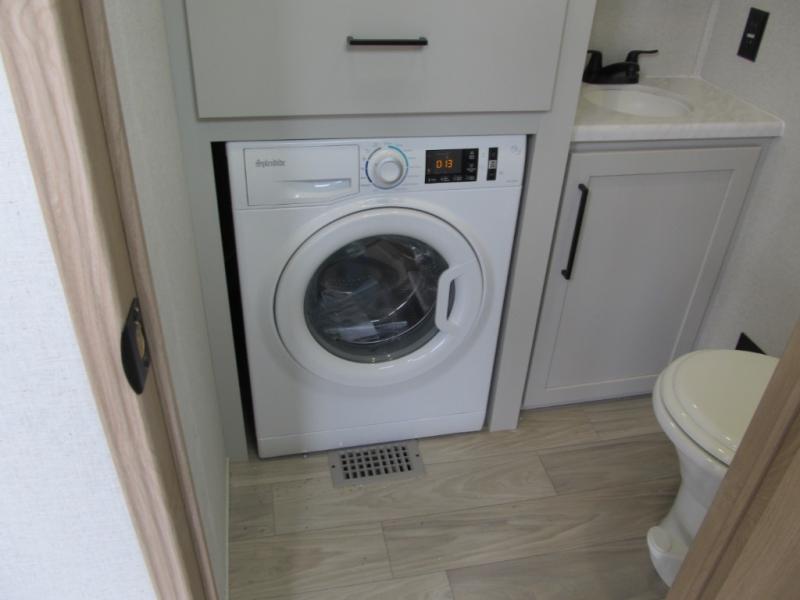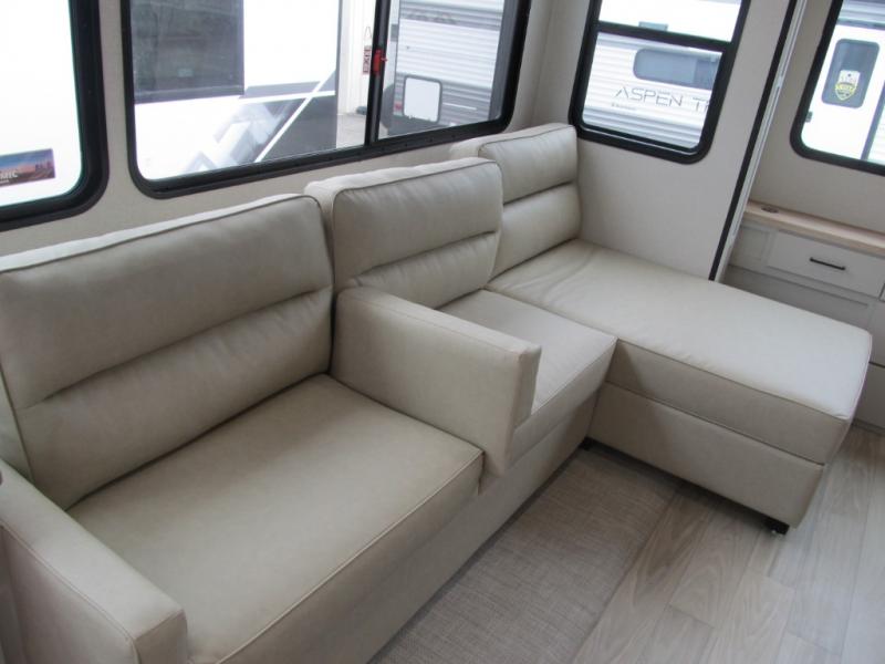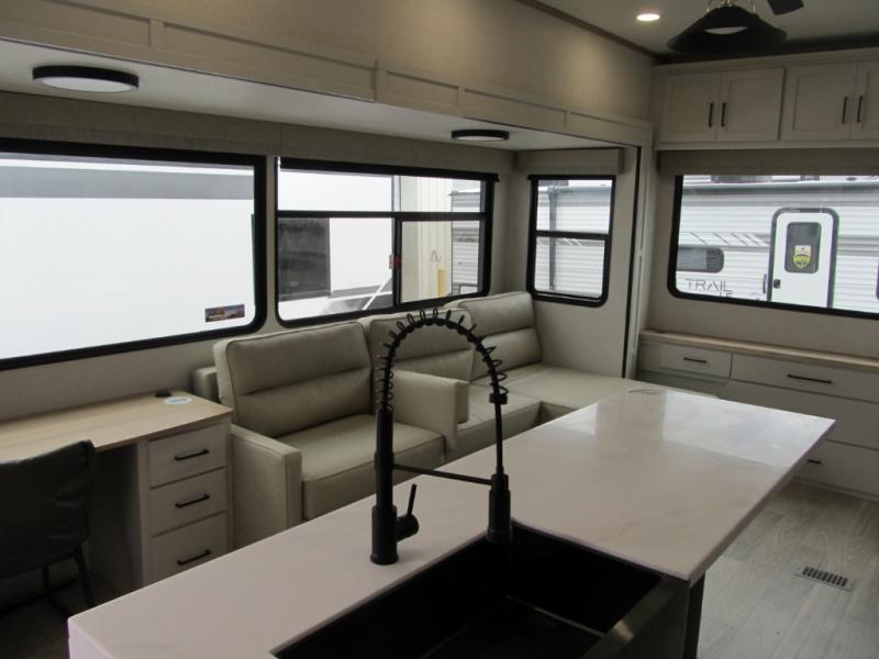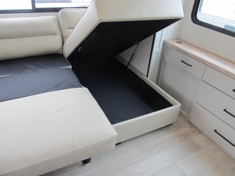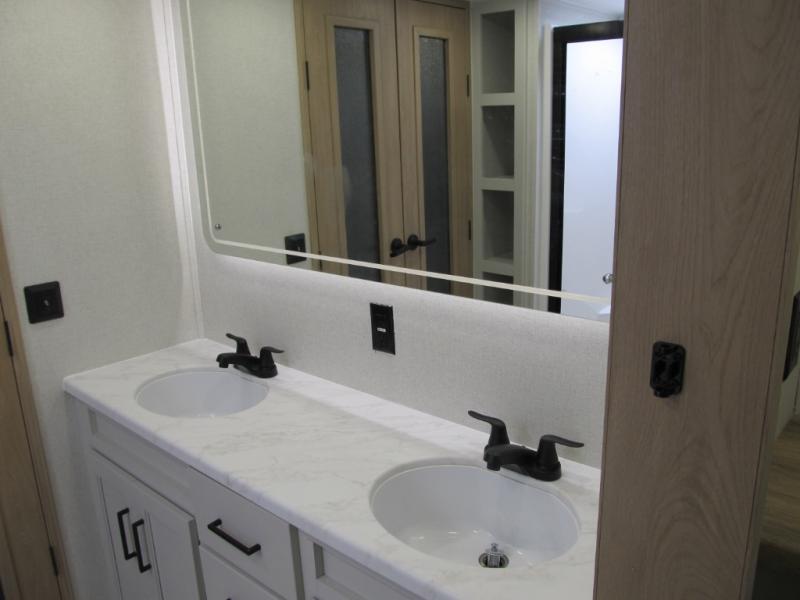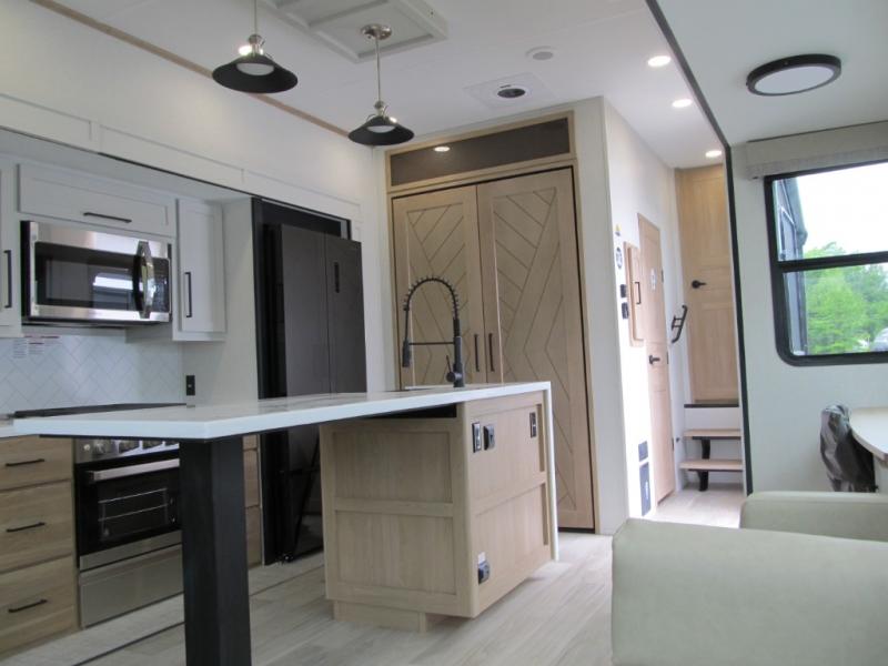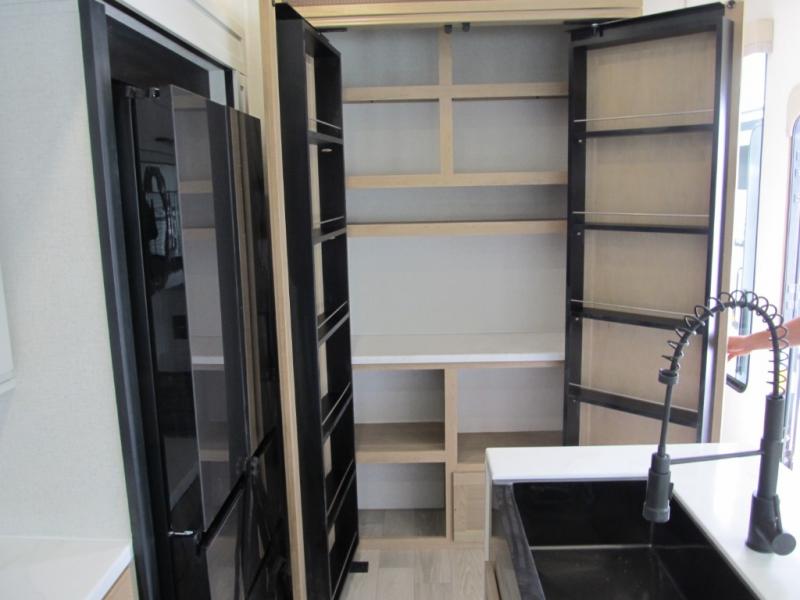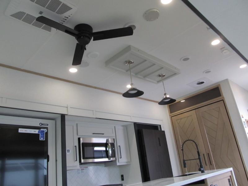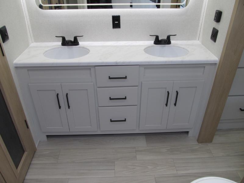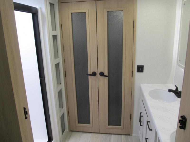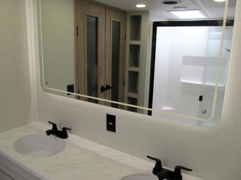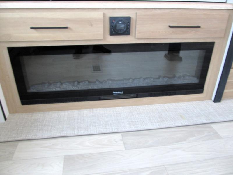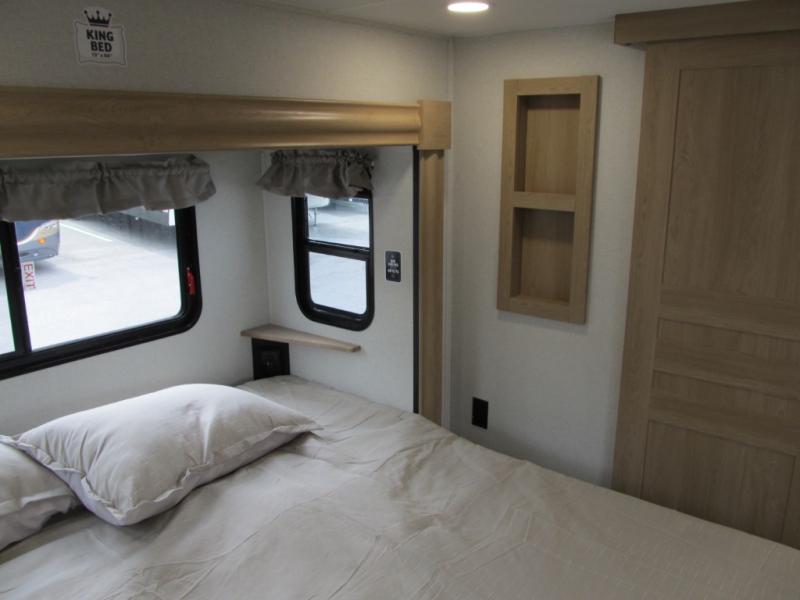 It will be easier than ever to enjoy camping trips in this triple slide out fifth wheel, or even go full-time! The combined kitchen and living area features dual opposing slides for ample space, an L-shaped sofa with a chaise lounge, and a fireplace with a hidden pantry behind for snacks! A desk with a chair and a USB port will provide a place to work if you need to send some emails, and the large kitchen island will give you ample room to prep dinner when you get hungry. There are also pendant lights here, along with a waterfall edge and barstools for dining space. The mid-coach half bath includes a toilet, sink, plus washer and dryer prep, giving you the option to make this the perfect laundry room! The master bedroom up front may be your favorite place to unwind in this unit. There is a king bed slide, a small dresser plus a tall dresser, and a TV hookup if you want the option to watch movies in bed. And you'll be wowed by the front master bedroom with its fiberglass shower with a seat, dual bath sinks, and large walk-in closet!