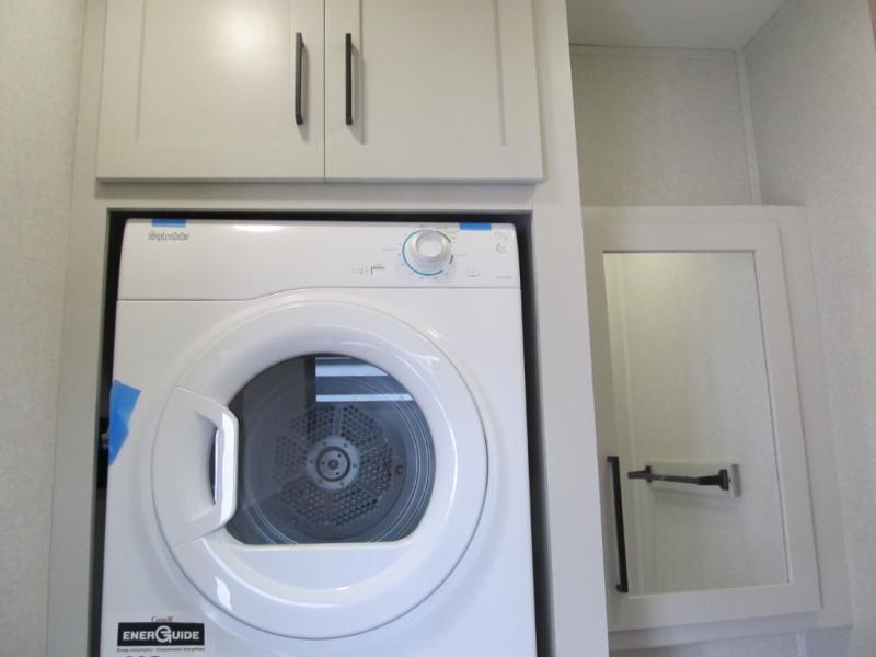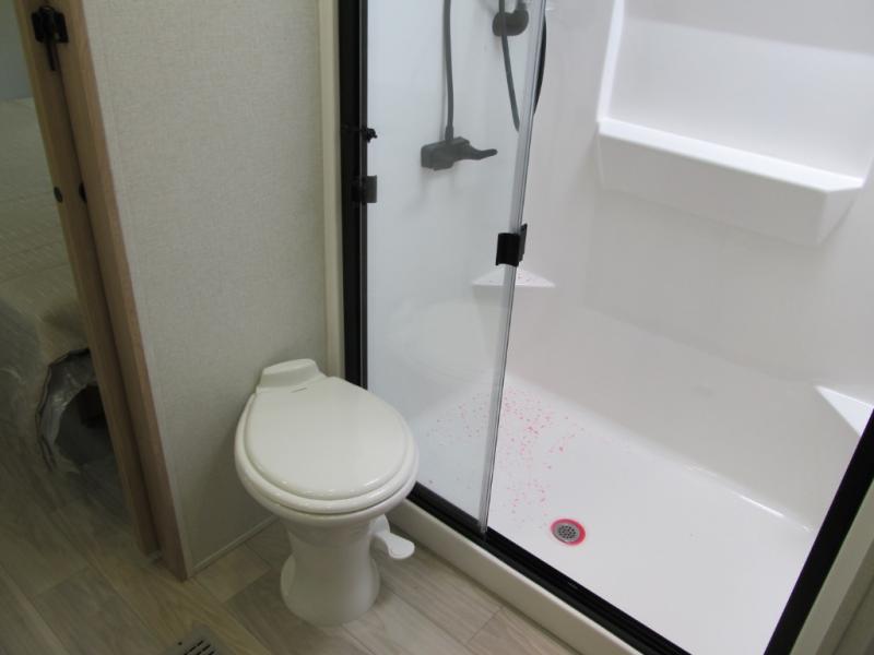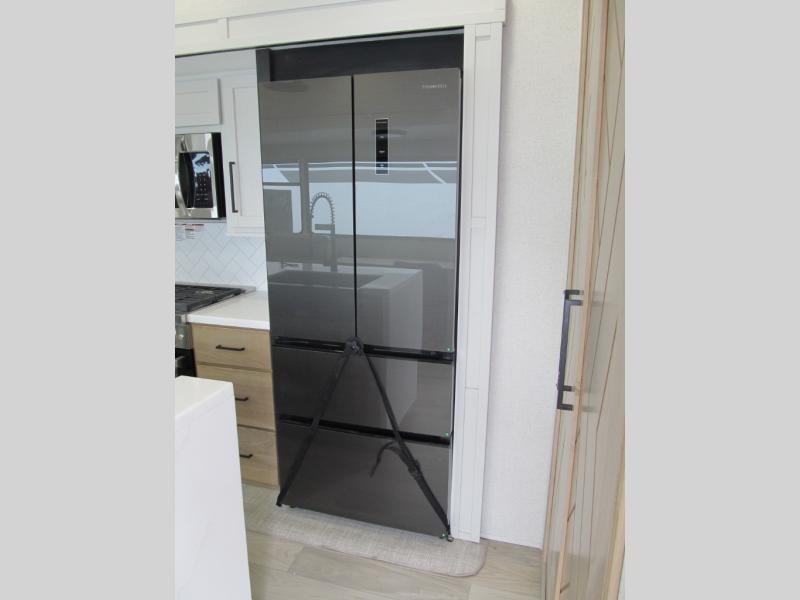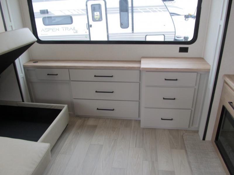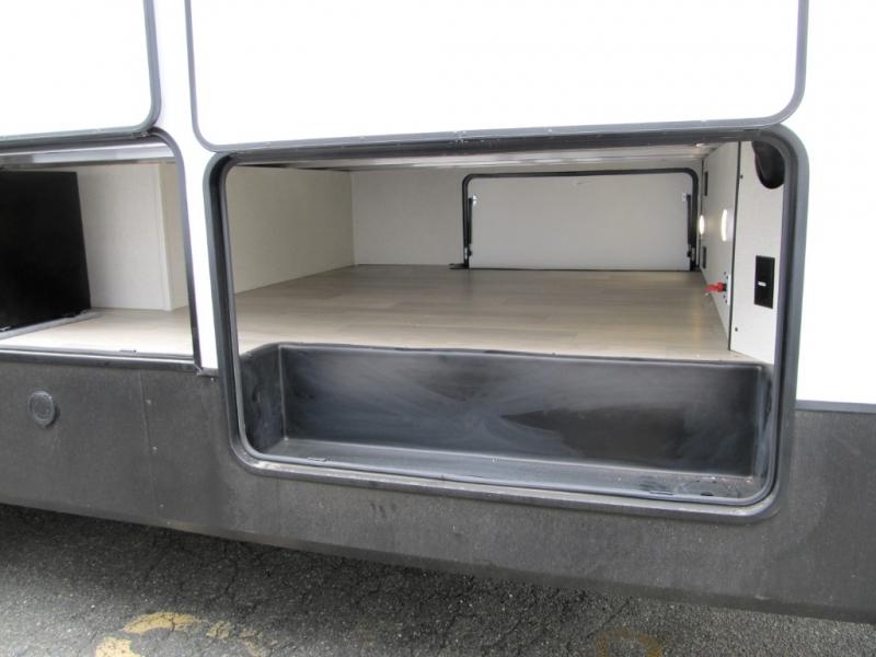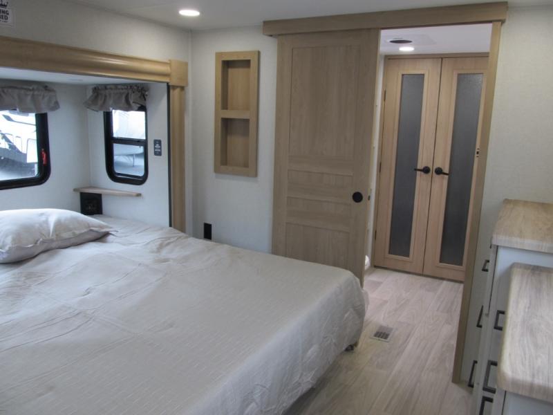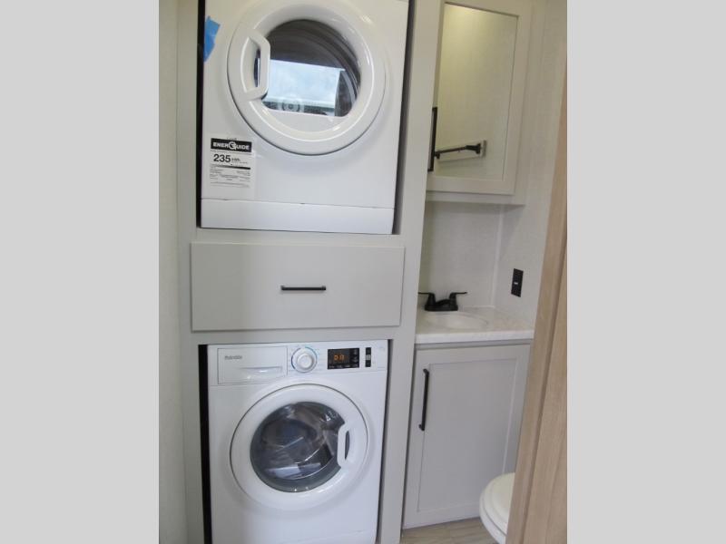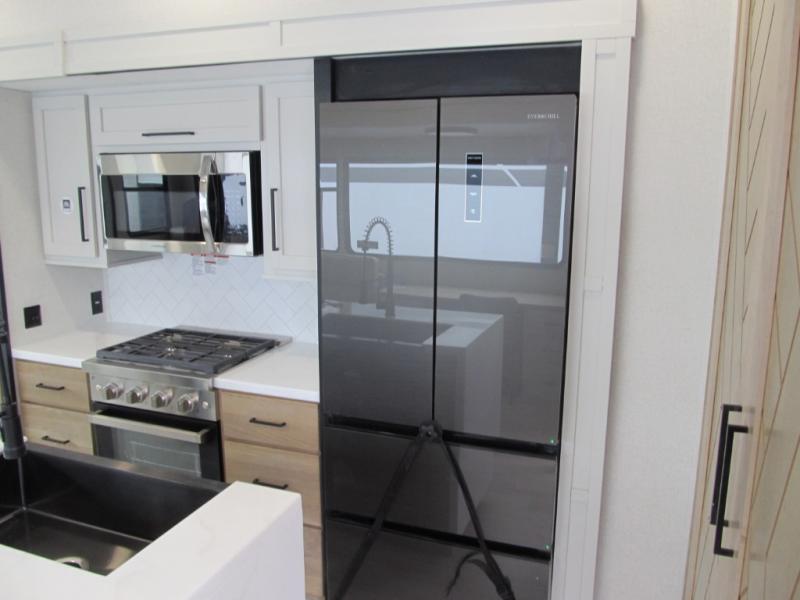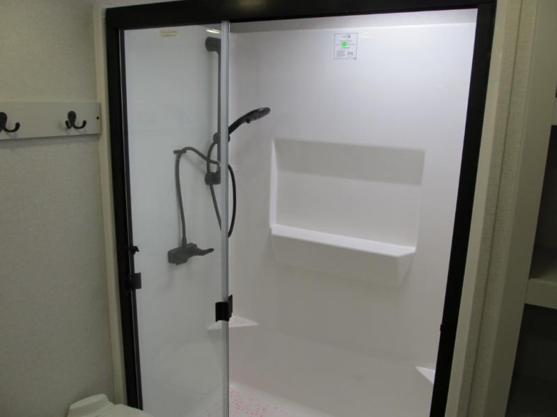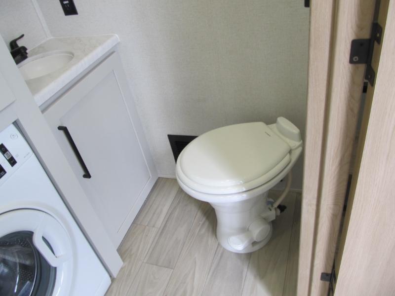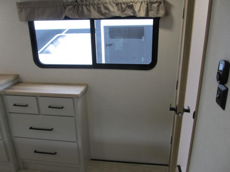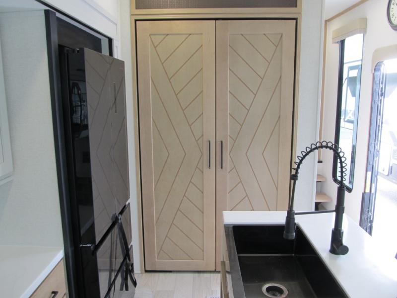 It will be easier than ever to enjoy camping trips in this triple slide out fifth wheel, or even go full-time! The combined kitchen and living area features dual opposing slides for ample space, an L-shaped sofa with a chaise lounge, and a fireplace with a hidden pantry behind for snacks! A desk with a chair and a USB port will provide a place to work if you need to send some emails, and the large kitchen island will give you ample room to prep dinner when you get hungry. There are also pendant lights here, along with a waterfall edge and barstools for dining space. The mid-coach half bath includes a toilet, sink, plus washer and dryer prep, giving you the option to make this the perfect laundry room! The master bedroom up front may be your favorite place to unwind in this unit. There is a king bed slide, a small dresser plus a tall dresser, and a TV hookup if you want the option to watch movies in bed. And you'll be wowed by the front master bedroom with its fiberglass shower with a seat, dual bath sinks, and large walk-in closet!