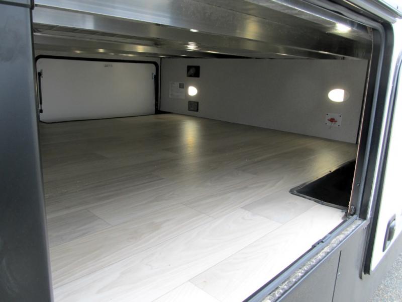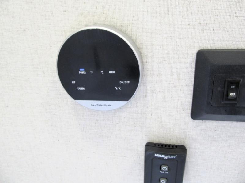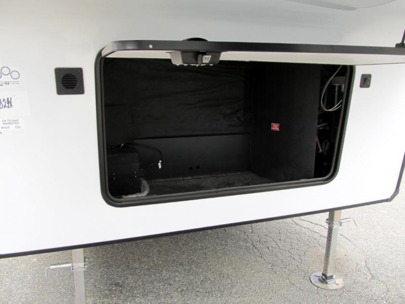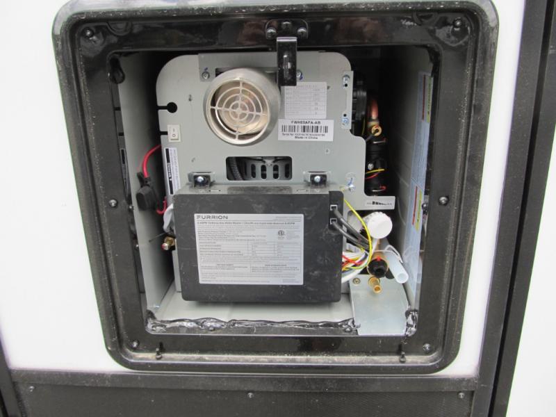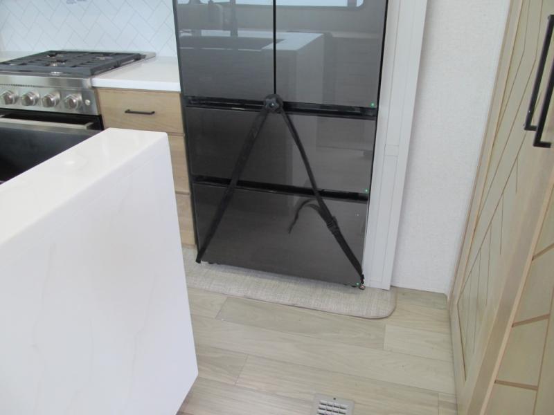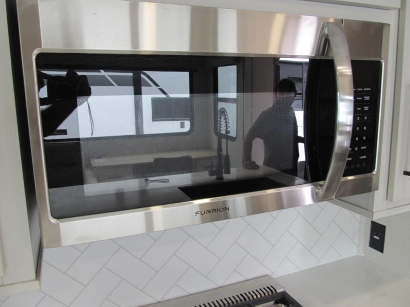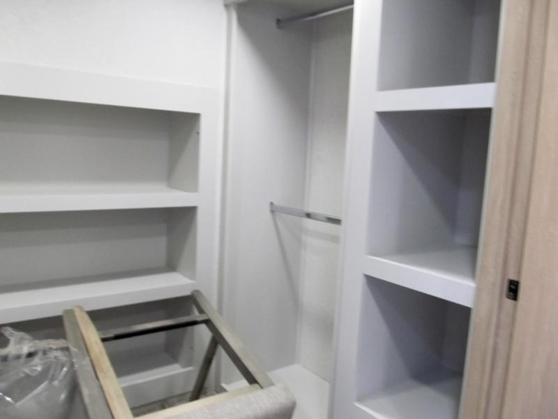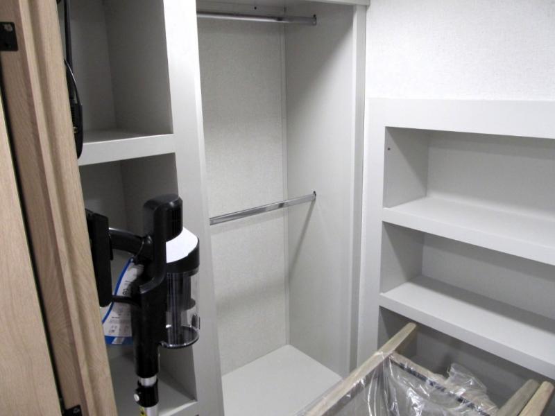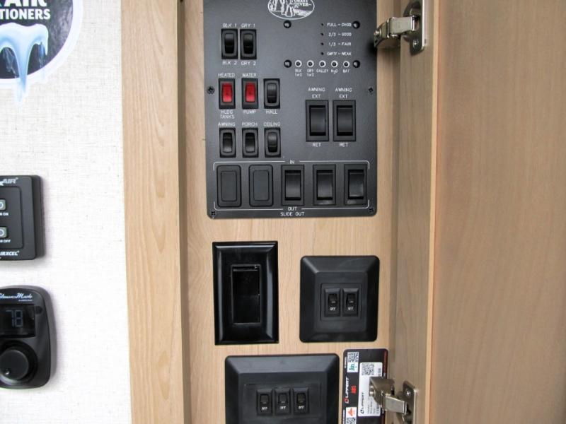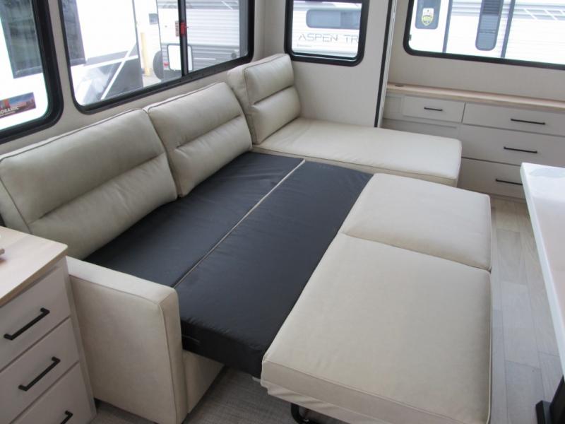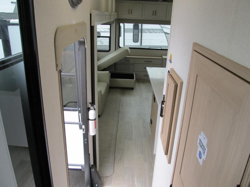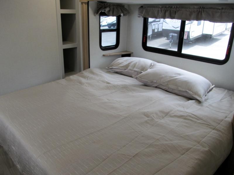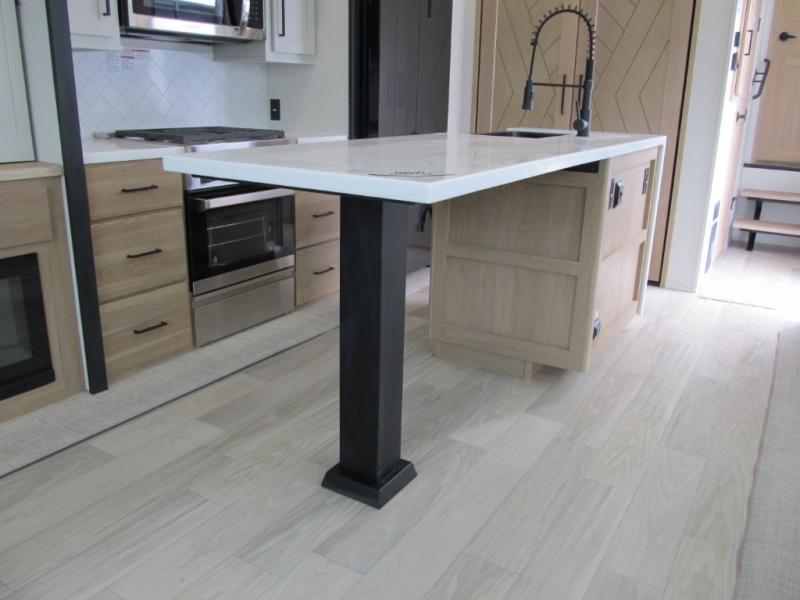 It will be easier than ever to enjoy camping trips in this triple slide out fifth wheel, or even go full-time! The combined kitchen and living area features dual opposing slides for ample space, an L-shaped sofa with a chaise lounge, and a fireplace with a hidden pantry behind for snacks! A desk with a chair and a USB port will provide a place to work if you need to send some emails, and the large kitchen island will give you ample room to prep dinner when you get hungry. There are also pendant lights here, along with a waterfall edge and barstools for dining space. The mid-coach half bath includes a toilet, sink, plus washer and dryer prep, giving you the option to make this the perfect laundry room! The master bedroom up front may be your favorite place to unwind in this unit. There is a king bed slide, a small dresser plus a tall dresser, and a TV hookup if you want the option to watch movies in bed. And you'll be wowed by the front master bedroom with its fiberglass shower with a seat, dual bath sinks, and large walk-in closet!