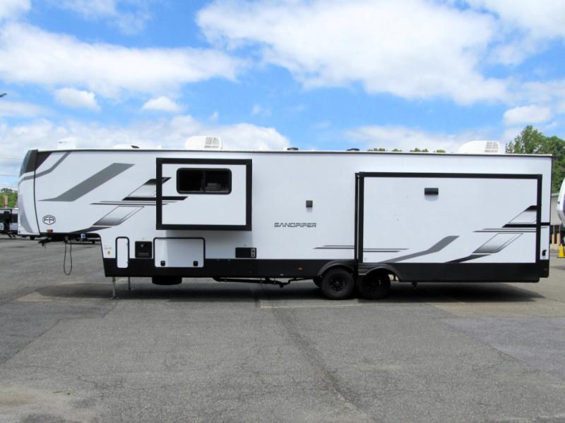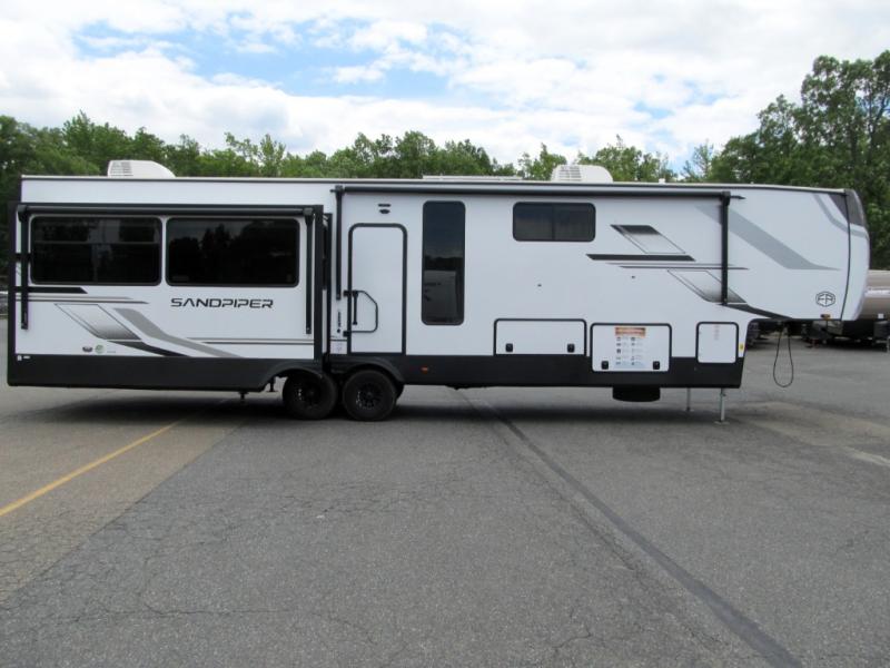 You will find the perfect balance of size, space, features, and luxury with any one of these Forest River Sandpiper fifth wheels! They are constructed with a welded aluminum framed vacuum bonded laminated superstructure, a cambered powder coated frame with rust prohibitor, and a fully enclosed underbelly for added protection against the elements. The large tinted windows come with a 80/20 UV prohibitor or you can choose the optional dual pane windows. Some hassle-free amenities include a 60k BTU on-demand water heater, full coach water filter system, tire pressure monitor system, and an electric leveling system! Inside, you'll enjoy stainless steel appliances, solid surface countertops, Beachside Sundance linoleum, recessed residential lighting, and many more comforts!
