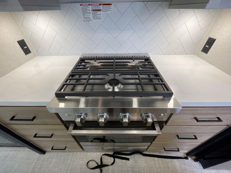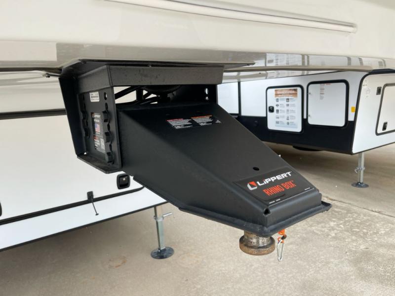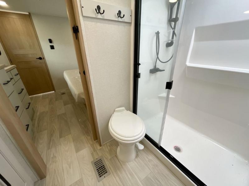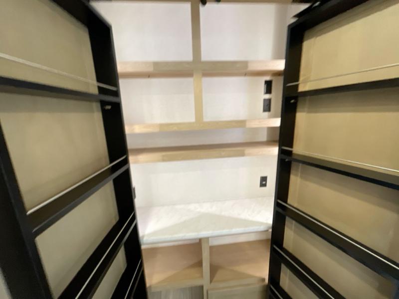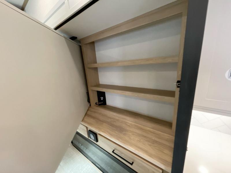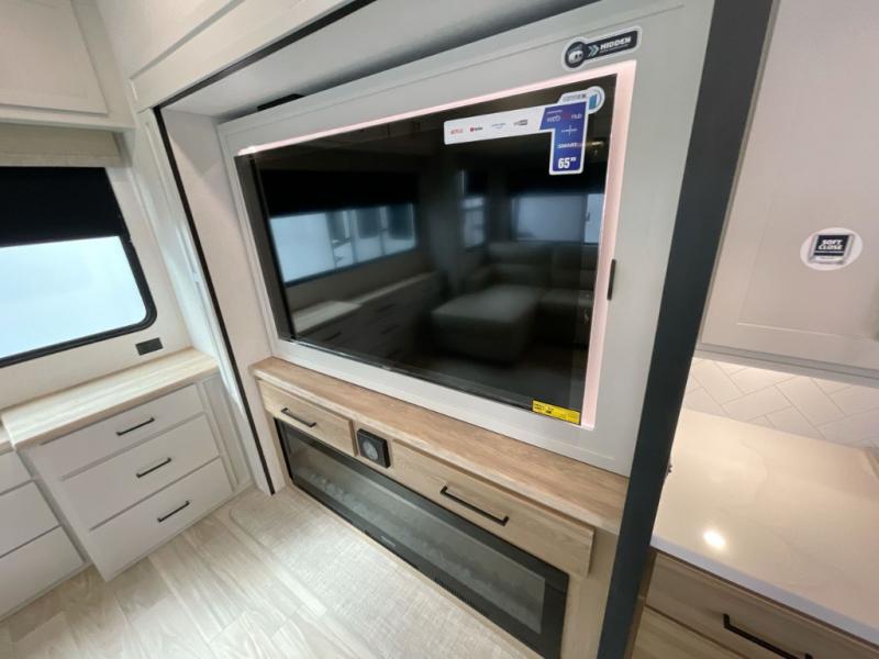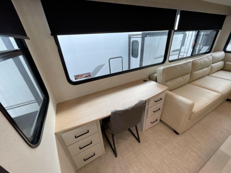 It will be easier than ever to enjoy camping trips in this triple slide out fifth wheel, or even go full-time! The combined kitchen and living area features dual opposing slides for ample space, an L-shaped sofa with a chaise lounge, and a fireplace with a hidden pantry behind for snacks! A desk with a chair and a USB port will provide a place to work if you need to send some emails, and the large kitchen island will give you ample room to prep dinner when you get hungry. There are also pendant lights here, along with a waterfall edge and barstools for dining space. The mid-coach half bath includes a toilet, sink, plus washer and dryer prep, giving you the option to make this the perfect laundry room! The master bedroom up front may be your favorite place to unwind in this unit. There is a king bed slide, a small dresser plus a tall dresser, and a TV hookup if you want the option to watch movies in bed. And you'll be wowed by the front master bedroom with its fiberglass shower with a seat, dual bath sinks, and large walk-in closet!