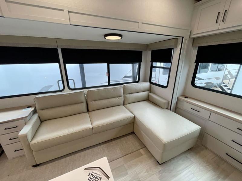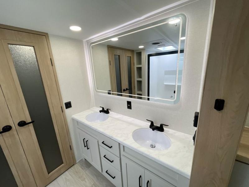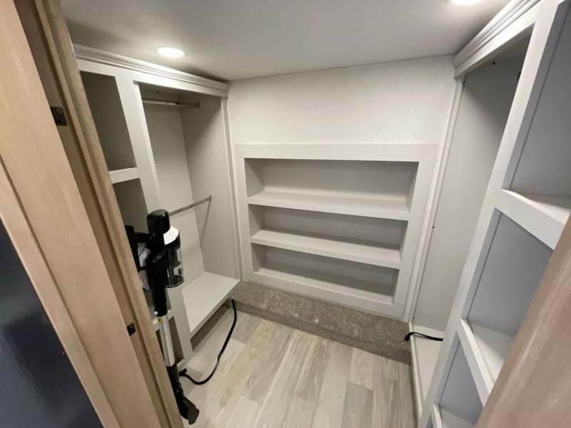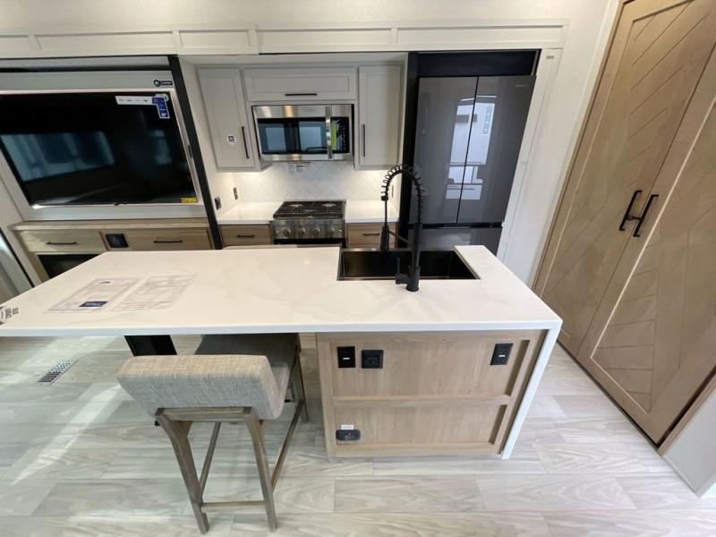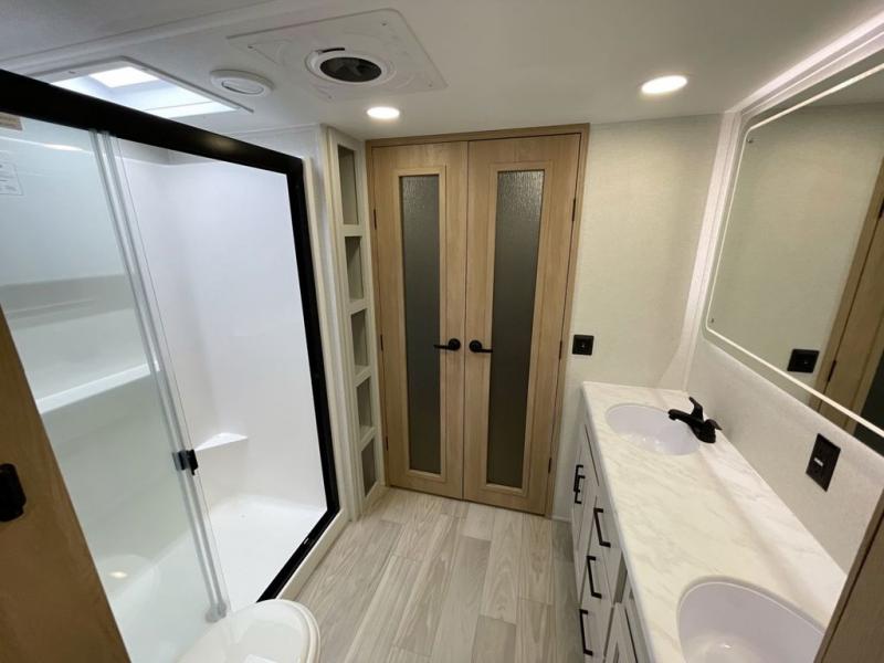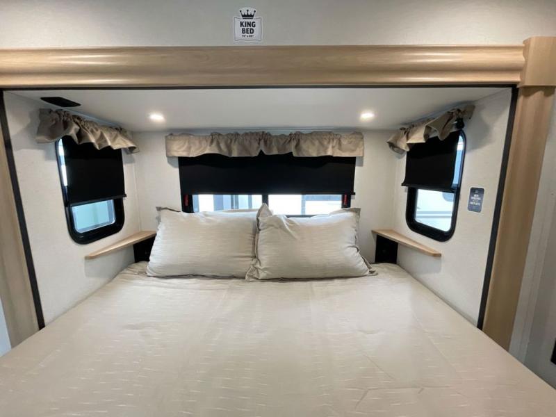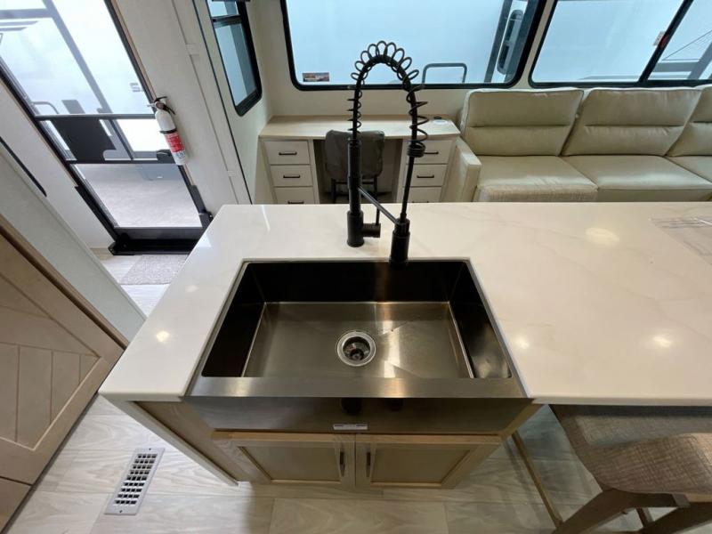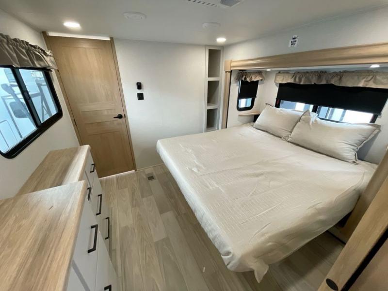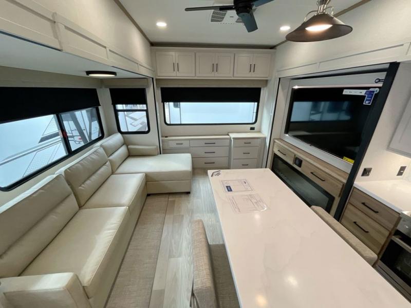 It will be easier than ever to enjoy camping trips in this triple slide out fifth wheel, or even go full-time! The combined kitchen and living area features dual opposing slides for ample space, an L-shaped sofa with a chaise lounge, and a fireplace with a hidden pantry behind for snacks! A desk with a chair and a USB port will provide a place to work if you need to send some emails, and the large kitchen island will give you ample room to prep dinner when you get hungry. There are also pendant lights here, along with a waterfall edge and barstools for dining space. The mid-coach half bath includes a toilet, sink, plus washer and dryer prep, giving you the option to make this the perfect laundry room! The master bedroom up front may be your favorite place to unwind in this unit. There is a king bed slide, a small dresser plus a tall dresser, and a TV hookup if you want the option to watch movies in bed. And you'll be wowed by the front master bedroom with its fiberglass shower with a seat, dual bath sinks, and large walk-in closet!