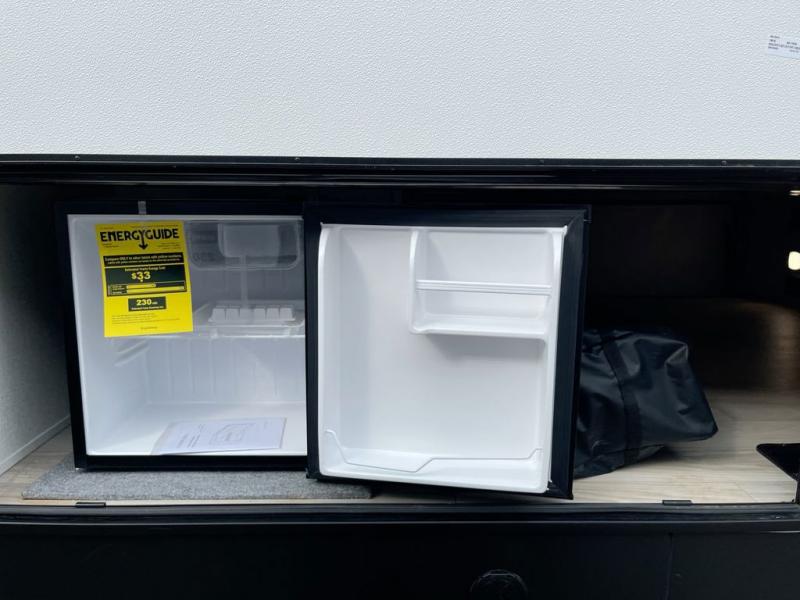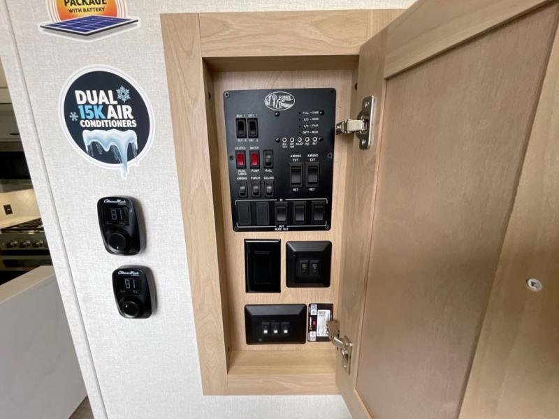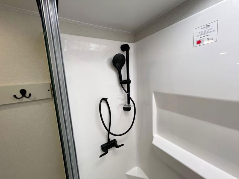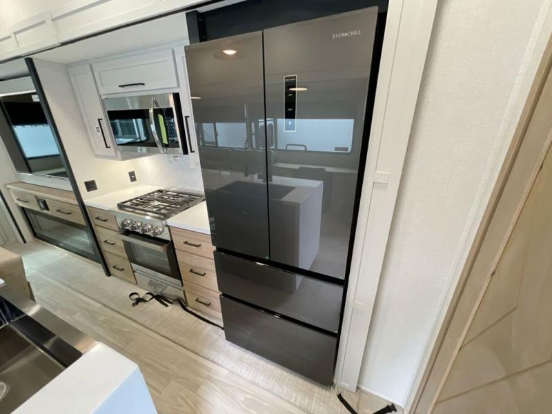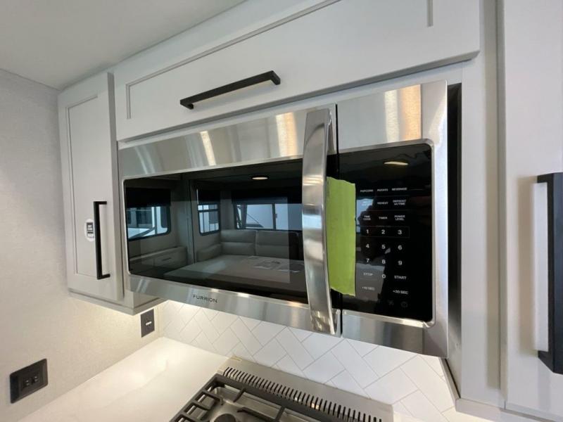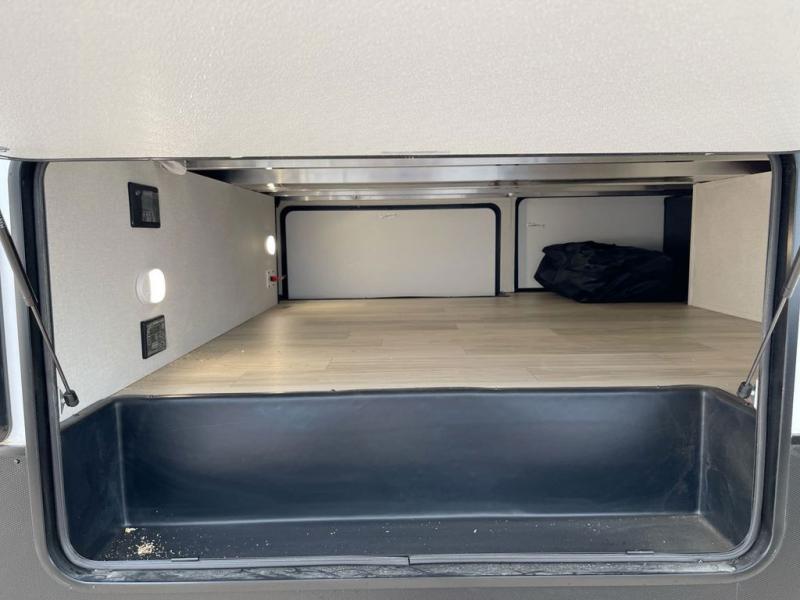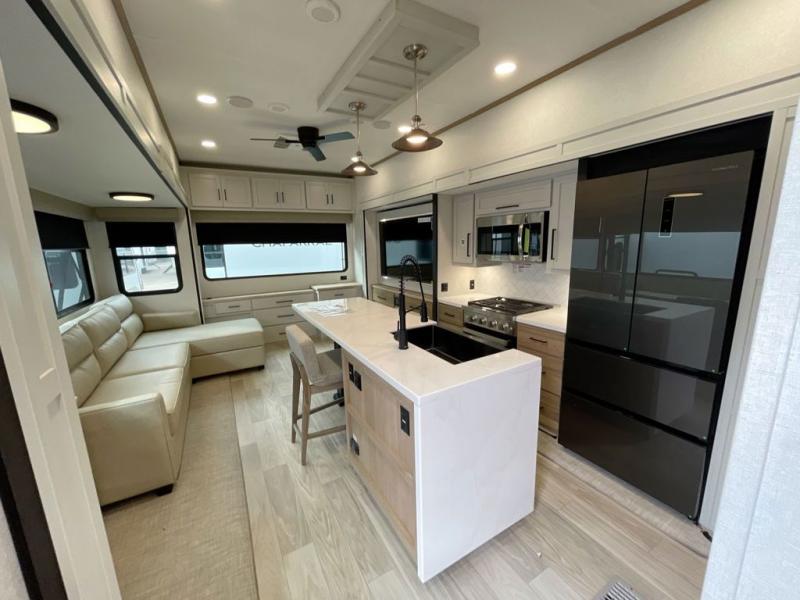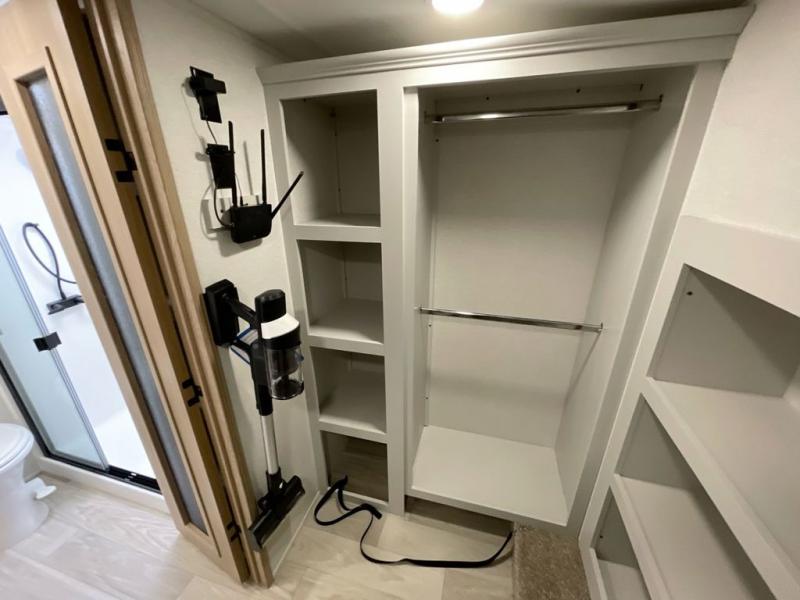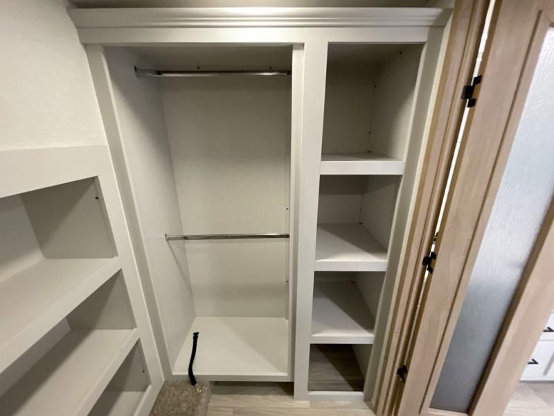 It will be easier than ever to enjoy camping trips in this triple slide out fifth wheel, or even go full-time! The combined kitchen and living area features dual opposing slides for ample space, an L-shaped sofa with a chaise lounge, and a fireplace with a hidden pantry behind for snacks! A desk with a chair and a USB port will provide a place to work if you need to send some emails, and the large kitchen island will give you ample room to prep dinner when you get hungry. There are also pendant lights here, along with a waterfall edge and barstools for dining space. The mid-coach half bath includes a toilet, sink, plus washer and dryer prep, giving you the option to make this the perfect laundry room! The master bedroom up front may be your favorite place to unwind in this unit. There is a king bed slide, a small dresser plus a tall dresser, and a TV hookup if you want the option to watch movies in bed. And you'll be wowed by the front master bedroom with its fiberglass shower with a seat, dual bath sinks, and large walk-in closet!