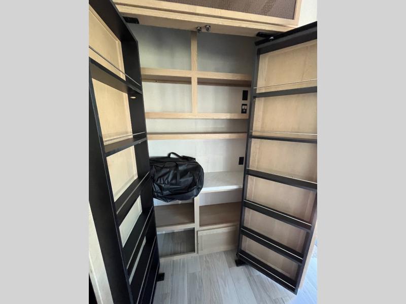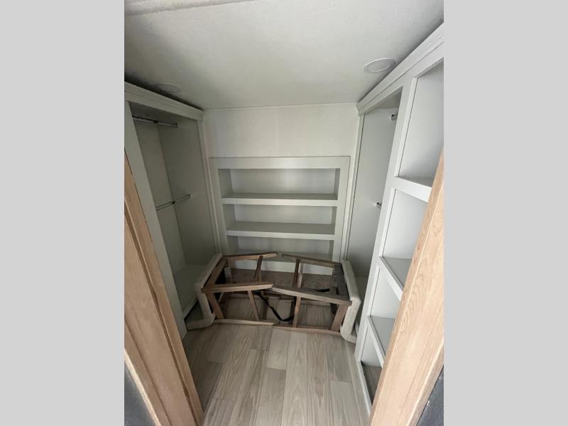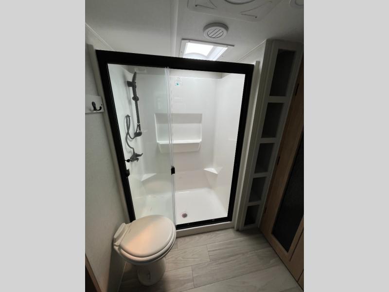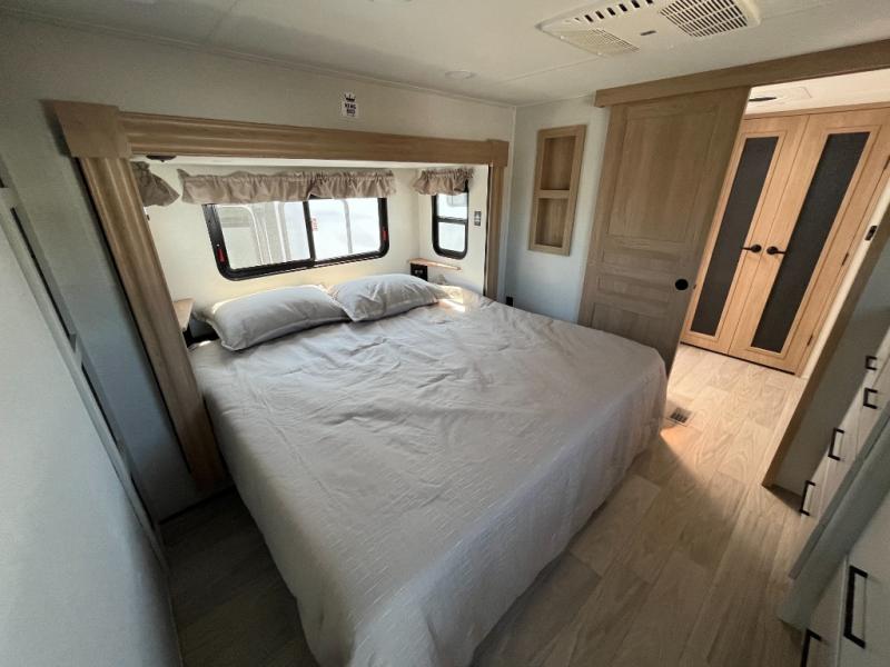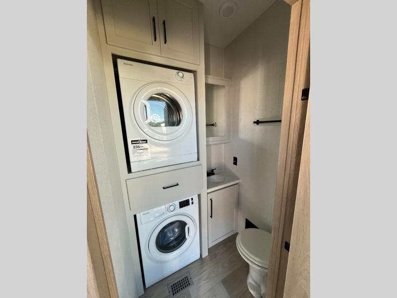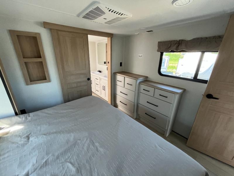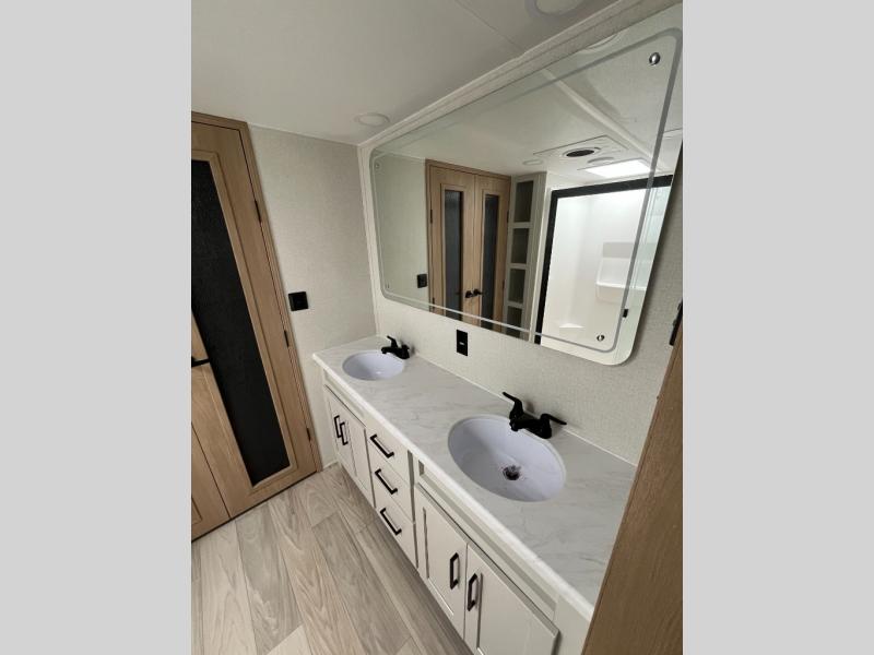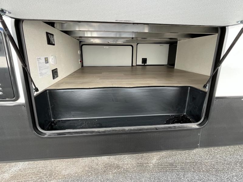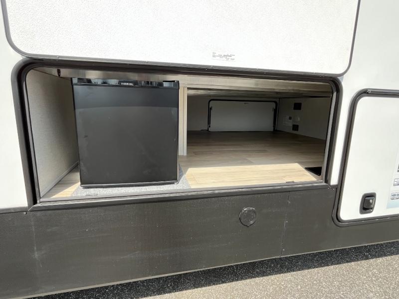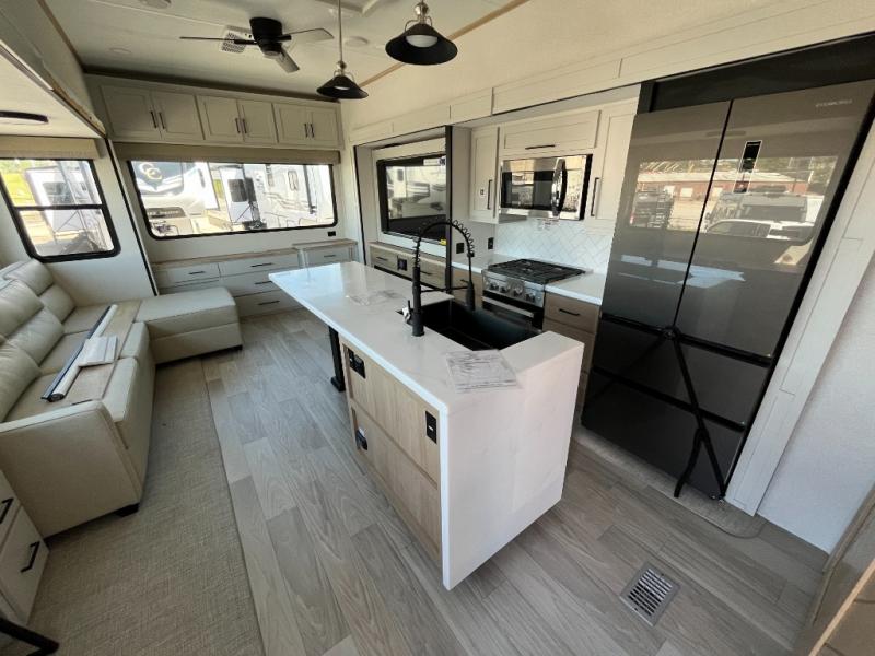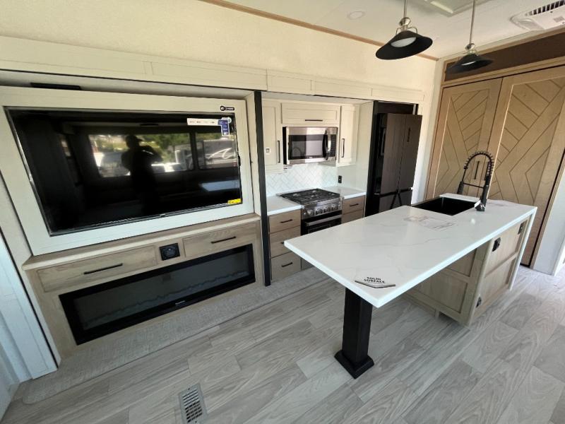 It will be easier than ever to enjoy camping trips in this triple slide out fifth wheel, or even go full-time! The combined kitchen and living area features dual opposing slides for ample space, an L-shaped sofa with a chaise lounge, and a fireplace with a hidden pantry behind for snacks! A desk with a chair and a USB port will provide a place to work if you need to send some emails, and the large kitchen island will give you ample room to prep dinner when you get hungry. There are also pendant lights here, along with a waterfall edge and barstools for dining space. The mid-coach half bath includes a toilet, sink, plus washer and dryer prep, giving you the option to make this the perfect laundry room! The master bedroom up front may be your favorite place to unwind in this unit. There is a king bed slide, a small dresser plus a tall dresser, and a TV hookup if you want the option to watch movies in bed. And you'll be wowed by the front master bedroom with its fiberglass shower with a seat, dual bath sinks, and large walk-in closet!