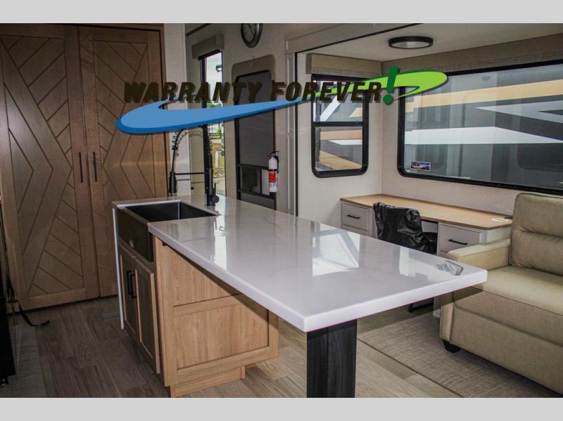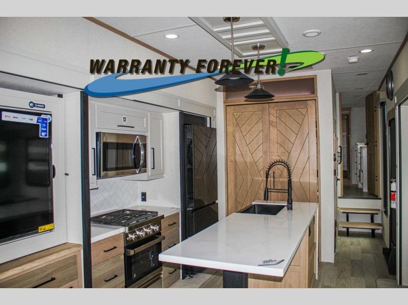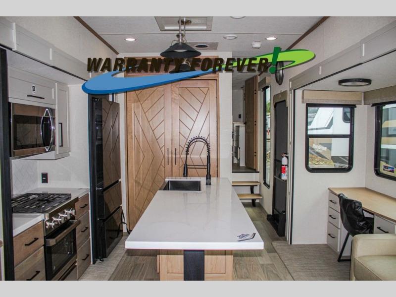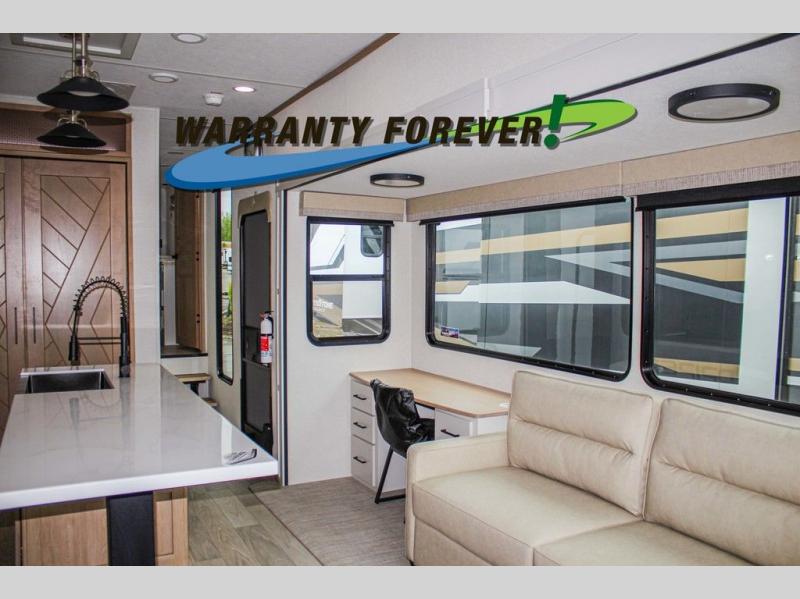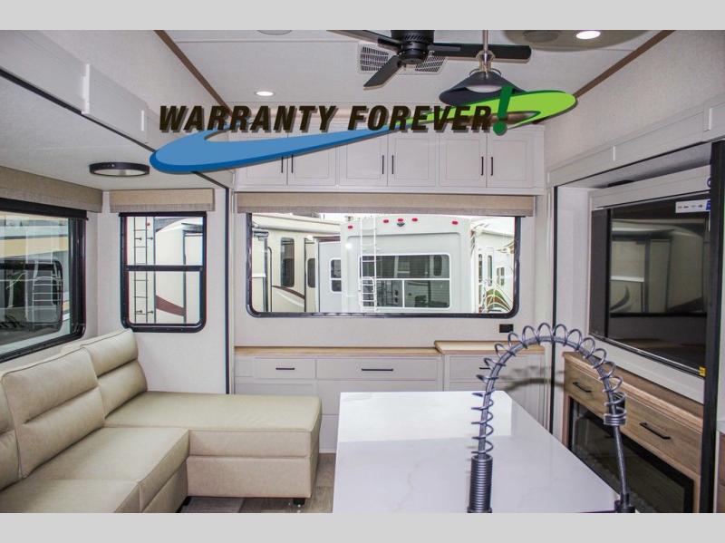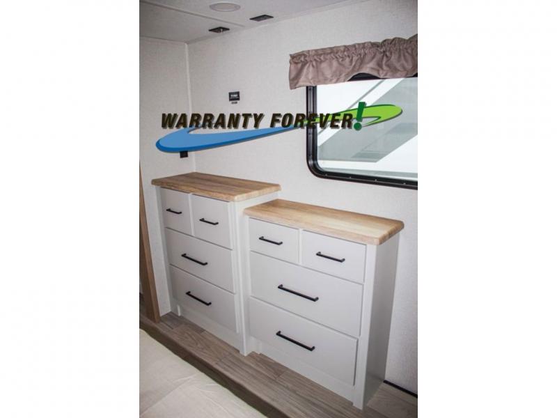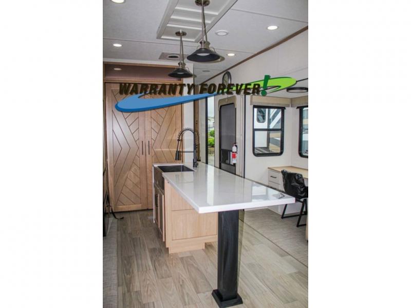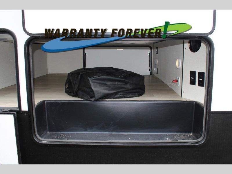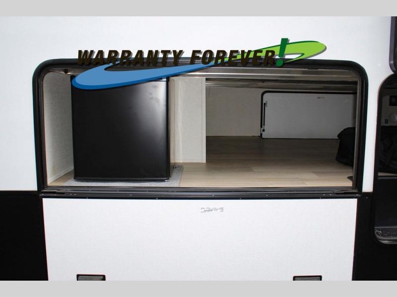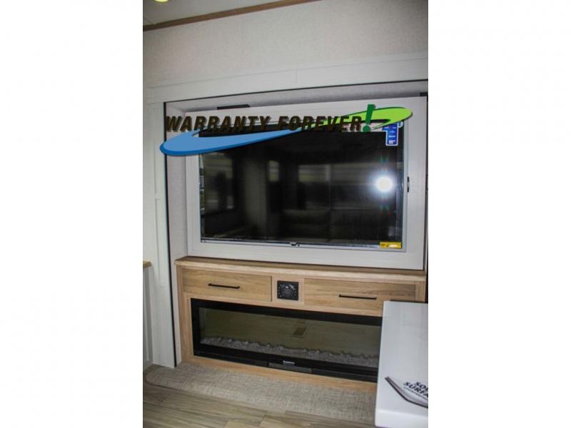 It will be easier than ever to enjoy camping trips in this triple slide out fifth wheel, or even go full-time! The combined kitchen and living area features dual opposing slides for ample space, an L-shaped sofa with a chaise lounge, and a fireplace with a hidden pantry behind for snacks! A desk with a chair and a USB port will provide a place to work if you need to send some emails, and the large kitchen island will give you ample room to prep dinner when you get hungry. There are also pendant lights here, along with a waterfall edge and barstools for dining space. The mid-coach half bath includes a toilet, sink, plus washer and dryer prep, giving you the option to make this the perfect laundry room! The master bedroom up front may be your favorite place to unwind in this unit. There is a king bed slide, a small dresser plus a tall dresser, and a TV hookup if you want the option to watch movies in bed. And you'll be wowed by the front master bedroom with its fiberglass shower with a seat, dual bath sinks, and large walk-in closet!
