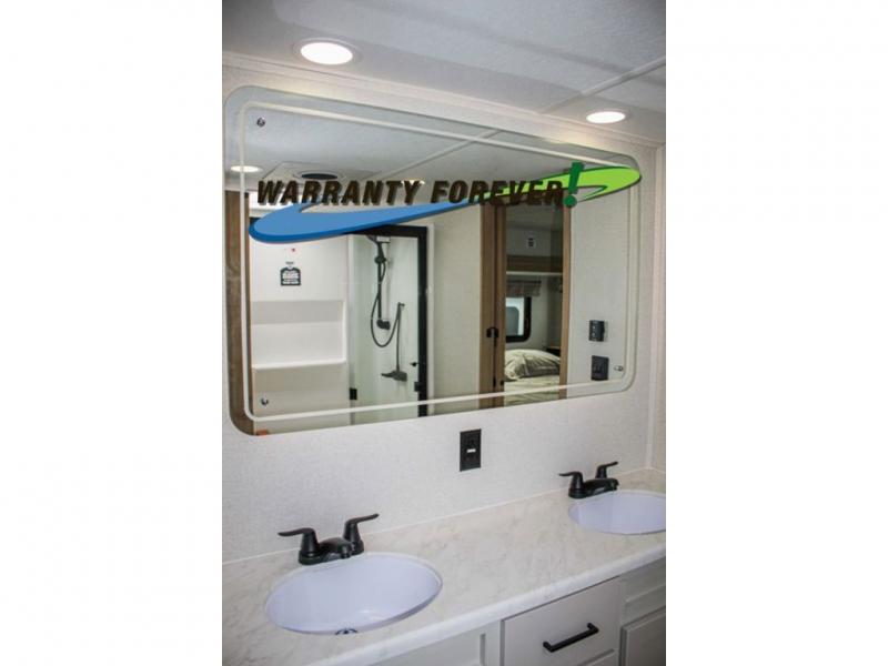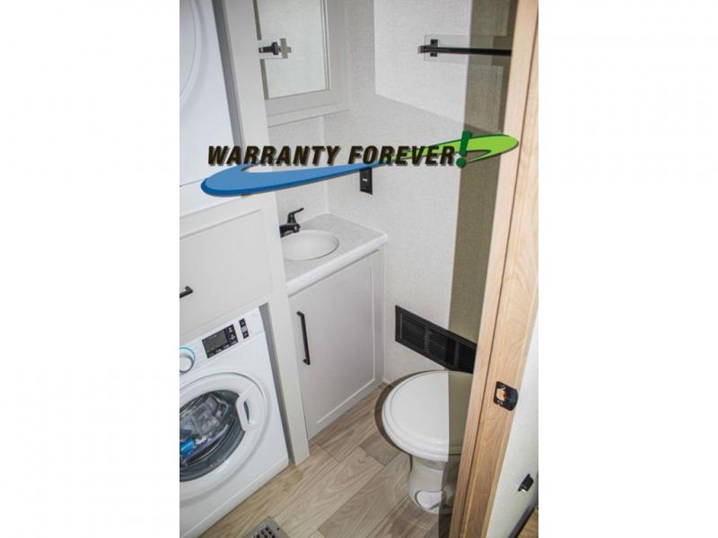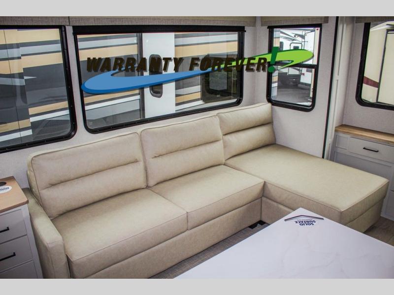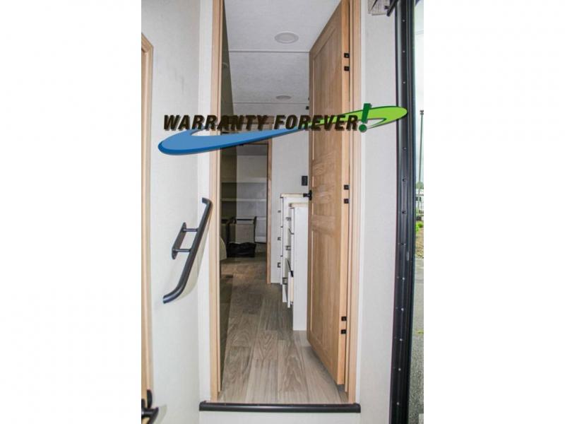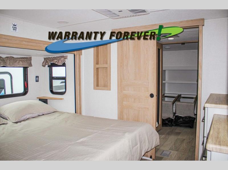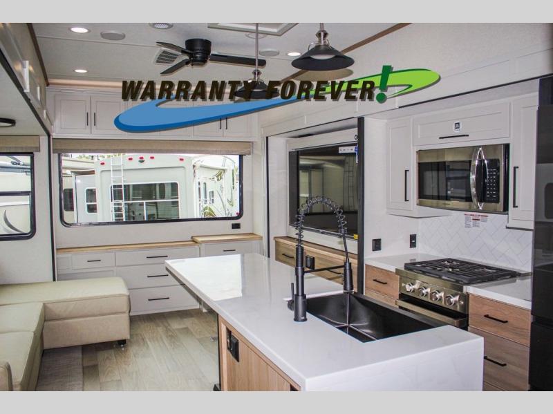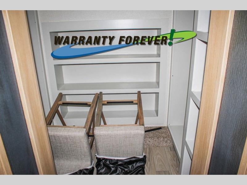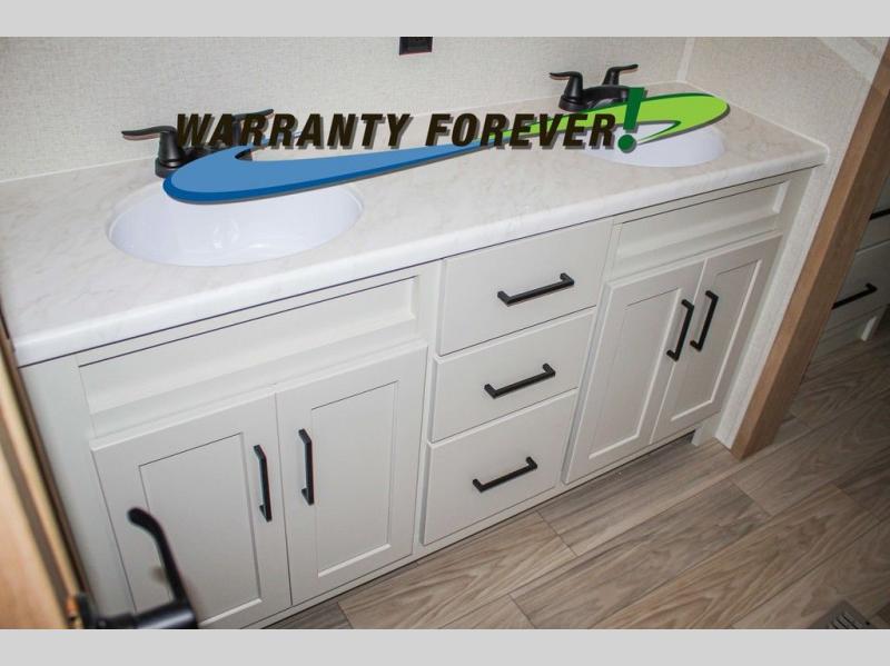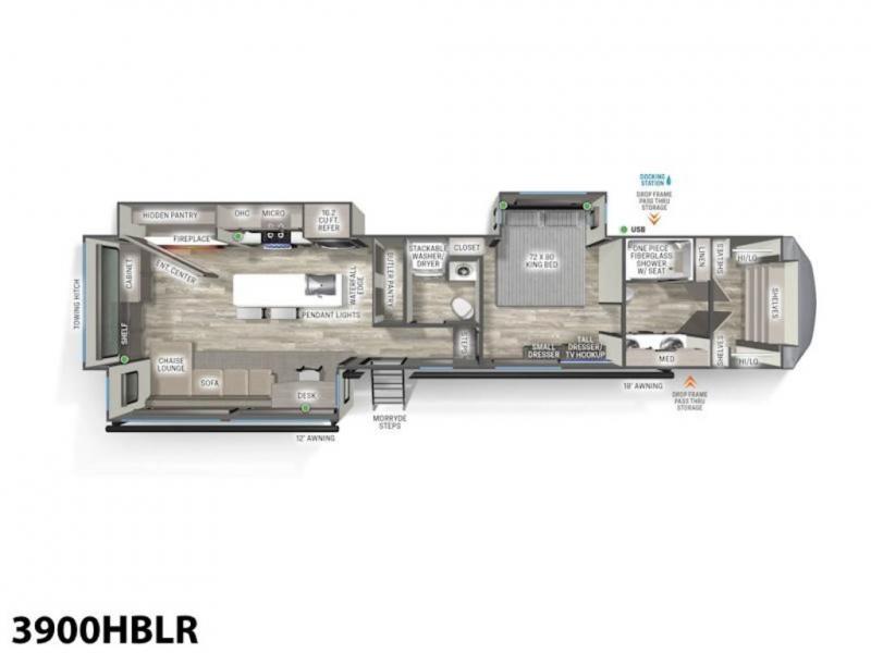It will be easier than ever to enjoy camping trips in this triple slide out fifth wheel, or even go full-time! The combined kitchen and living area features dual opposing slides for ample space, an L-shaped sofa with a chaise lounge, and a fireplace with a hidden pantry behind for snacks! A desk with a chair and a USB port will provide a place to work if you need to send some emails, and the large kitchen island will give you ample room to prep dinner when you get hungry. There are also pendant lights here, along with a waterfall edge and barstools for dining space. The mid-coach half bath includes a toilet, sink, plus washer and dryer prep, giving you the option to make this the perfect laundry room! The master bedroom up front may be your favorite place to unwind in this unit. There is a king bed slide, a small dresser plus a tall dresser, and a TV hookup if you want the option to watch movies in bed. And you'll be wowed by the front master bedroom with its fiberglass shower with a seat, dual bath sinks, and large walk-in closet!