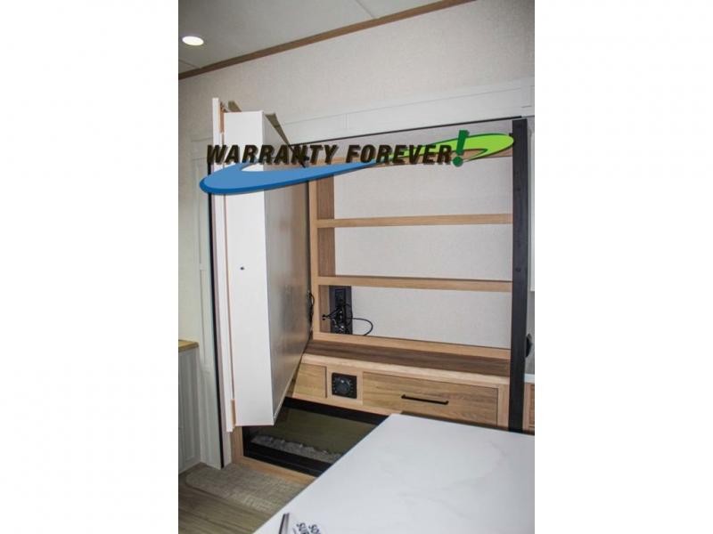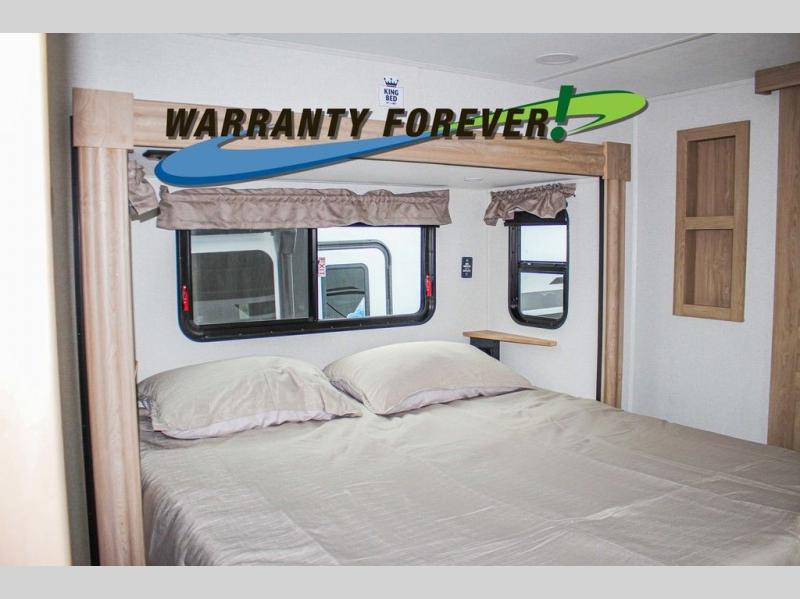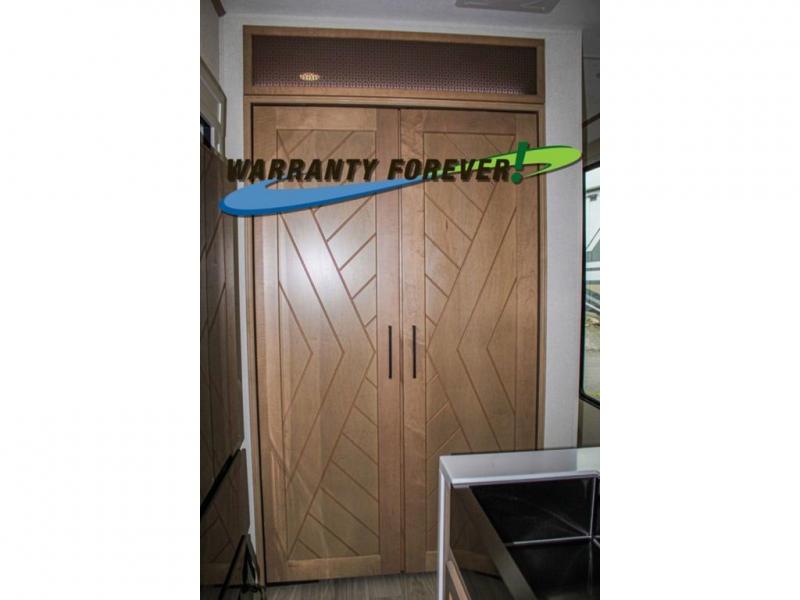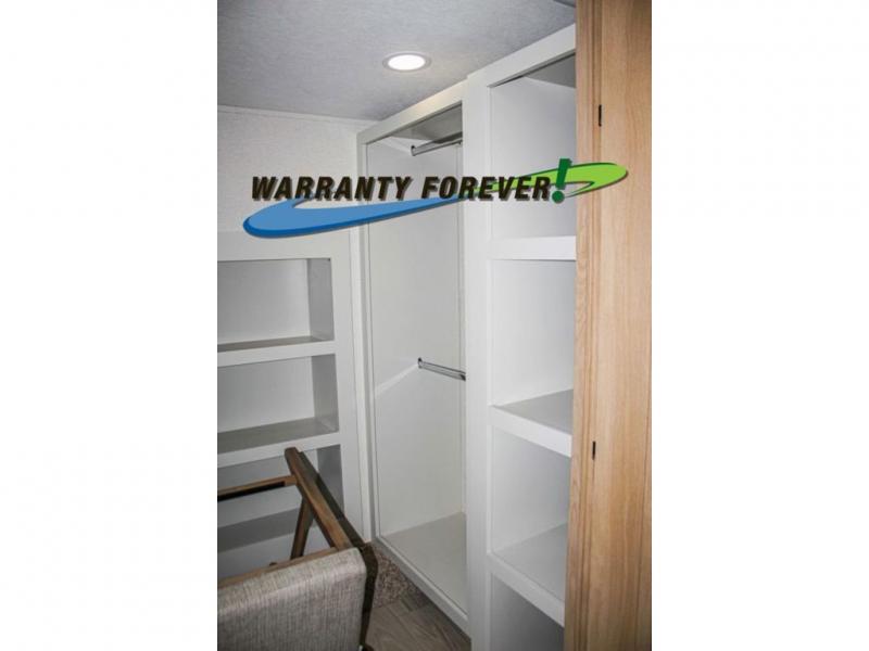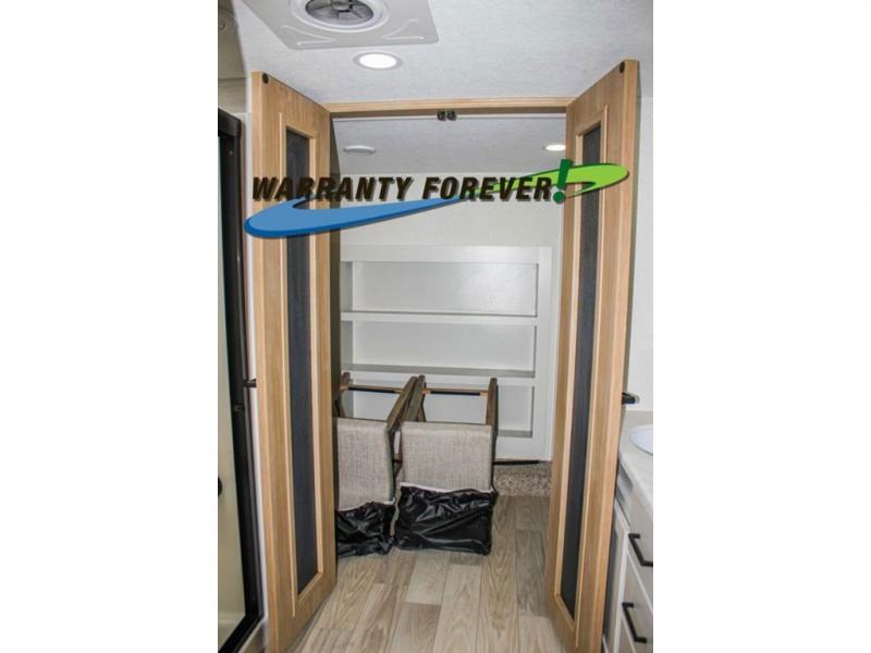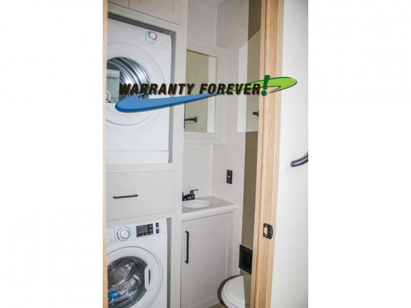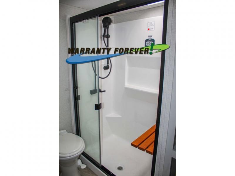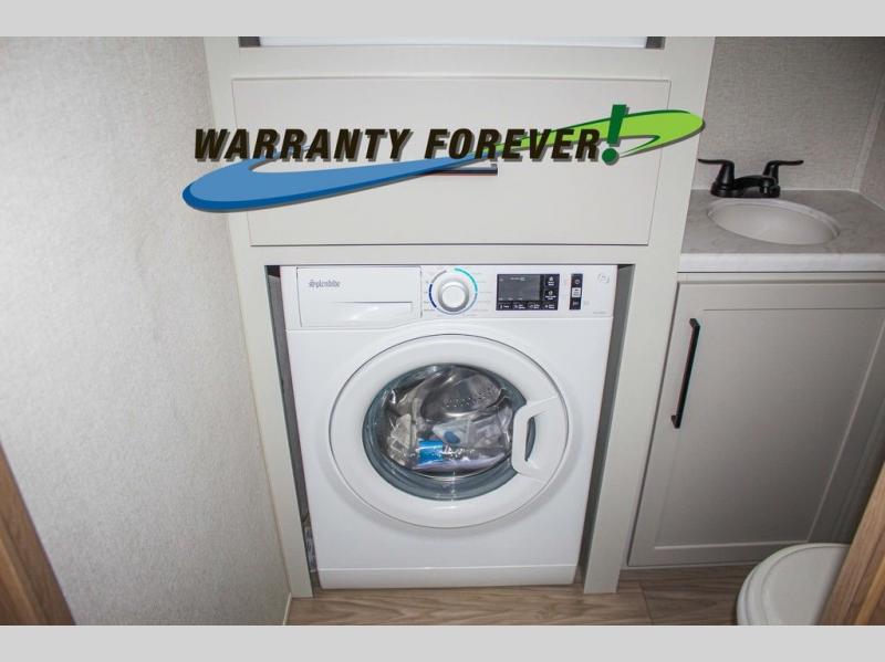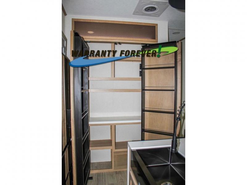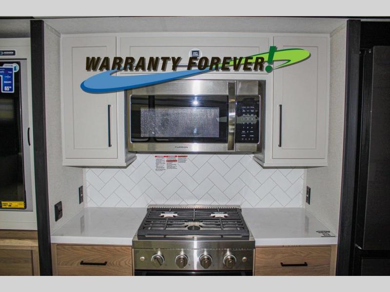 It will be easier than ever to enjoy camping trips in this triple slide out fifth wheel, or even go full-time! The combined kitchen and living area features dual opposing slides for ample space, an L-shaped sofa with a chaise lounge, and a fireplace with a hidden pantry behind for snacks! A desk with a chair and a USB port will provide a place to work if you need to send some emails, and the large kitchen island will give you ample room to prep dinner when you get hungry. There are also pendant lights here, along with a waterfall edge and barstools for dining space. The mid-coach half bath includes a toilet, sink, plus washer and dryer prep, giving you the option to make this the perfect laundry room! The master bedroom up front may be your favorite place to unwind in this unit. There is a king bed slide, a small dresser plus a tall dresser, and a TV hookup if you want the option to watch movies in bed. And you'll be wowed by the front master bedroom with its fiberglass shower with a seat, dual bath sinks, and large walk-in closet!