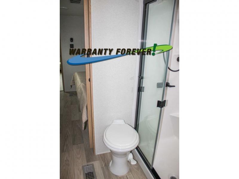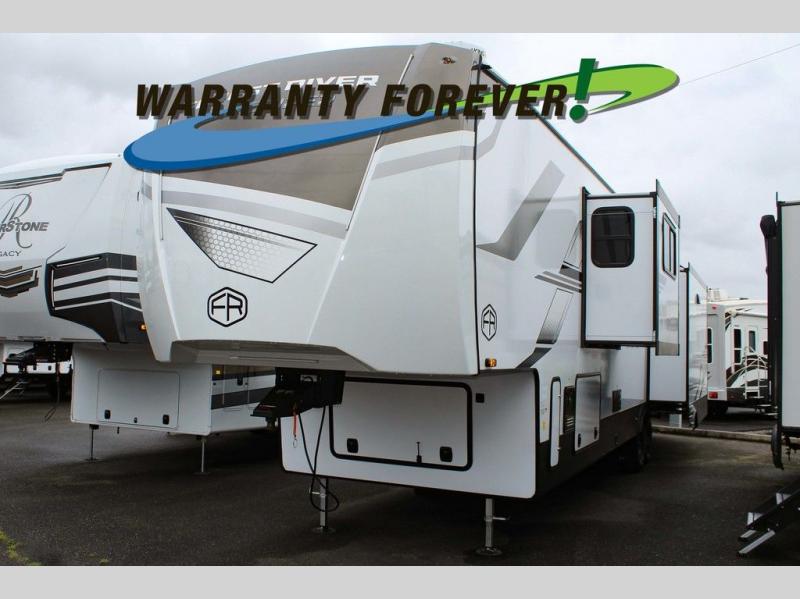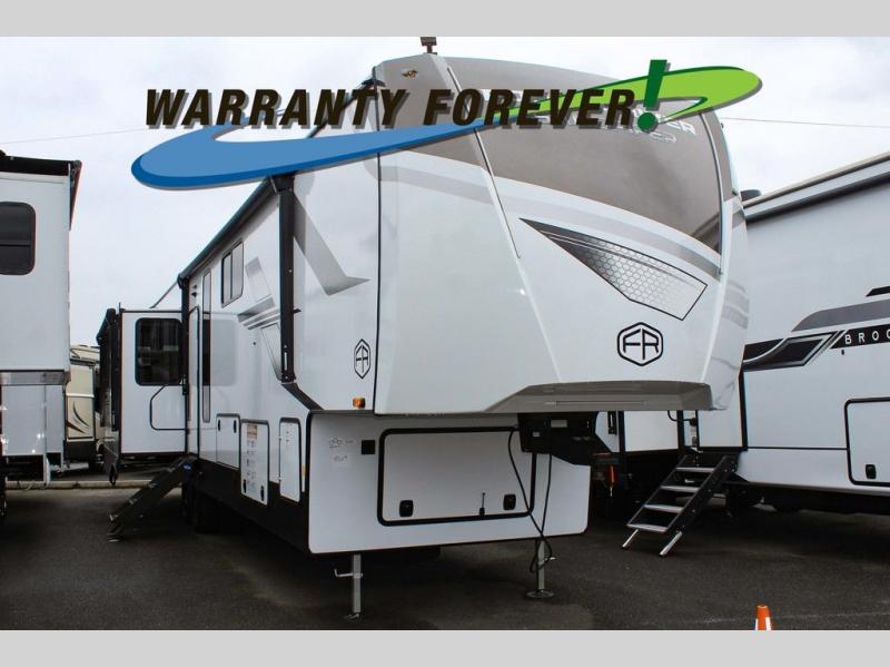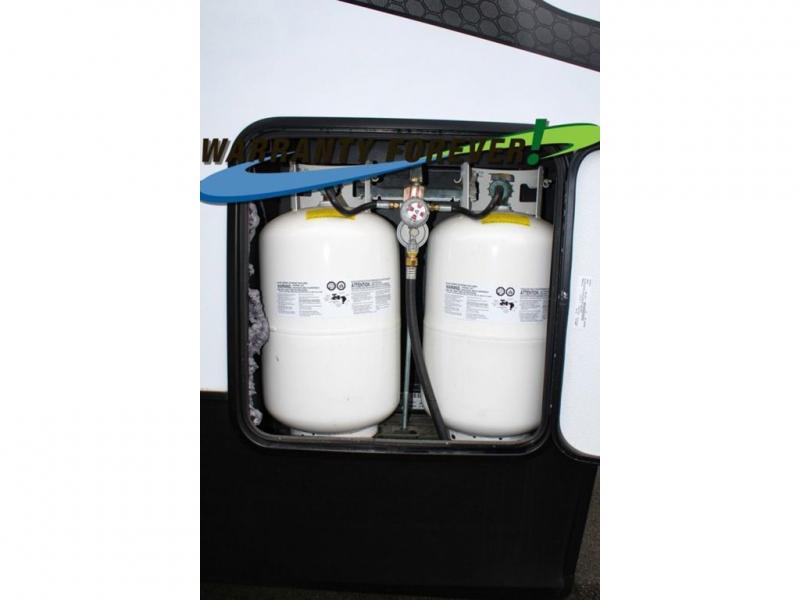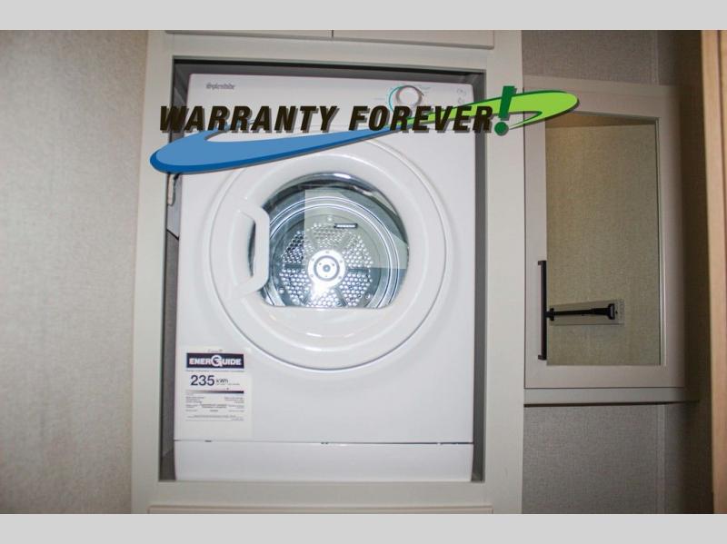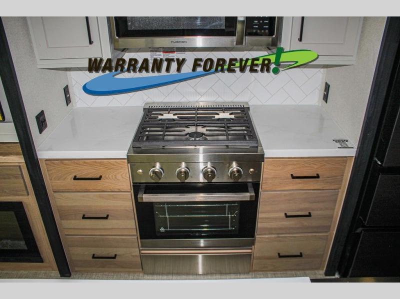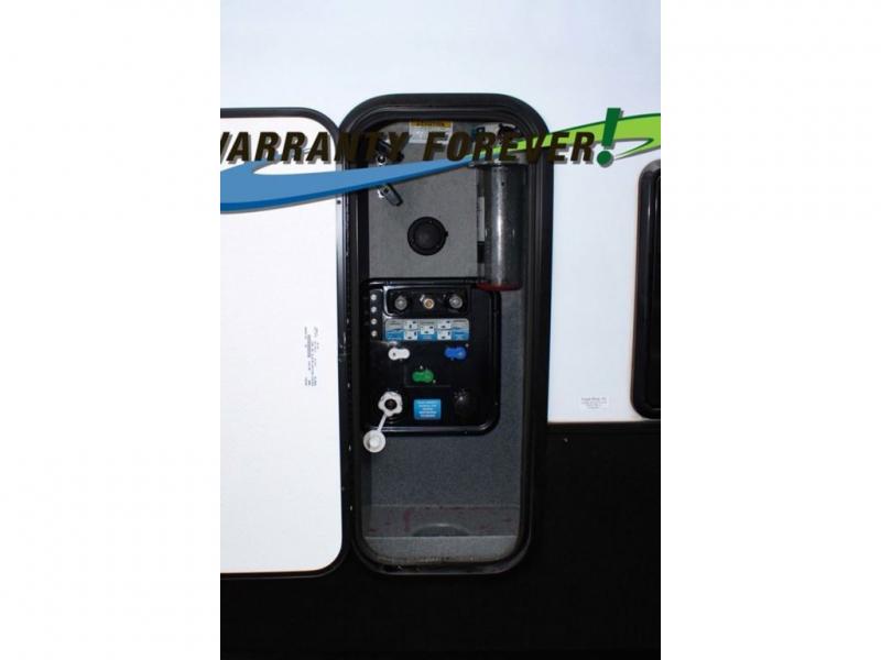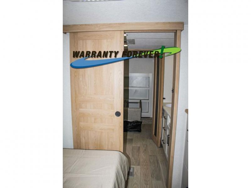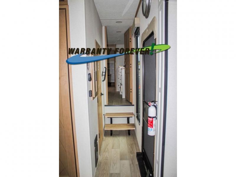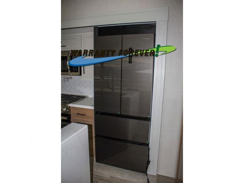 It will be easier than ever to enjoy camping trips in this triple slide out fifth wheel, or even go full-time! The combined kitchen and living area features dual opposing slides for ample space, an L-shaped sofa with a chaise lounge, and a fireplace with a hidden pantry behind for snacks! A desk with a chair and a USB port will provide a place to work if you need to send some emails, and the large kitchen island will give you ample room to prep dinner when you get hungry. There are also pendant lights here, along with a waterfall edge and barstools for dining space. The mid-coach half bath includes a toilet, sink, plus washer and dryer prep, giving you the option to make this the perfect laundry room! The master bedroom up front may be your favorite place to unwind in this unit. There is a king bed slide, a small dresser plus a tall dresser, and a TV hookup if you want the option to watch movies in bed. And you'll be wowed by the front master bedroom with its fiberglass shower with a seat, dual bath sinks, and large walk-in closet!