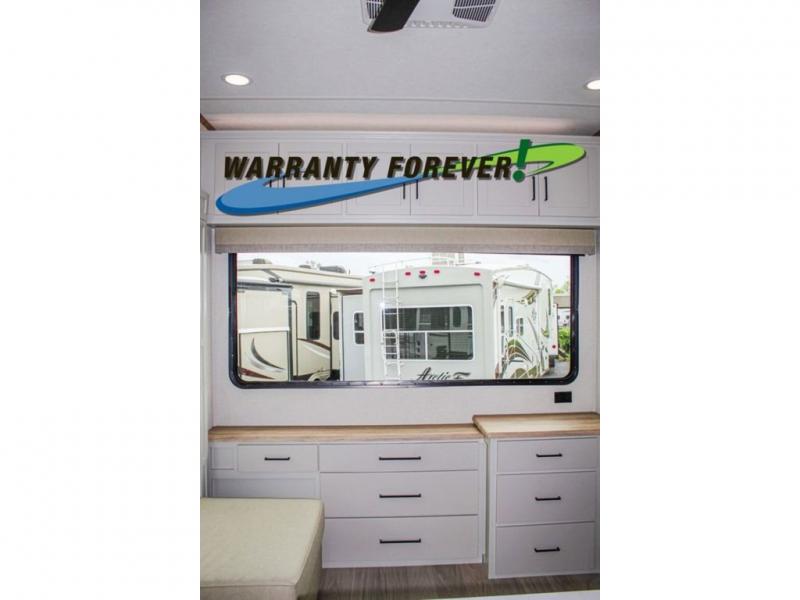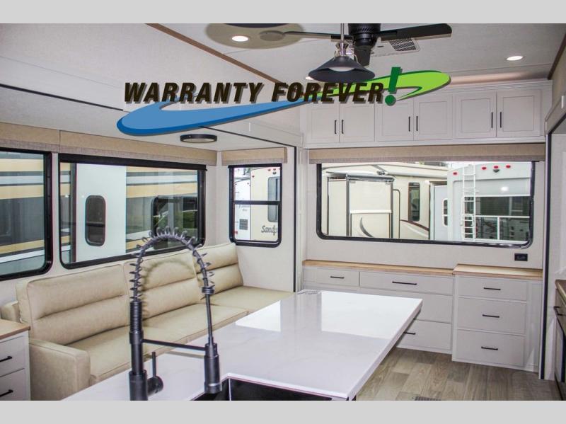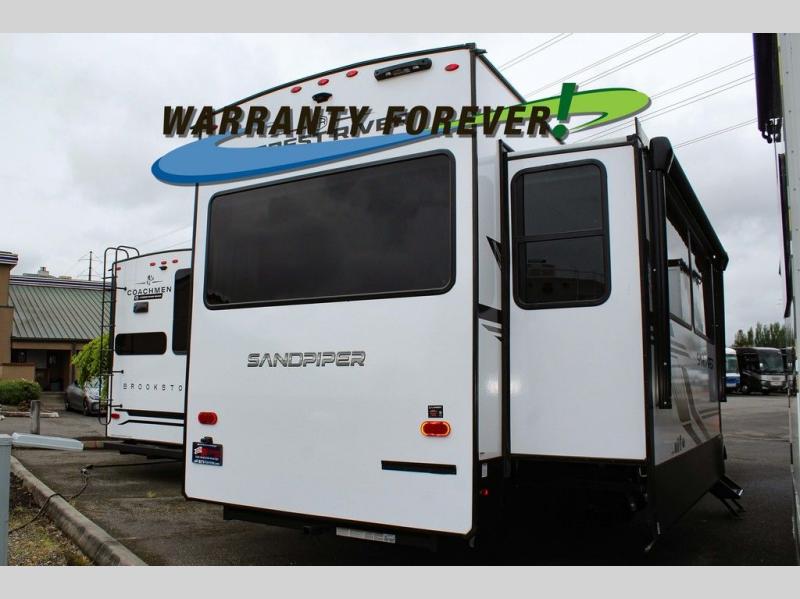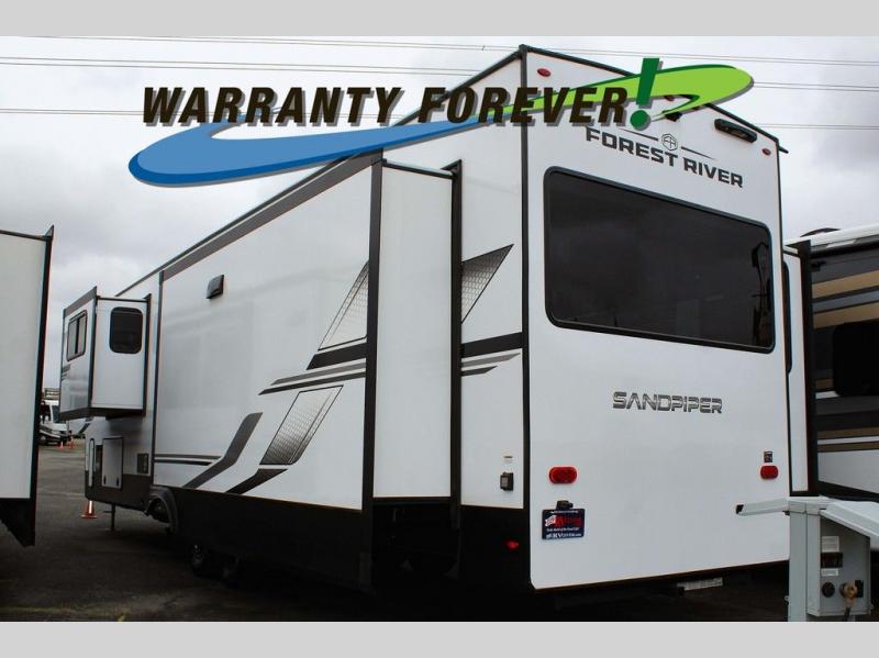 You will find the perfect balance of size, space, features, and luxury with any one of these Forest River Sandpiper fifth wheels! They are constructed with a welded aluminum framed vacuum bonded laminated superstructure, a cambered powder coated frame with rust prohibitor, and a fully enclosed underbelly for added protection against the elements. The large tinted windows come with a 80/20 UV prohibitor or you can choose the optional dual pane windows. Some hassle-free amenities include a 60k BTU on-demand water heater, full coach water filter system, tire pressure monitor system, and an electric leveling system! Inside, you'll enjoy stainless steel appliances, solid surface countertops, Beachside Sundance linoleum, recessed residential lighting, and many more comforts!