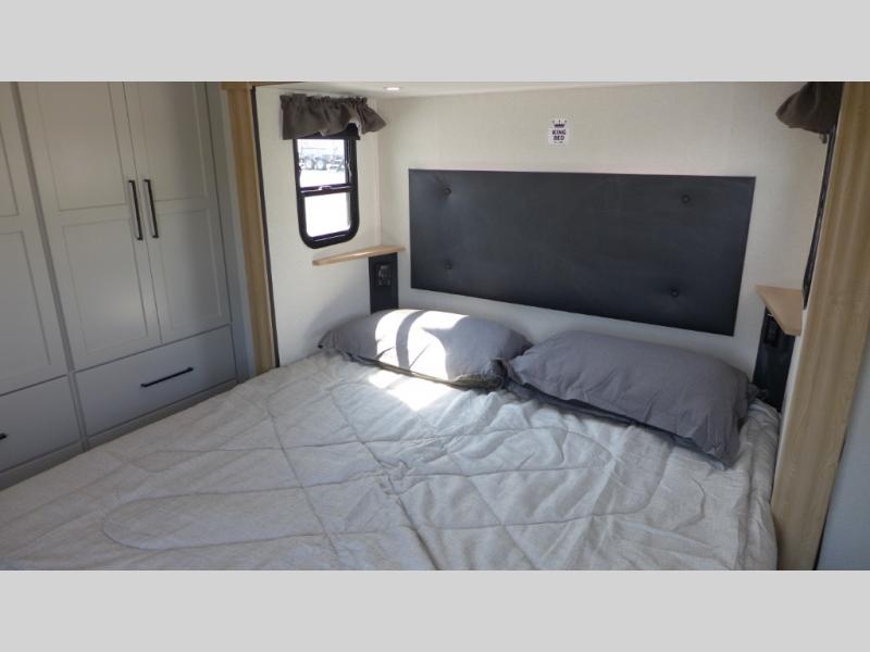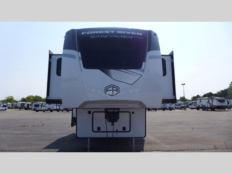 You will find the perfect balance of size, space, features, and luxury with any one of these Forest River Sandpiper fifth wheels! They are constructed with a welded aluminum framed vacuum bonded laminated superstructure, a cambered powder coated frame with rust prohibitor, and a fully enclosed underbelly for added protection against the elements. The large tinted windows come with a 80/20 UV prohibitor or you can choose the optional dual pane windows. Some hassle-free amenities include a 60k BTU on-demand water heater, full coach water filter system, tire pressure monitor system, and an electric leveling system! Inside, you'll enjoy stainless steel appliances, solid surface countertops, Beachside Sundance linoleum, recessed residential lighting, and many more comforts!
