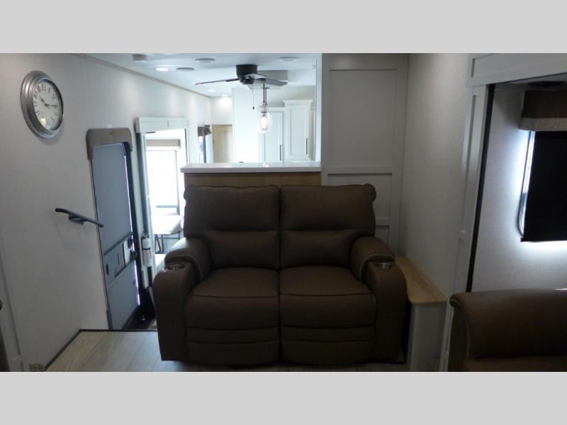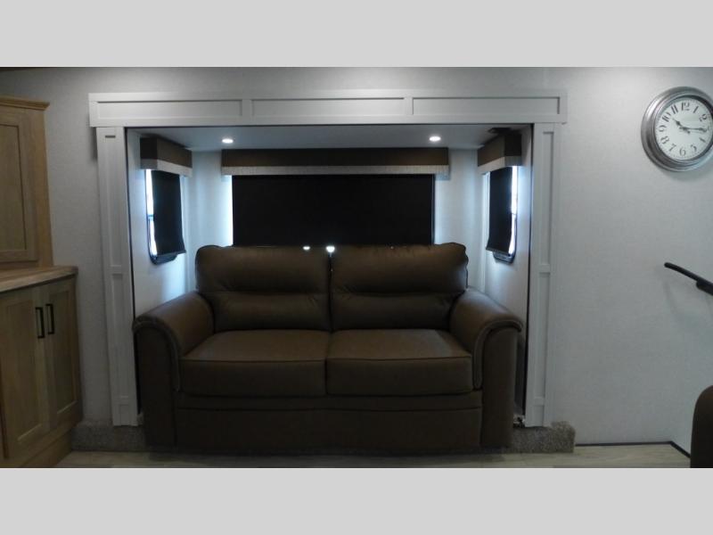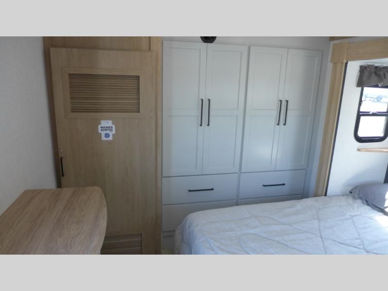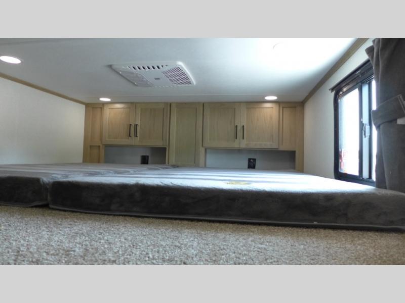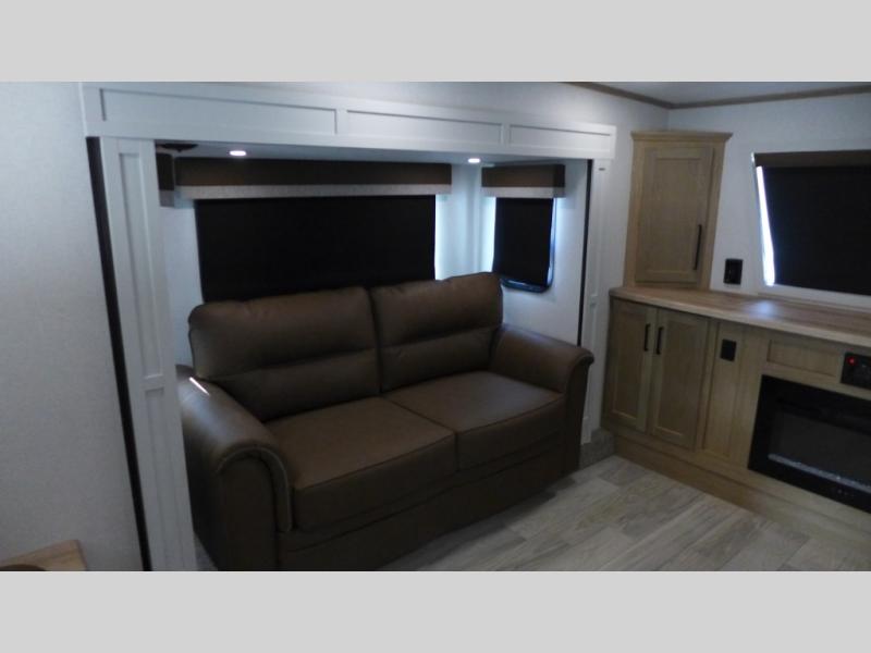 Wow! Check out this fifth wheel with a full loft for the little ones with two bunk mats, two wardrobe bookcases and a wardrobe/cabinet for ample storage. The main floor includes five slides for maximum space, a front living area with dual hide-a-bed sofas, plus an entertainment center with a 50" flat screen TV for movie nights! Once your guests have converted the living room to their bedroom at night, you can take the rear private bedroom. There is a king bed slide out here, a wardrobe, plus a closet with washer and dryer prep for full-time living. The full bath is easily accessible for everyone, and the middle kitchen will be a favorite with the chef of your group. Here, you'll find a 12V refrigerator, an island, tons of counter space, plus a hutch to display nice dishes, and a pantry for dry goods. Don't let this fifth wheel slip away!
