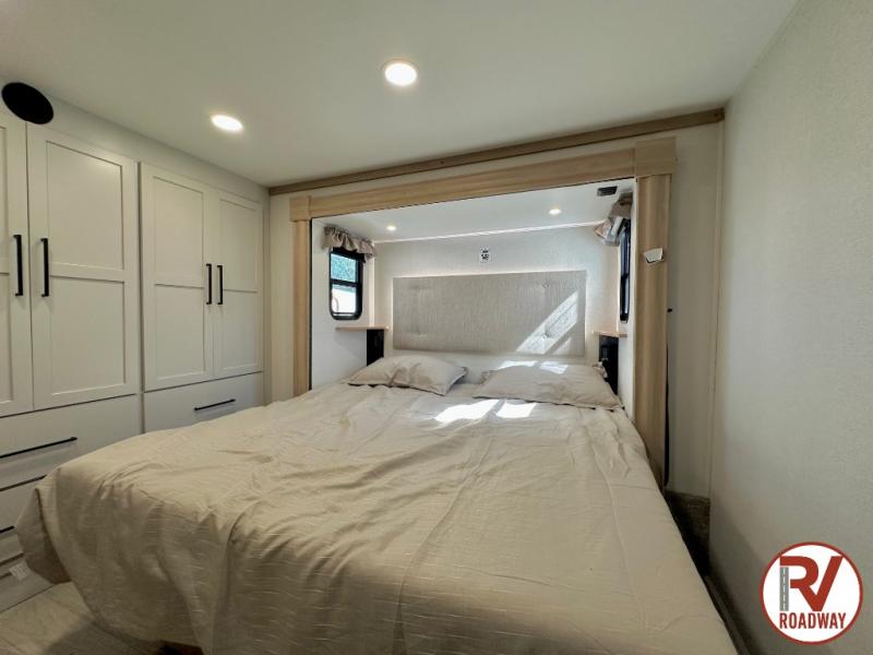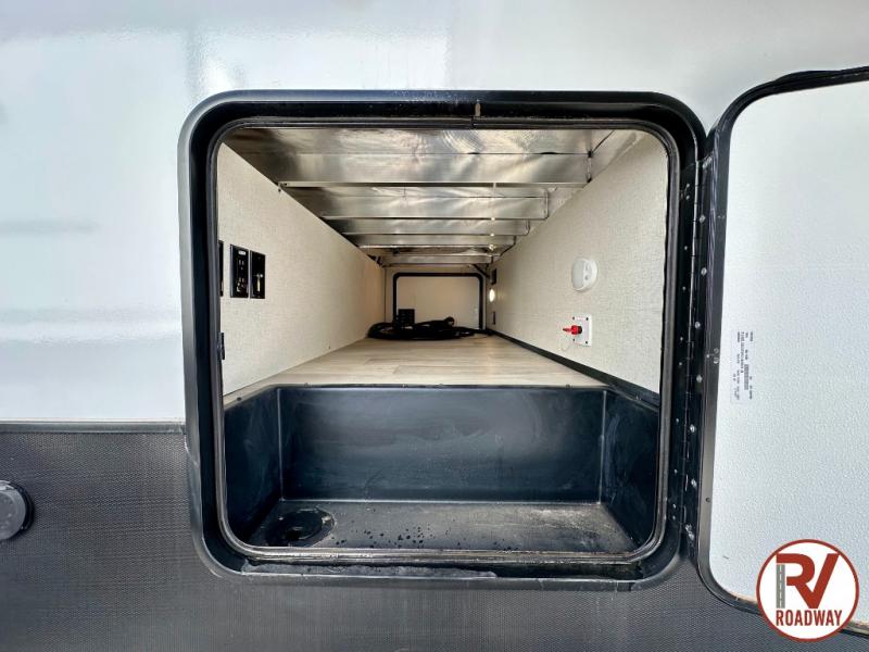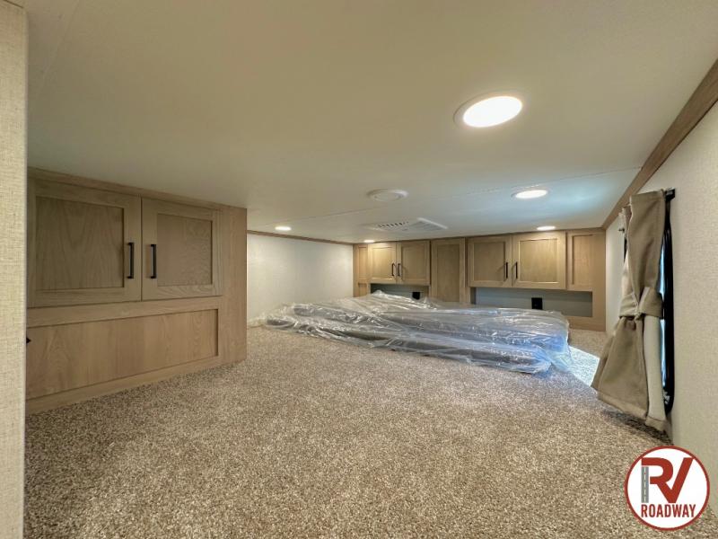 Wow! Check out this fifth wheel with a full loft for the little ones with two bunk mats, two wardrobe bookcases and a wardrobe/cabinet for ample storage. The main floor includes five slides for maximum space, a front living area with dual hide-a-bed sofas, plus an entertainment center with a 50" flat screen TV for movie nights! Once your guests have converted the living room to their bedroom at night, you can take the rear private bedroom. There is a king bed slide out here, a wardrobe, plus a closet with washer and dryer prep for full-time living. The full bath is easily accessible for everyone, and the middle kitchen will be a favorite with the chef of your group. Here, you'll find a 12V refrigerator, an island, tons of counter space, plus a hutch to display nice dishes, and a pantry for dry goods. Don't let this fifth wheel slip away!