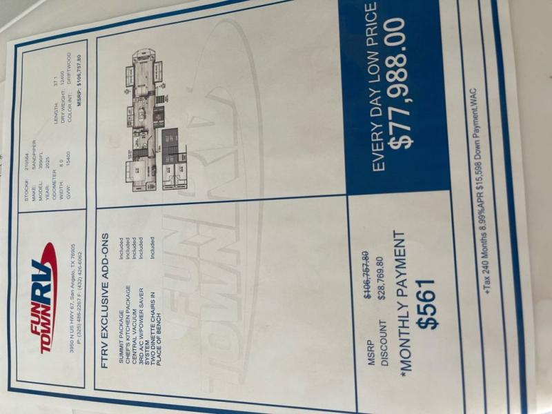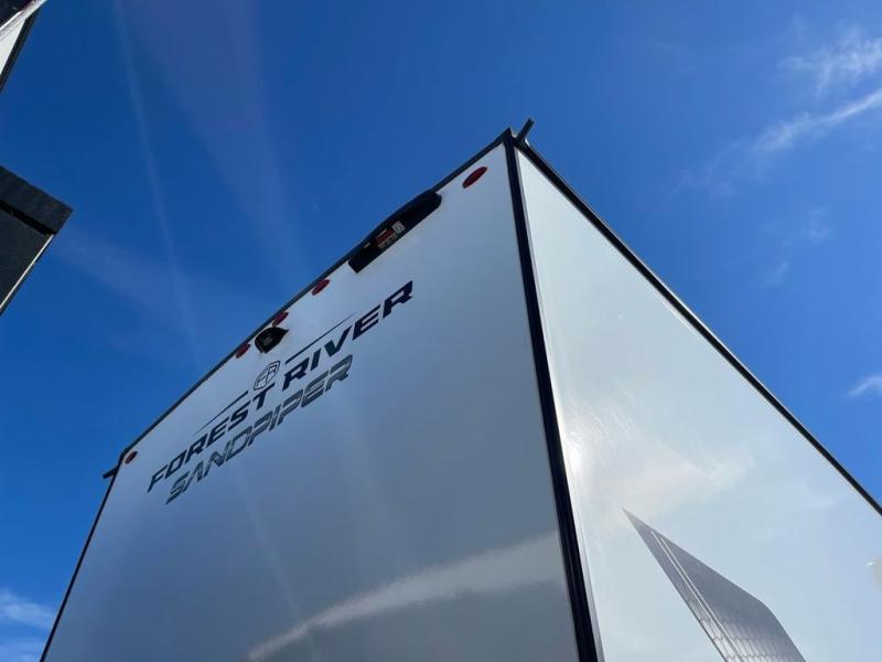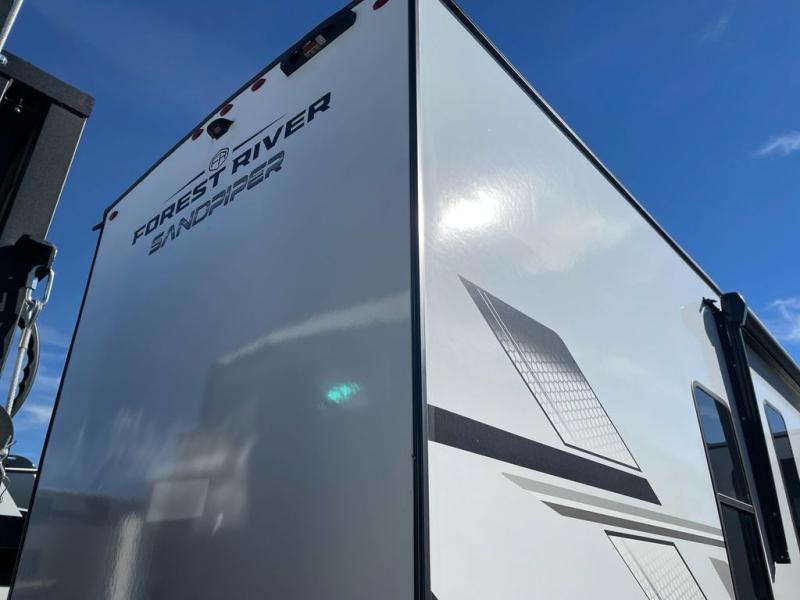 You will find the perfect balance of size, space, features, and luxury with any one of these Forest River Sandpiper fifth wheels! They are constructed with a welded aluminum framed vacuum bonded laminated superstructure, a cambered powder coated frame with rust prohibitor, and a fully enclosed underbelly to protect the units vitals during any season. The large tinted windows come with a 80/20 UV prohibitor or you can choose the optional dual pane windows. Some hassle-free amenities include a 60k BTU on-demand water heater, full coach water filter system, tire pressure monitor system, and an electric leveling system! Inside, you'll enjoy stainless steel appliances, solid surface countertops, upgraded raised panel cabinet doors, and rustic wood plank linoleum to name a few comforts!