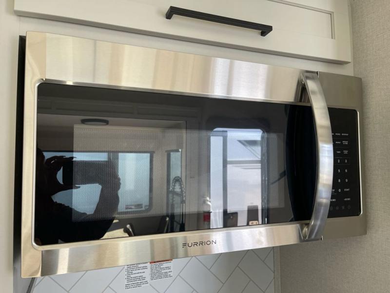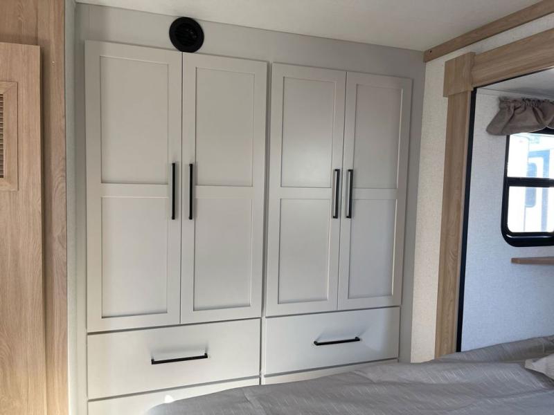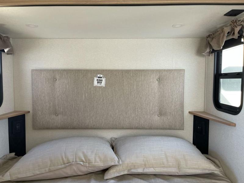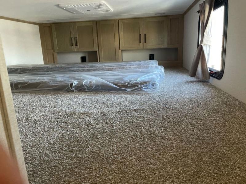 Wow! Check out this fifth wheel with a full loft for the little ones, plus a half loft that can become a play room/storage room. The main floor includes five slides for maximum space, a front living area with dual hide-a-bed sofas, plus an entertainment center with a 50" flat screen TV for movie nights! Once your guests have converted the living room to their bedroom at night, you can take the rear private bedroom. There is a king bed slide out here, plus a wardrobe, plus a closet with washer and dryer prep for full-time living. The full bath is easily accessible for everyone, and the middle kitchen will be a favorite with the chef of your group. Here, you'll find a 17 cu. ft. 12V refrigerator, an island, tons of counter space, plus a hutch to display nice dishes, and a pantry for dry goods. Don't let this fifth wheel slip away!