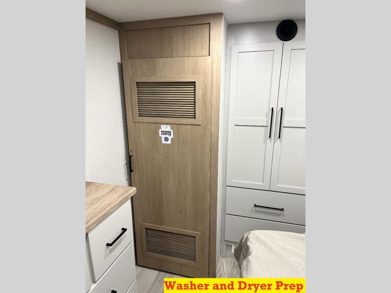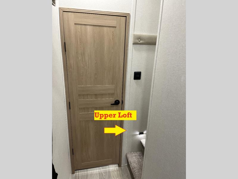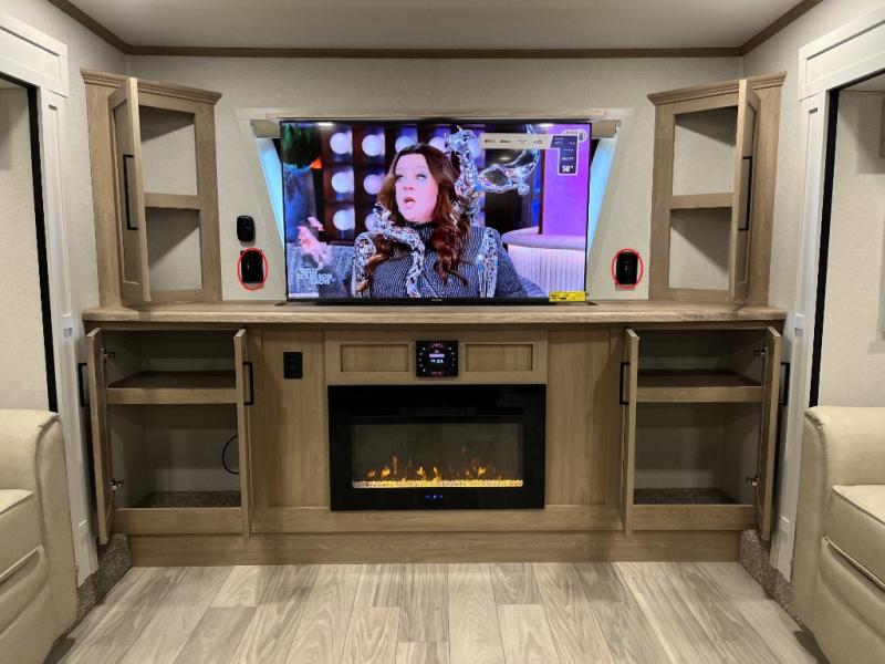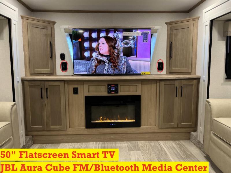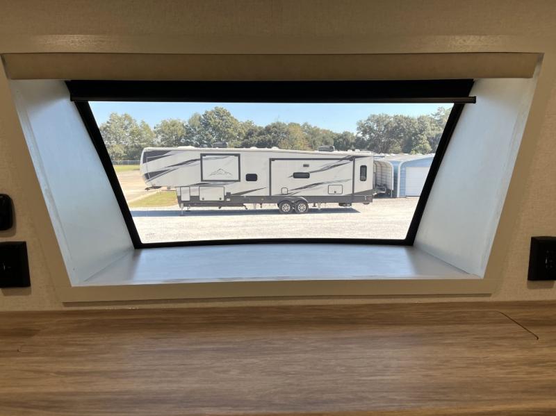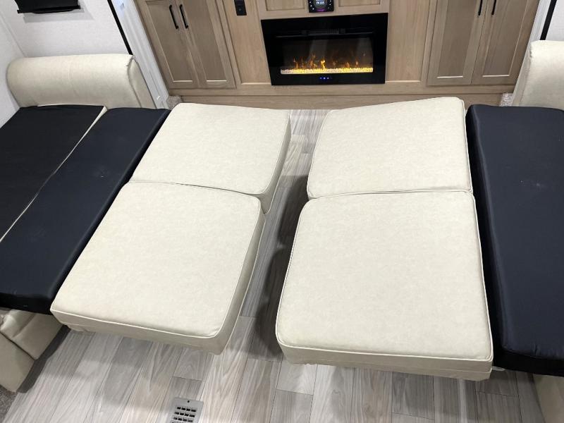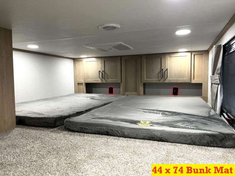 Wow! Check out this fifth wheel with a full loft for the little ones with two bunk mats, two wardrobe bookcases and a wardrobe/cabinet for ample storage. The main floor includes five slides for maximum space, a front living area with dual hide-a-bed sofas, plus an entertainment center with a 50" flat screen TV for movie nights! Once your guests have converted the living room to their bedroom at night, you can take the rear private bedroom. There is a king bed slide out here, a wardrobe, plus a closet with washer and dryer prep for full-time living. The full bath is easily accessible for everyone, and the middle kitchen will be a favorite with the chef of your group. Here, you'll find a 12V refrigerator, an island, tons of counter space, plus a hutch to display nice dishes, and a pantry for dry goods. Don't let this fifth wheel slip away!