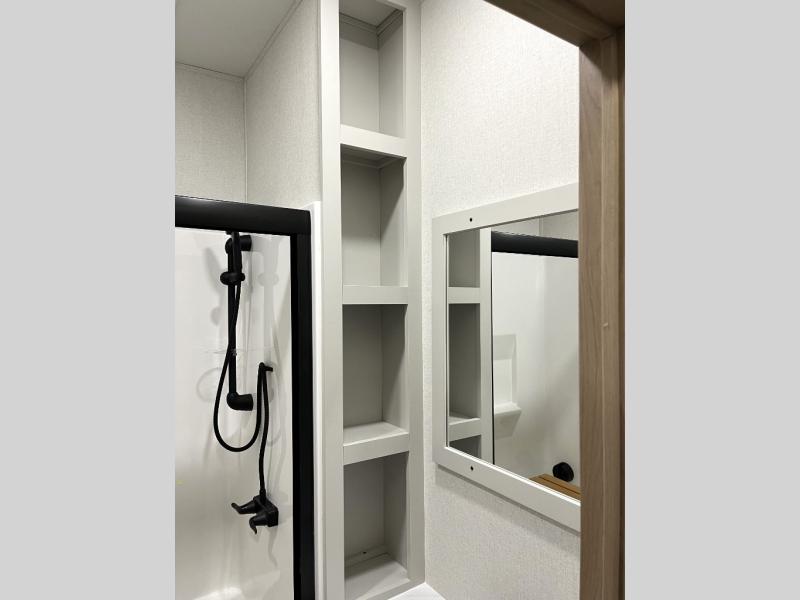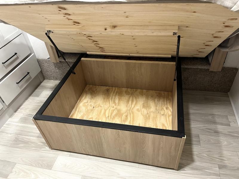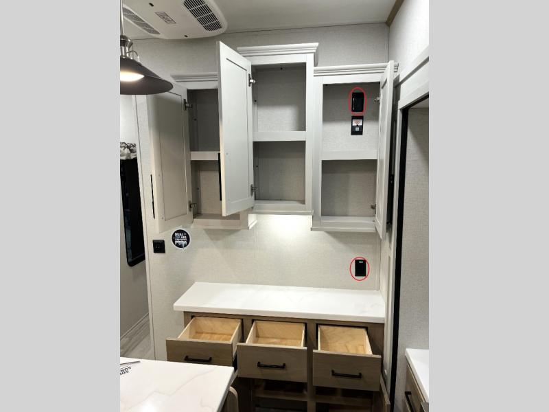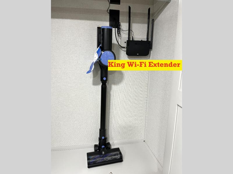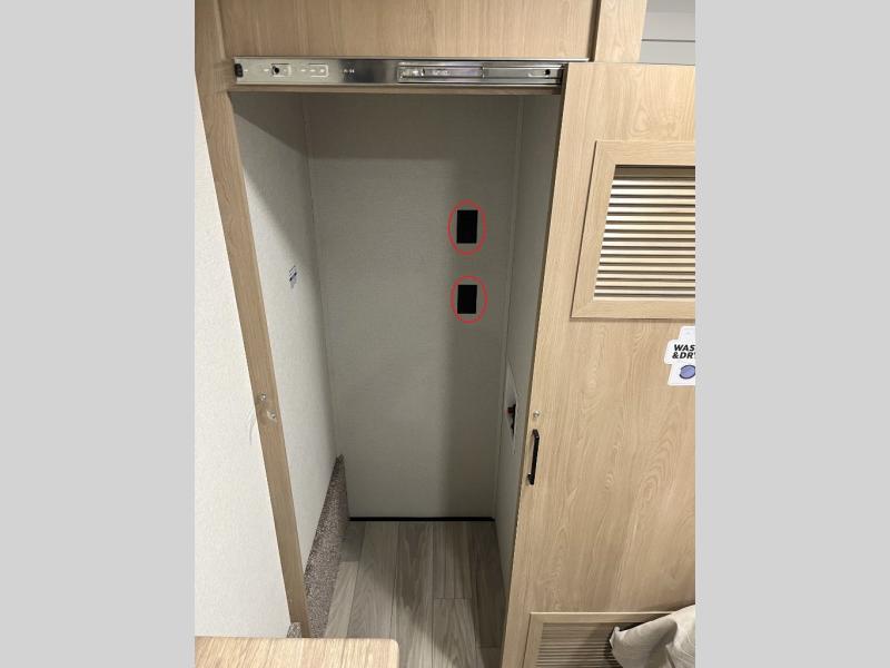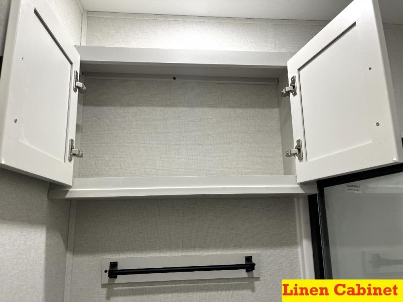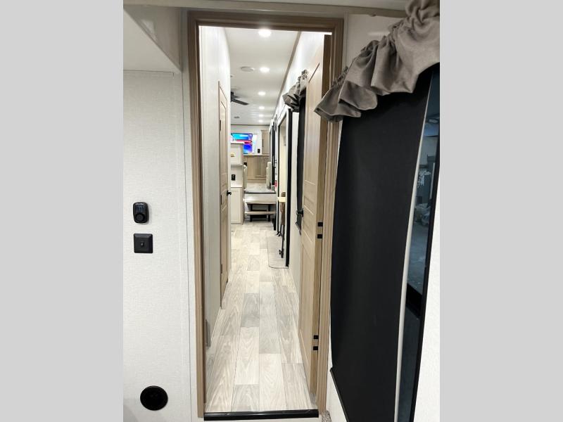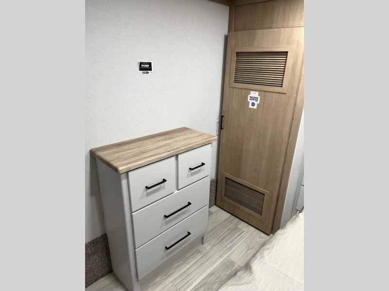 Wow! Check out this fifth wheel with a full loft for the little ones with two bunk mats, two wardrobe bookcases and a wardrobe/cabinet for ample storage. The main floor includes five slides for maximum space, a front living area with dual hide-a-bed sofas, plus an entertainment center with a 50" flat screen TV for movie nights! Once your guests have converted the living room to their bedroom at night, you can take the rear private bedroom. There is a king bed slide out here, a wardrobe, plus a closet with washer and dryer prep for full-time living. The full bath is easily accessible for everyone, and the middle kitchen will be a favorite with the chef of your group. Here, you'll find a 12V refrigerator, an island, tons of counter space, plus a hutch to display nice dishes, and a pantry for dry goods. Don't let this fifth wheel slip away!