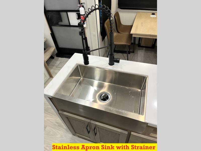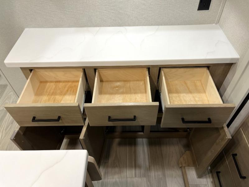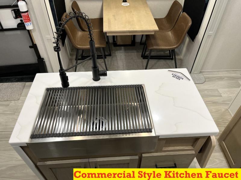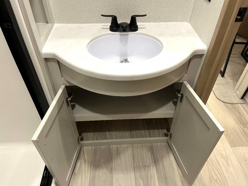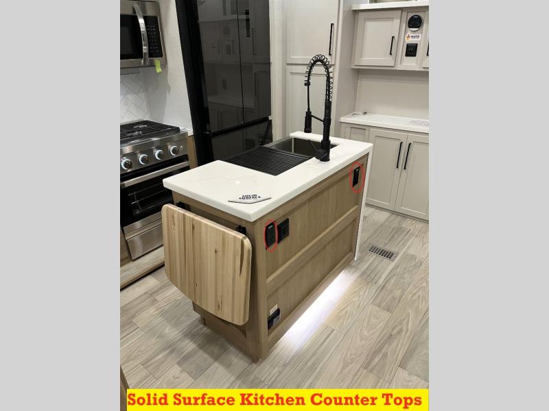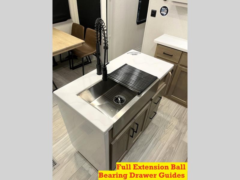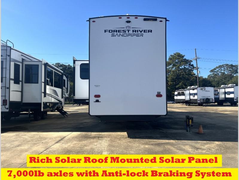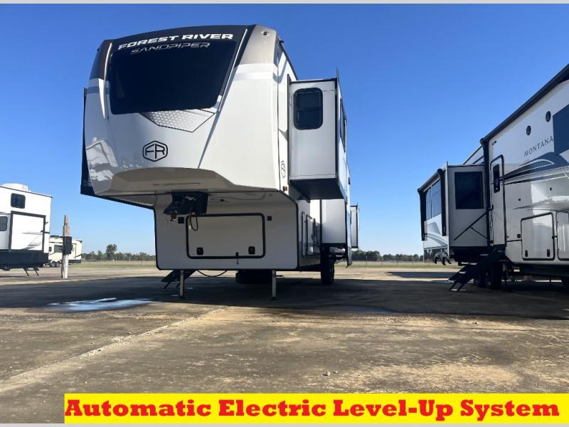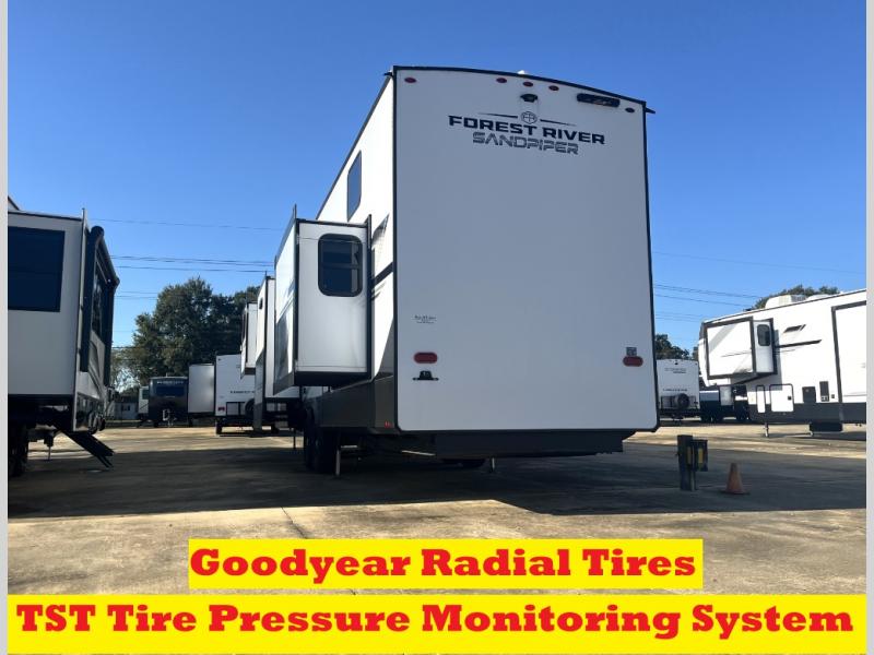 You will find the perfect balance of size, space, features, and luxury with any one of these Forest River Sandpiper fifth wheels! They are constructed with a welded aluminum framed vacuum bonded laminated superstructure, a cambered powder coated frame with rust prohibitor, and a fully enclosed underbelly for added protection against the elements. The large tinted windows come with a 80/20 UV prohibitor or you can choose the optional dual pane windows. Some hassle-free amenities include a 60k BTU on-demand water heater, full coach water filter system, tire pressure monitor system, and an electric leveling system! Inside, you'll enjoy stainless steel appliances, solid surface countertops, Beachside Sundance linoleum, recessed residential lighting, and many more comforts!