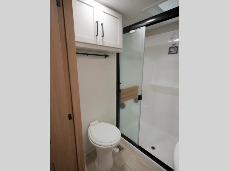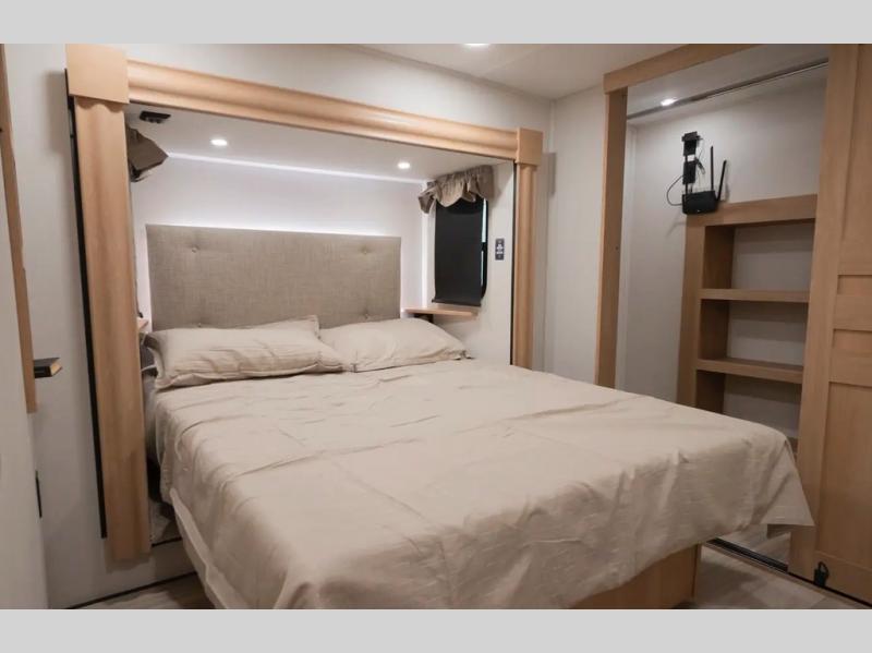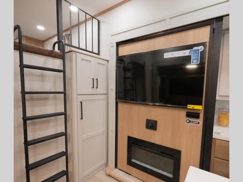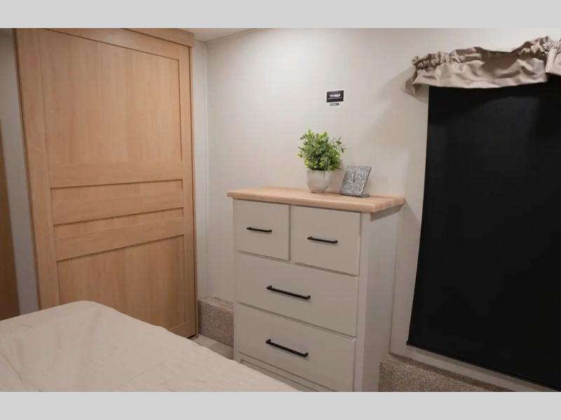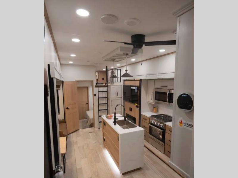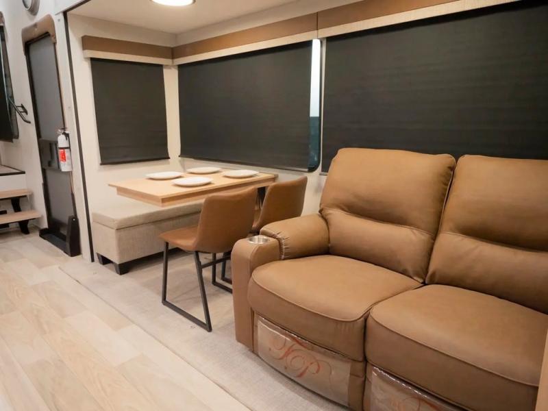 Weekend camping trips and full-time RV living is made complete in this quad slide out fifth wheel. Your crew can relax under the two power awnings, or head inside to enjoy the fireplace. There is also a 50" flat screen TV across from the theater seating, plus a free-standing dinette to dine at. There are two full baths with the front bath including a walk-in shower with a seat for your comfort, and the front private bedroom will feel just like home with its queen bed and large front wardrobe. There is even washer and dryer prep to make laundry day easier than ever. The master bedroom in back includes a second queen bed slide out, and the rear full bath has another convenience with it's exterior entry door, and