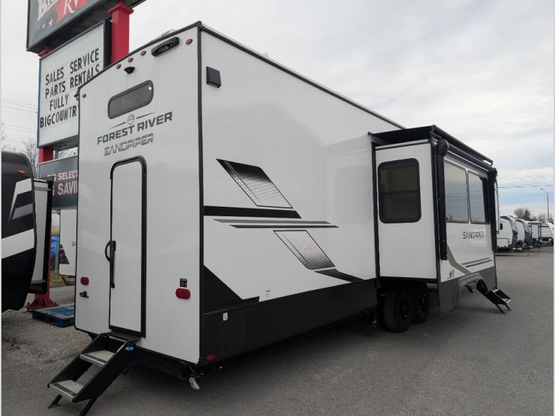 You will find the perfect balance of size, space, features, and luxury with any one of these Forest River Sandpiper fifth wheels! They are constructed with a welded aluminum framed vacuum bonded laminated superstructure, a cambered powder coated frame with rust prohibitor, and a fully enclosed underbelly for added protection against the elements. The large tinted windows come with a 80/20 UV prohibitor or you can choose the optional dual pane windows. Some hassle-free amenities include a 60k BTU on-demand water heater, full coach water filter system, tire pressure monitor system, and an electric leveling system! Inside, you'll enjoy stainless steel appliances, solid surface countertops, Beachside Sundance linoleum, recessed residential lighting, and many more comforts!
