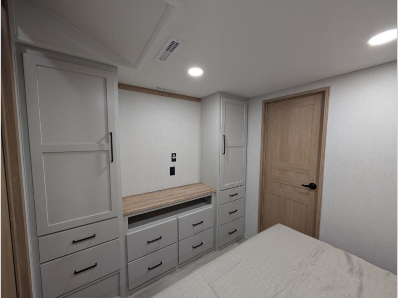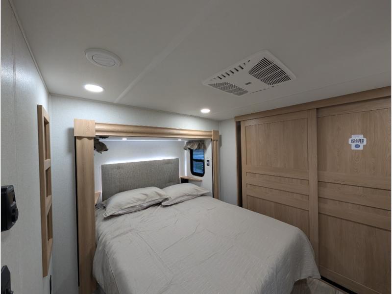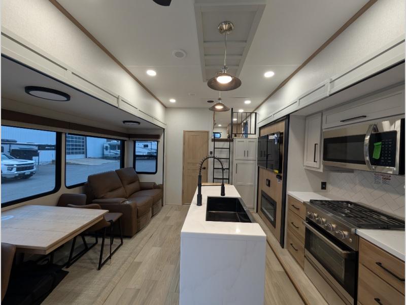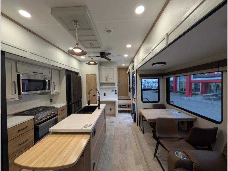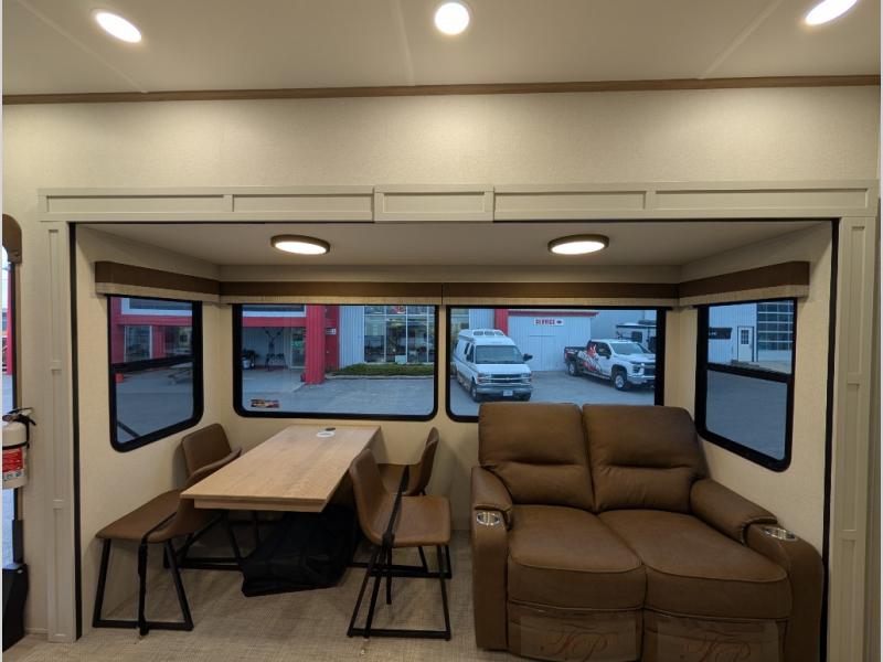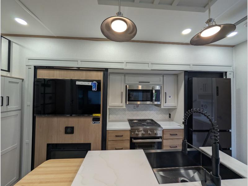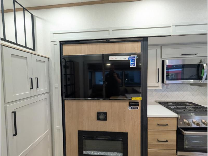 Weekend camping trips and full-time RV living is made complete in this quad slide out fifth wheel. Your crew can relax under the two power awnings, or head inside to enjoy the fireplace. There is also a 50" flat screen TV across from the theater seating, plus a free-standing dinette to dine at. There are two full baths with the front bath including a walk-in shower with a seat for your comfort, and the front private bedroom will feel just like home with its queen bed and large front wardrobe. There is even washer and dryer prep to make laundry day easier than ever. The master bedroom in back includes a second queen bed slide out, and the rear full bath has another convenience with it's exterior entry door, and