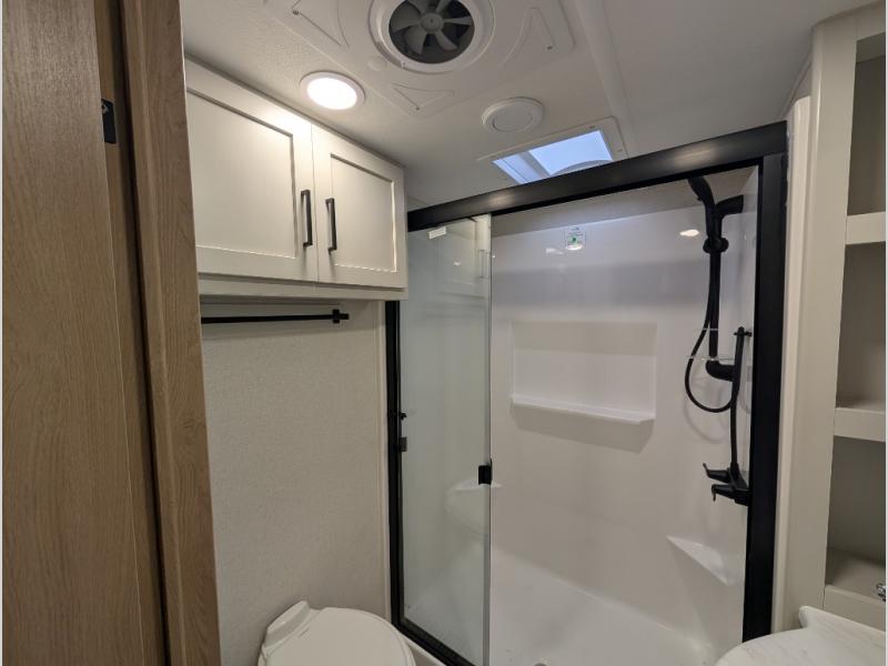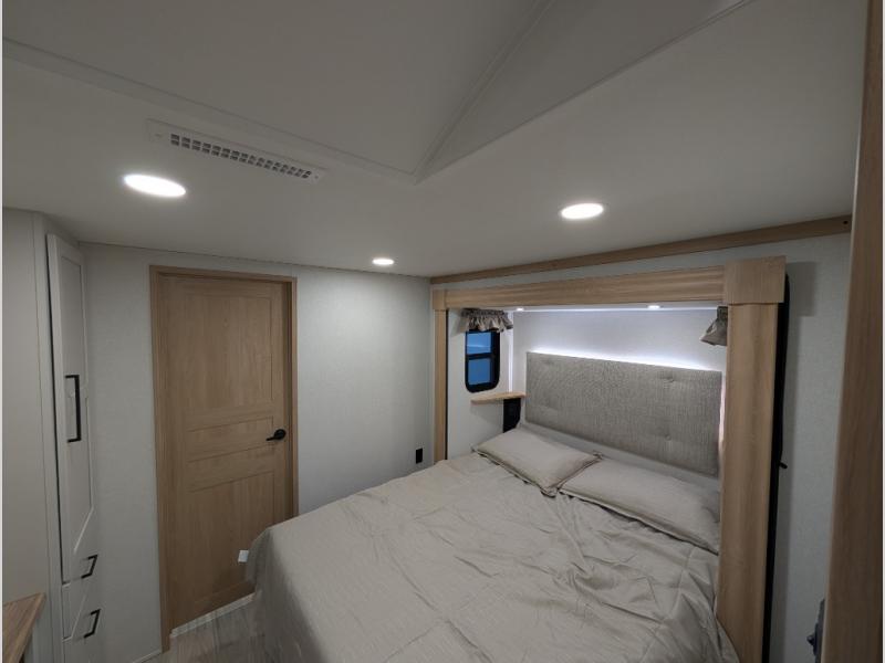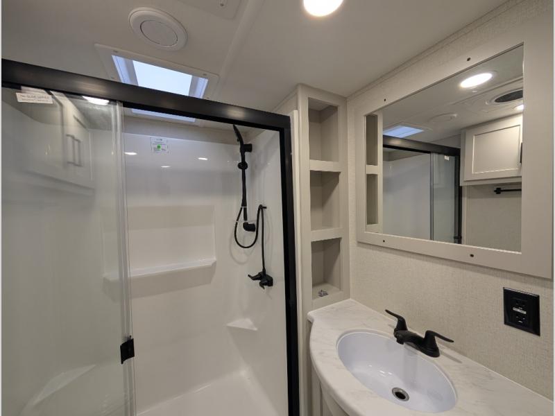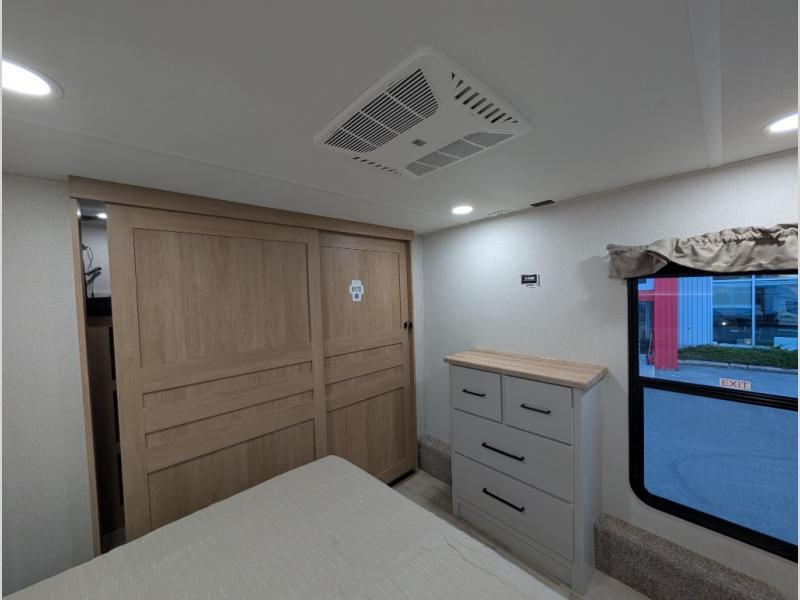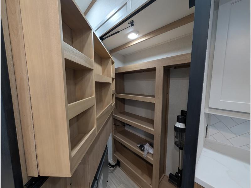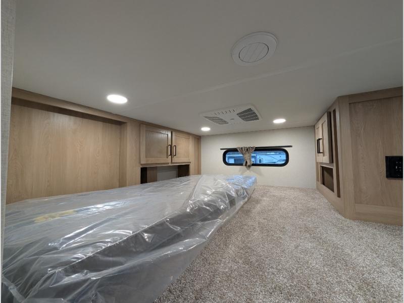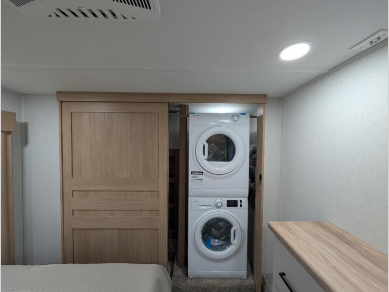 Weekend camping trips and full-time RV living is made complete in this quad slide out fifth wheel. Your crew can relax under the two power awnings, or head inside to enjoy the fireplace. There is also a 50" flat screen TV across from the theater seating, plus a free-standing dinette to dine at. There are two full baths with the front bath including a walk-in shower with a seat for your comfort, and the front private bedroom will feel just like home with its queen bed and large front wardrobe. There is even washer and dryer prep to make laundry day easier than ever. The master bedroom in back includes a second queen bed slide out, and the rear full bath has another convenience with it's exterior entry door, and