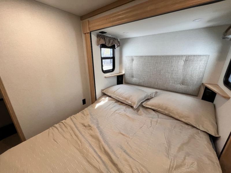 Weekend camping trips and full-time RV living is made complete in this quad slide out fifth wheel. Your crew can relax under the two power awnings, or head inside to enjoy the fireplace. There is also a 50" flat screen TV across from the theater seating, plus a free-standing dinette to dine at. There are two full baths with the front bath including a walk-in shower with a seat for your comfort, and the front private bedroom will feel just like home with its queen bed and large front wardrobe. There is even washer and dryer prep to make laundry day easier than ever. The master bedroom in back includes a second queen bed slide out, and the rear full bath has another convenience with it's exterior entry door, and