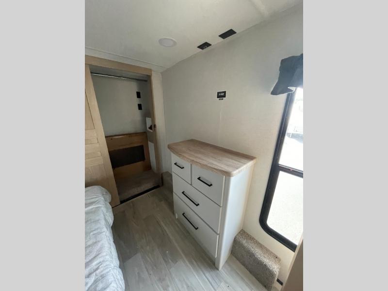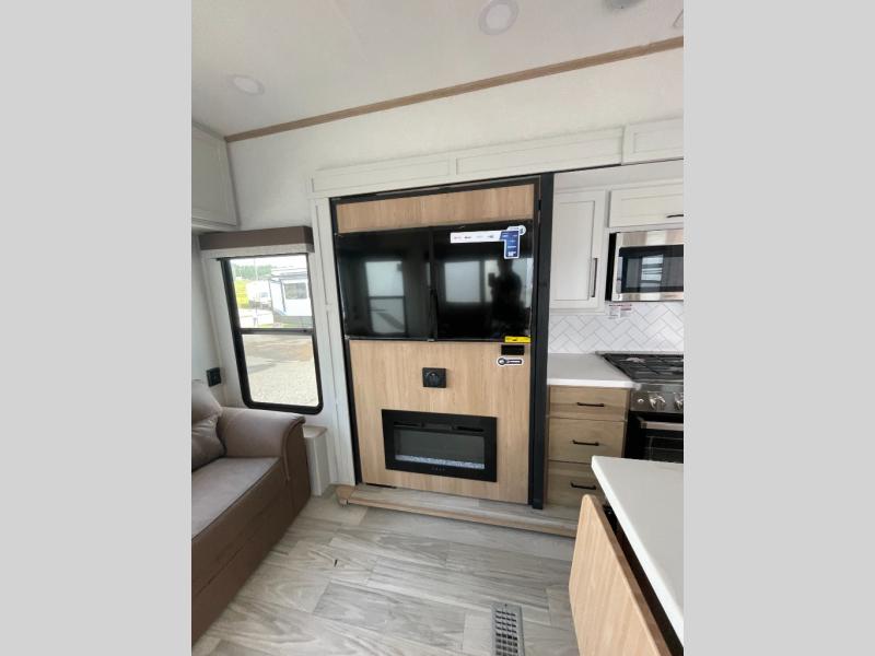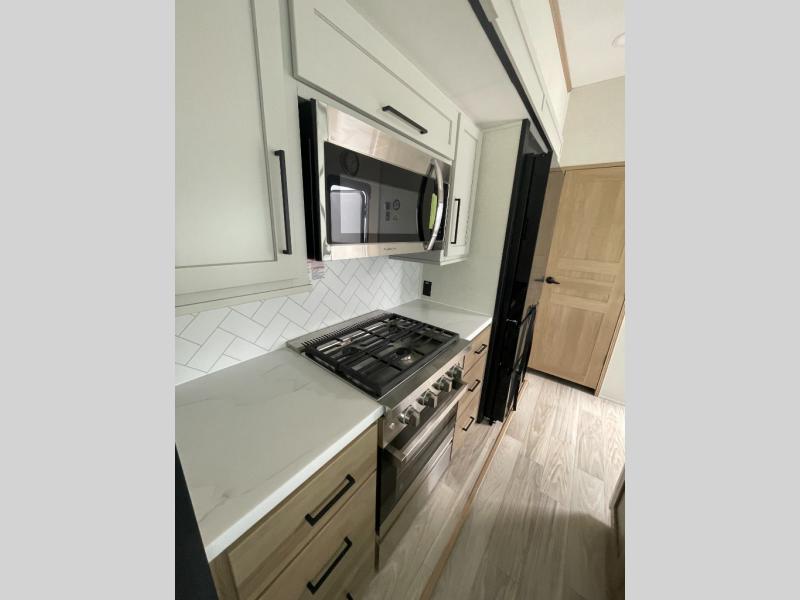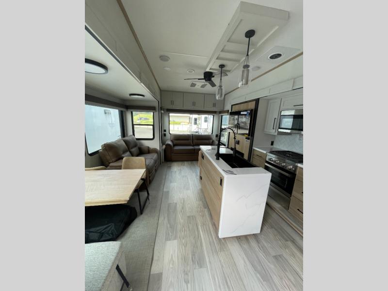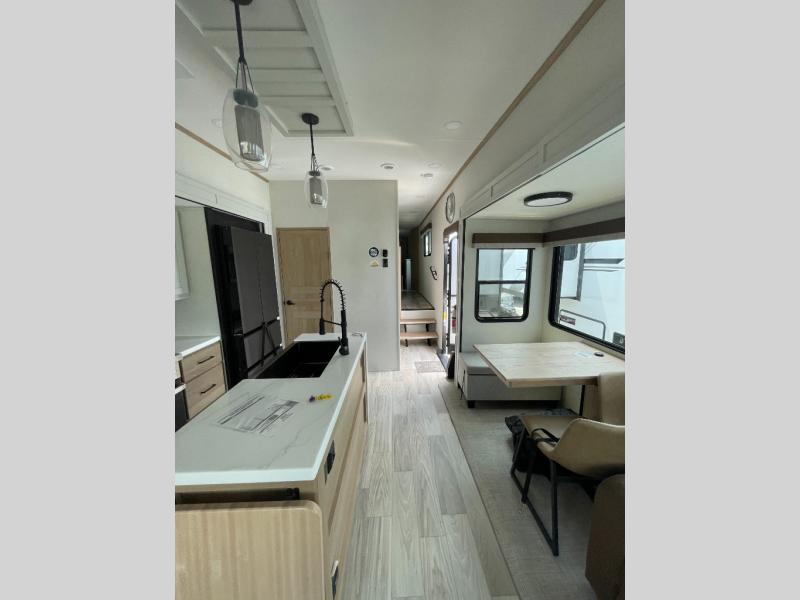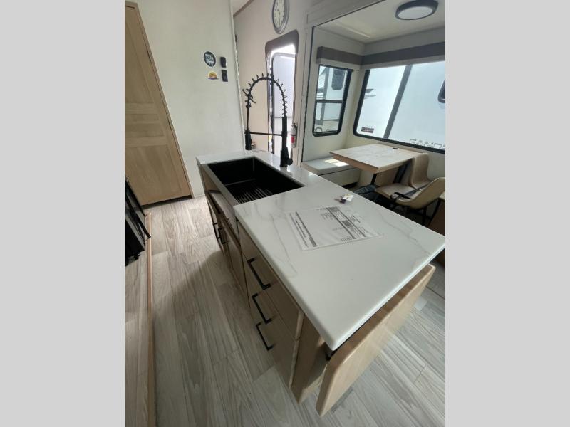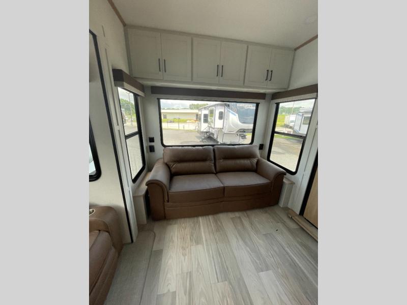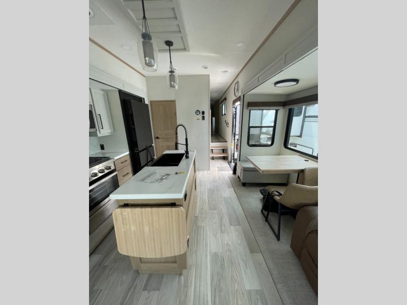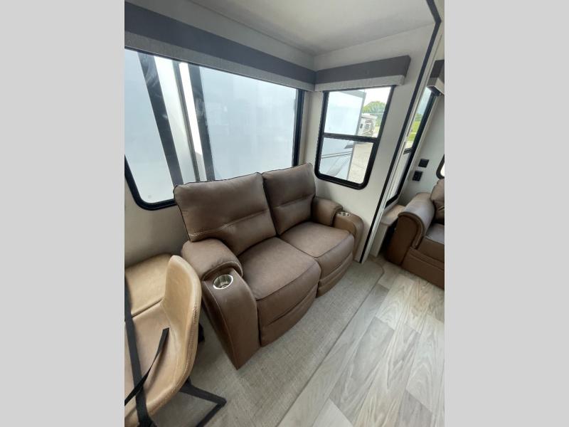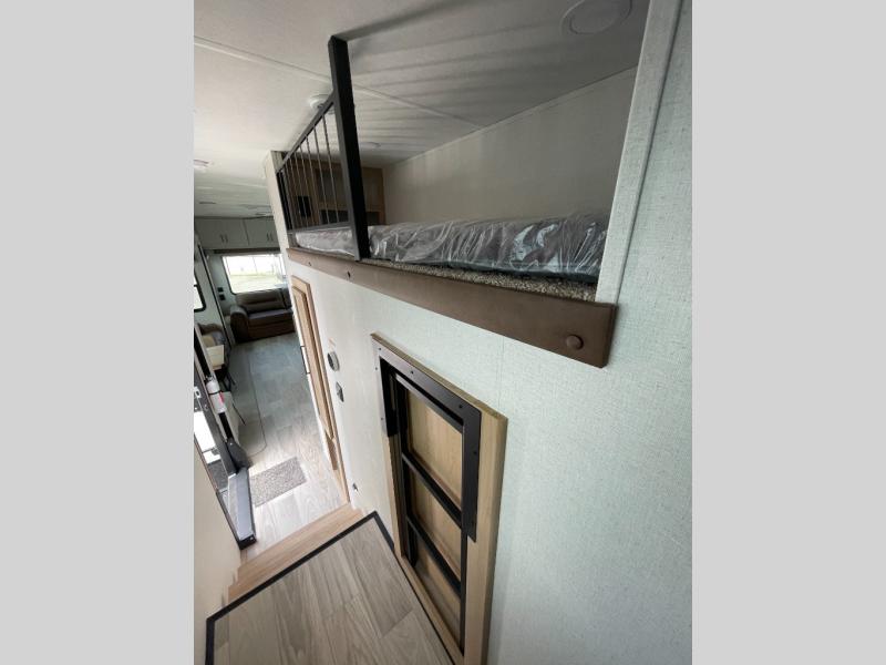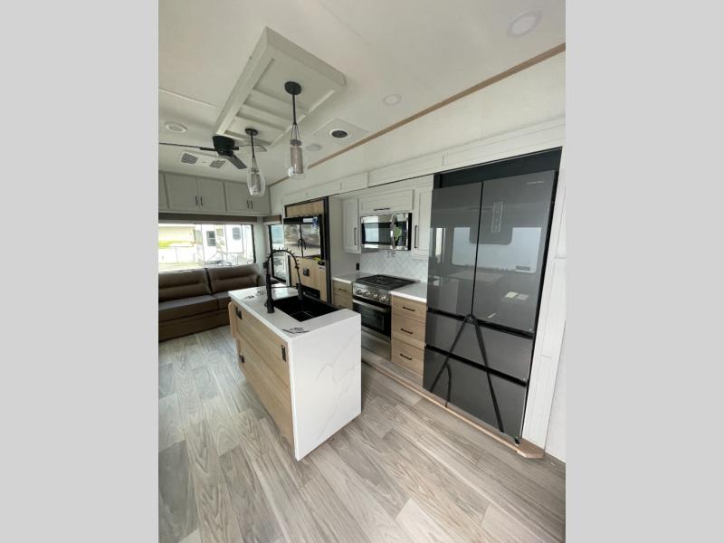 Pick your favorite camping spot and head out for relaxing weekends in this four slide out fifth wheel! You will feel at home in the front private bedroom with its king bed slide out, large front wardrobe with shelves, plus washer and dryer prep if you plan to go full-time. Your guests can make their beds in the middle bunkroom that includes a hide-a-bed sofa with a bunk above, plus a desk if you choose to make this room an office. There is even a loft above this room for more sleeping or storage space. Everyone will love to meet in the middle living area that includes a rear hide-a-bed sofa, theater seating across from the entertainment center, and a free-standing table and chairs for dining. And the chef will enjoy having a kitchen island for more prep space, along with a 17 cu. ft. 12V refrigerator and a three burner high output range with a 22" oven. Don't overlook the exterior with an outside kitchen, 20' power awning, and pass-through storage!