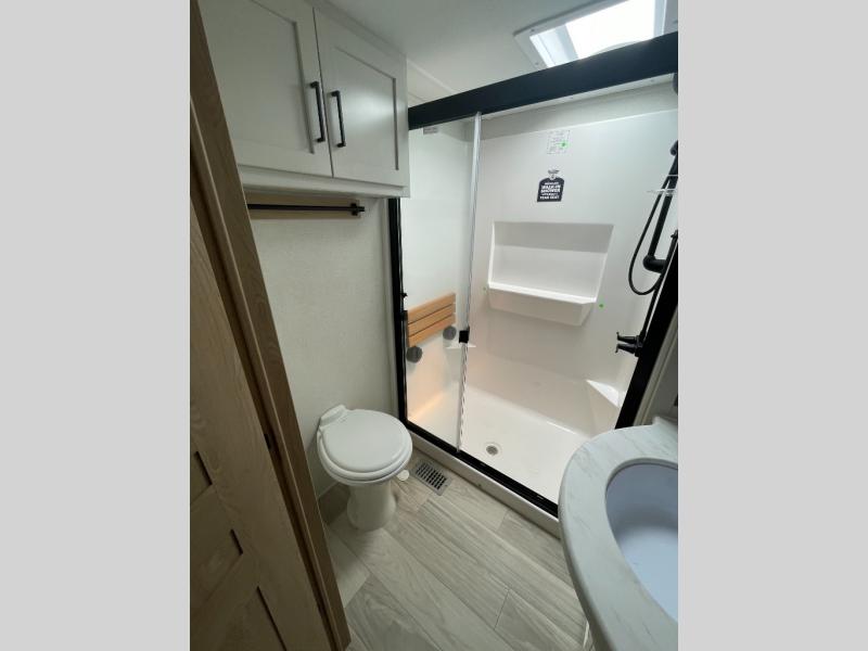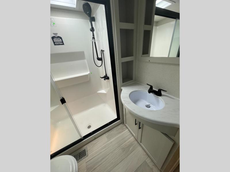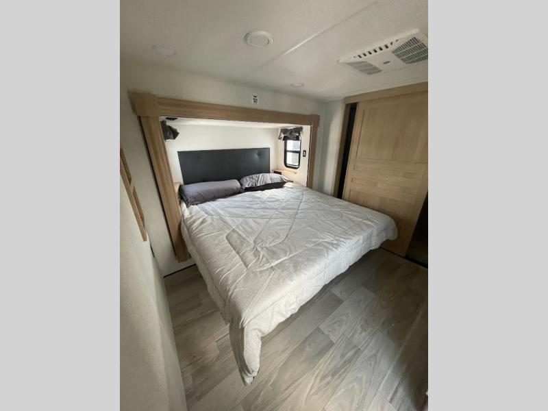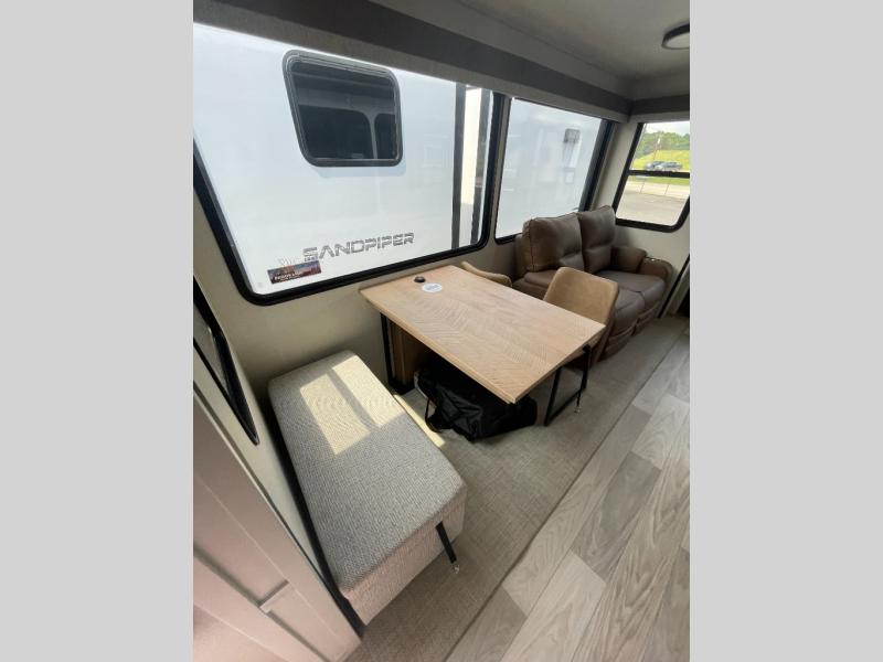 You will find the perfect balance of size, space, features, and luxury with any one of these Forest River Sandpiper fifth wheels! They are constructed with a welded aluminum framed vacuum bonded laminated superstructure, a cambered powder coated frame with rust prohibitor, and a fully enclosed underbelly to protect the units vitals during any season. The large tinted windows come with a 80/20 UV prohibitor and the unobstructed pass-through storage area is big enough to store all of your outdoor gear. You will be able to see clearly even outside at night with the porch light that has an interior switch and the electric awning with an LED light strip. The interiors are designed with modern décor, rustic wood plank linoleum, and stainless steel appliances. Don't pass up your chance to camp in true luxury, come find your model today!
