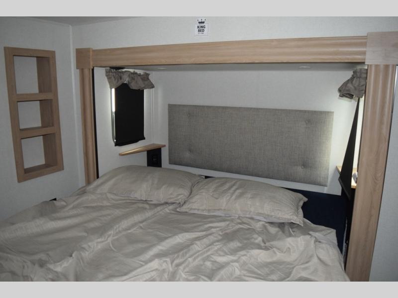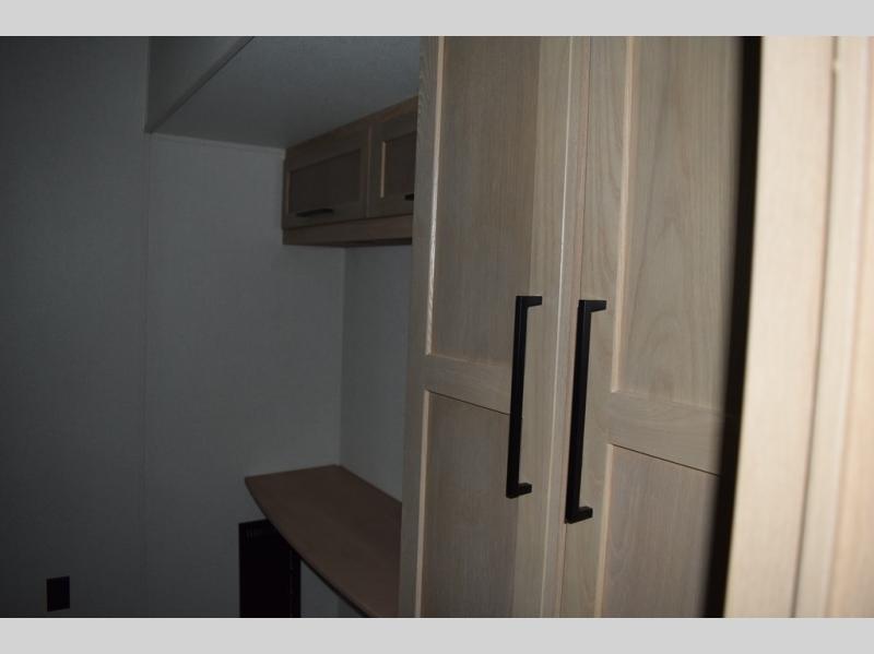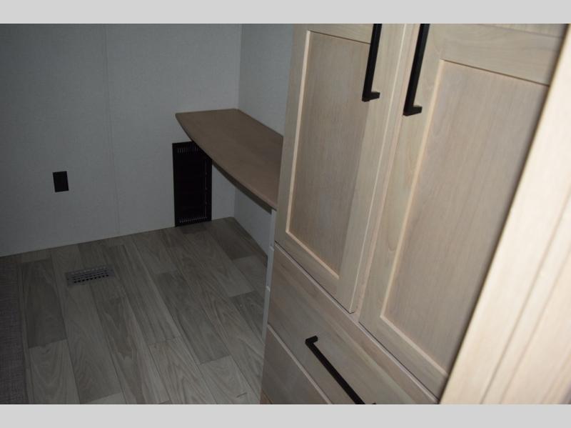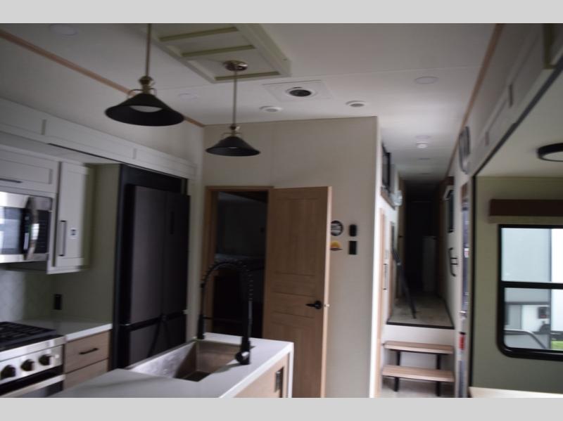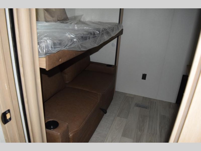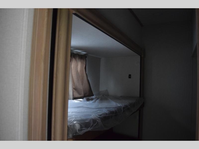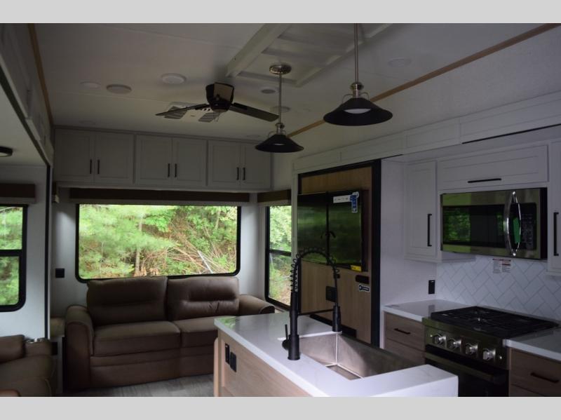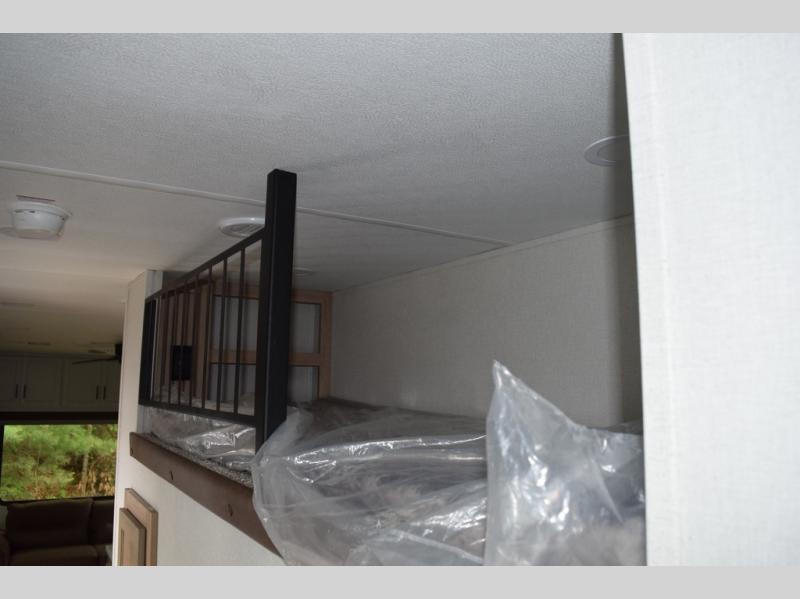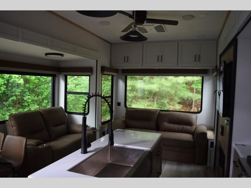 Pick your favorite camping spot and head out for relaxing weekends in this four slide out fifth wheel! You will feel at home in the front private bedroom with its king bed slide out, large front wardrobe with shelves, plus washer and dryer prep if you plan to go full-time. Your guests can make their beds in the middle bunkroom that includes a hide-a-bed sofa with a bunk above, plus a desk if you choose to make this room an office. There is even a loft above this room for more sleeping or storage space. Everyone will love to meet in the middle living area that includes a rear hide-a-bed sofa, theater seating across from the entertainment center, and a free-standing table and chairs for dining. And the chef will enjoy having a kitchen island for more prep space, along with a 17 cu. ft. 12V refrigerator and a three burner high output range with a 22" oven. Don't overlook the exterior with an outside kitchen, 20' power awning, and pass-through storage!