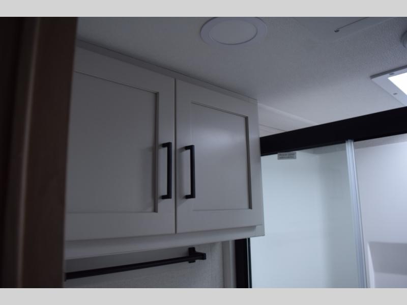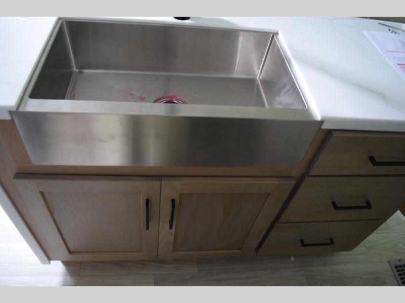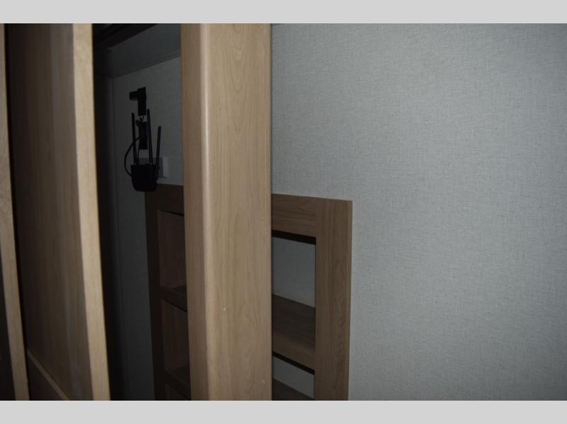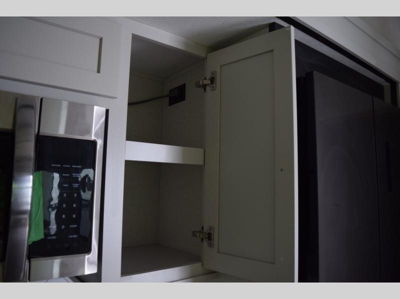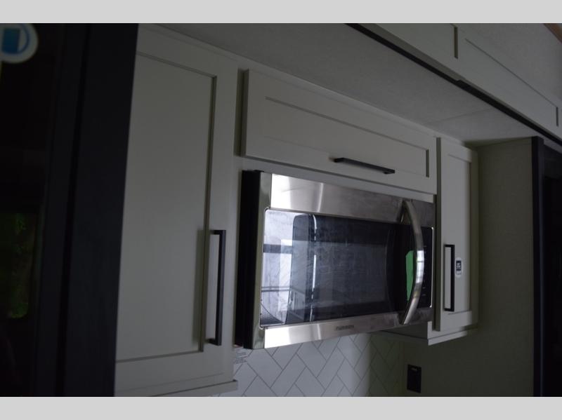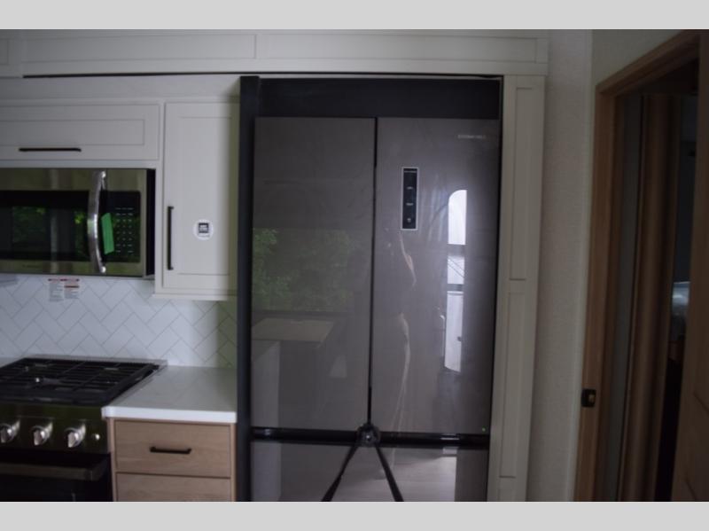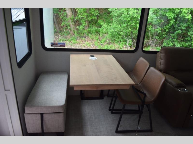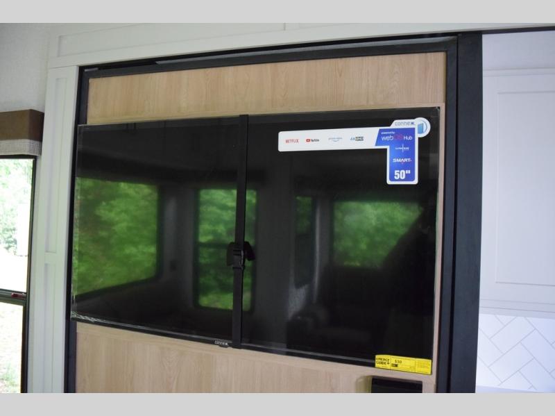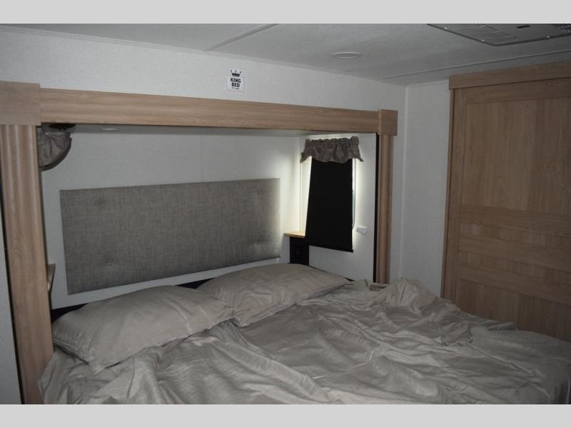 Pick your favorite camping spot and head out for relaxing weekends in this four slide out fifth wheel! You will feel at home in the front private bedroom with its king bed slide out, large front wardrobe with shelves, plus washer and dryer prep if you plan to go full-time. Your guests can make their beds in the middle bunkroom that includes a hide-a-bed sofa with a bunk above, plus a desk if you choose to make this room an office. There is even a loft above this room for more sleeping or storage space. Everyone will love to meet in the middle living area that includes a rear hide-a-bed sofa, theater seating across from the entertainment center, and a free-standing table and chairs for dining. And the chef will enjoy having a kitchen island for more prep space, along with a 17 cu. ft. 12V refrigerator and a three burner high output range with a 22" oven. Don't overlook the exterior with an outside kitchen, 20' power awning, and pass-through storage!