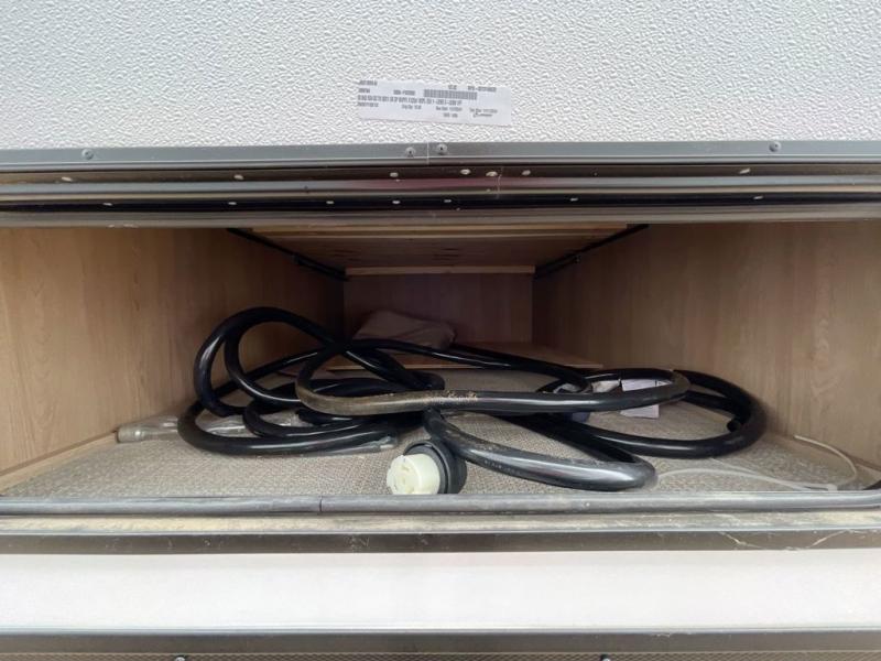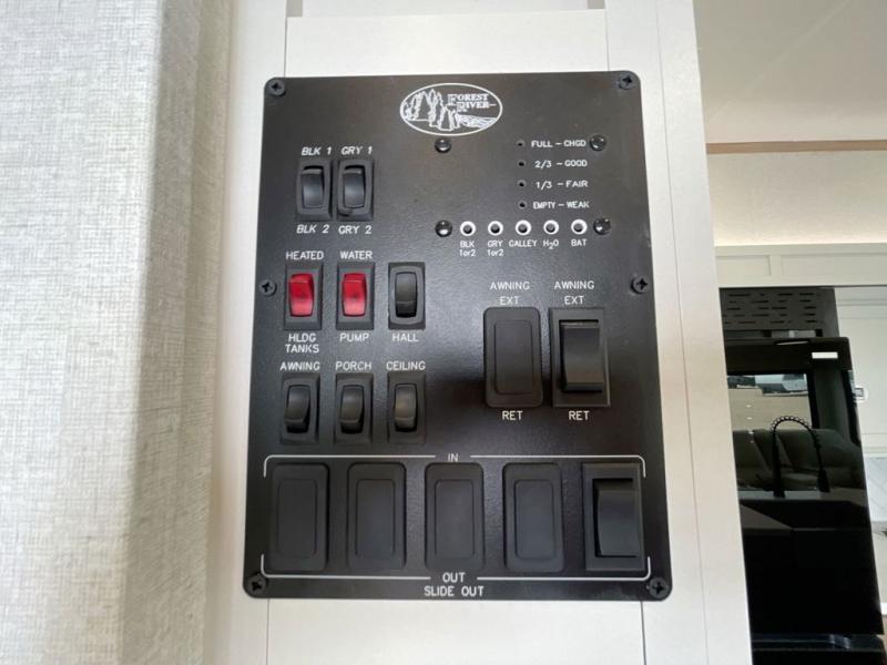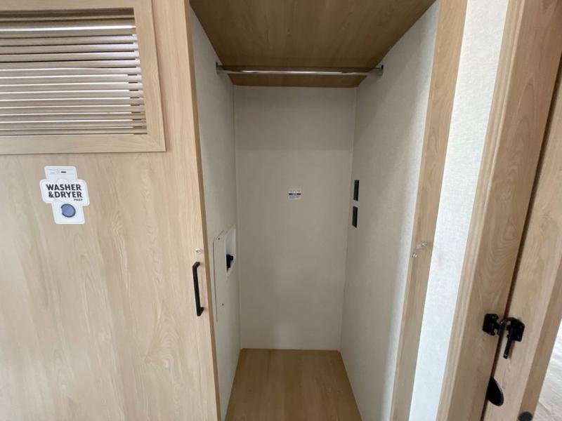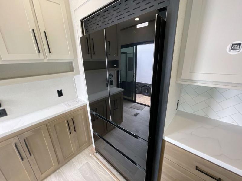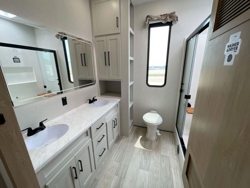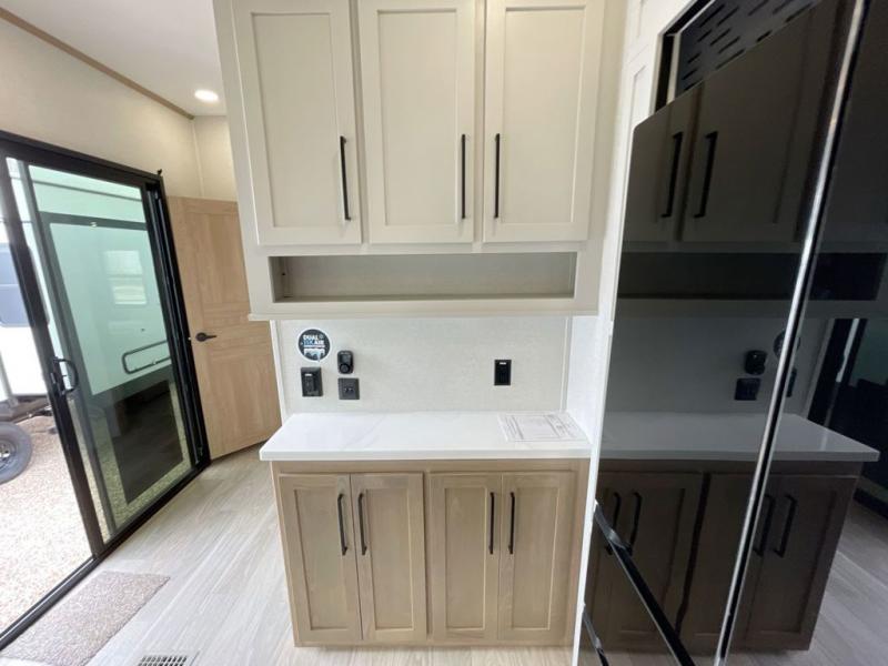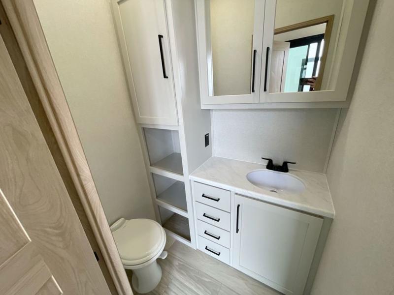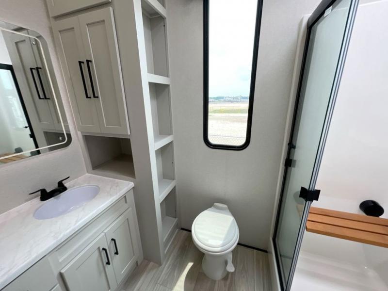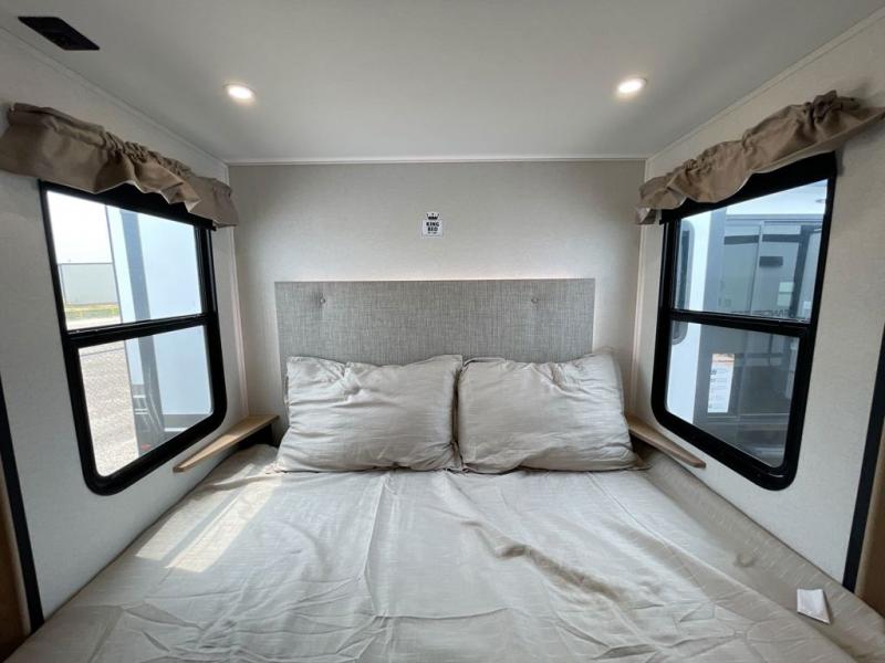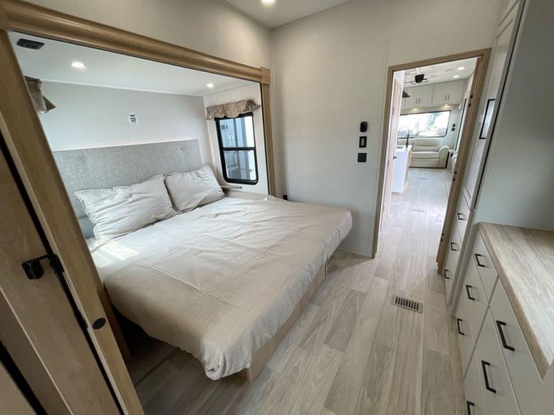 You'll love extended stays in this spacious destination trailer. The master bedroom includes a slide out king bed, a dresser with TV prep, dual wardrobes, plus a full rear bath. Everyone can gather in the front living area each night for a game at the dinette with two chairs and a bench seat, or a movie night on the theater seating and 50" flat screen TV. There is also a hide-a-bed sofa, an entertainment center, plus a ceiling fan to keep air flowing. This model also includes a hidden pantry behind the TV to store paper goods or snacks, plus a hutch with counter space so you can bring along your nice dishes. The middle half bath is another great feature you will love on this trailer, and the patio doors will make it feel more like home.