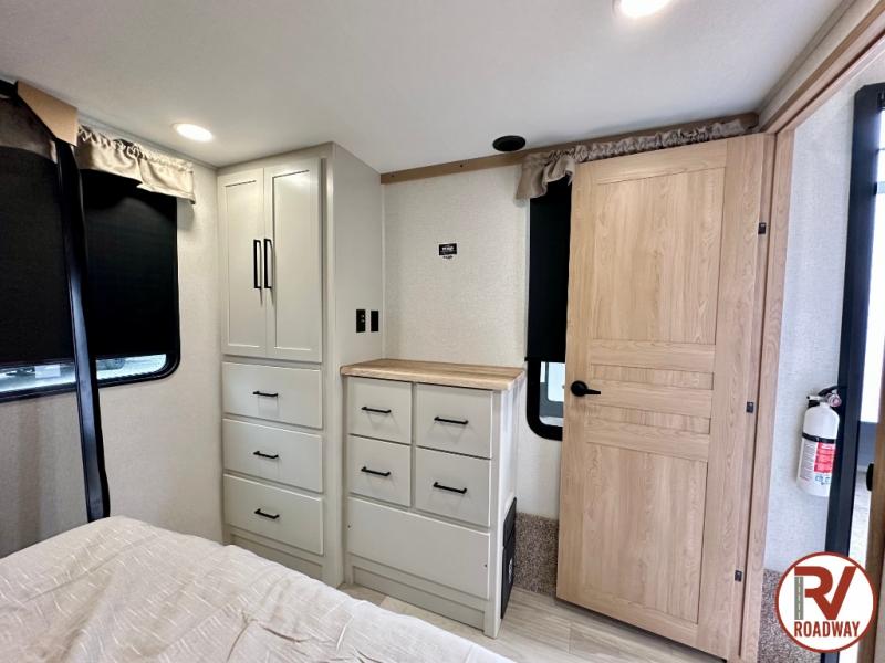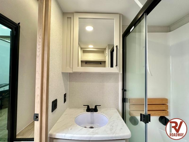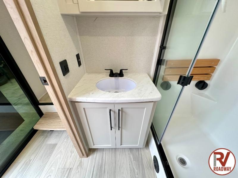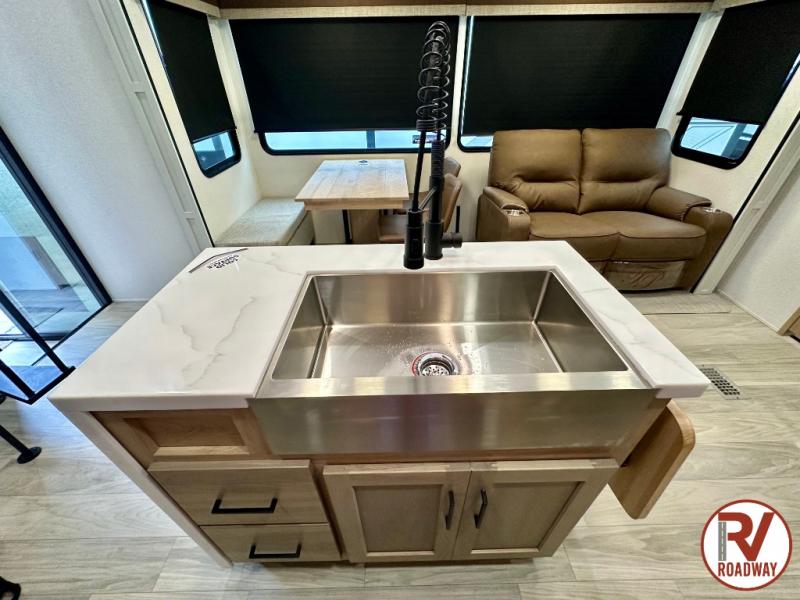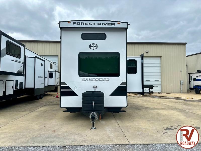 The Sandpiper Destination Trailers by Forest River are ready for extended stays at the location of your choice! The cambered powder coated frame with rust prohibitor will help extend the life of your RV and the Underbelly Armor will protect your trailer and provide better insulation. There are also color matched exterior fiberglass sidewalls outside, along with rain gutters with extra long drip spouts to prevent black streaking, and an exterior porch light just like at home. The Destination Package includes features to make your trips hassle-free, like the two 15,000 BTU A/C units, on-demand water heater, and Chef Collection three burner 24" range. A commercial style kitchen faucet and designer backsplash is included with the Extended Stay Package, as well as solid surface countertops, and a stainless steel apron sink with a strainer to name a few comforts. Available options include a central vacuum system, stabilizer jacks, plus dual pane windows and more!
