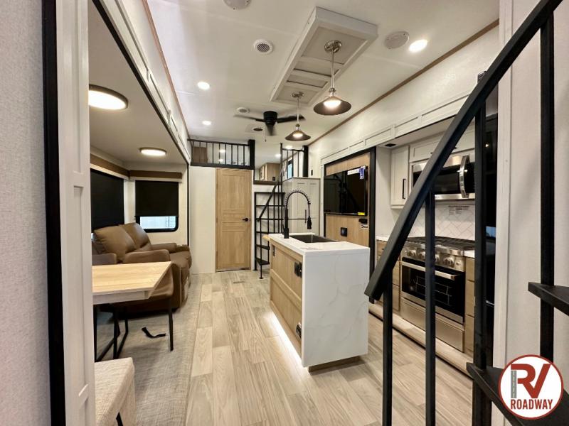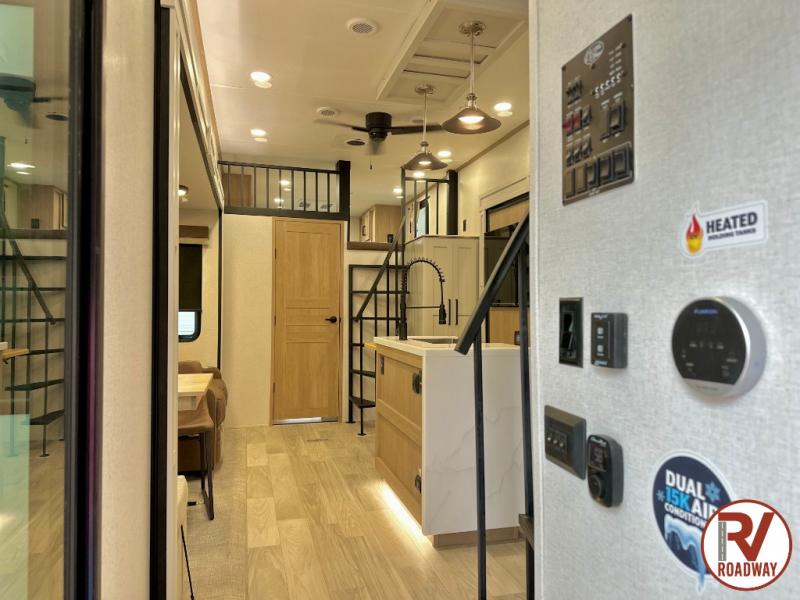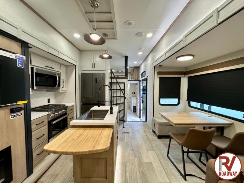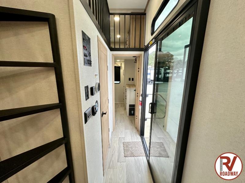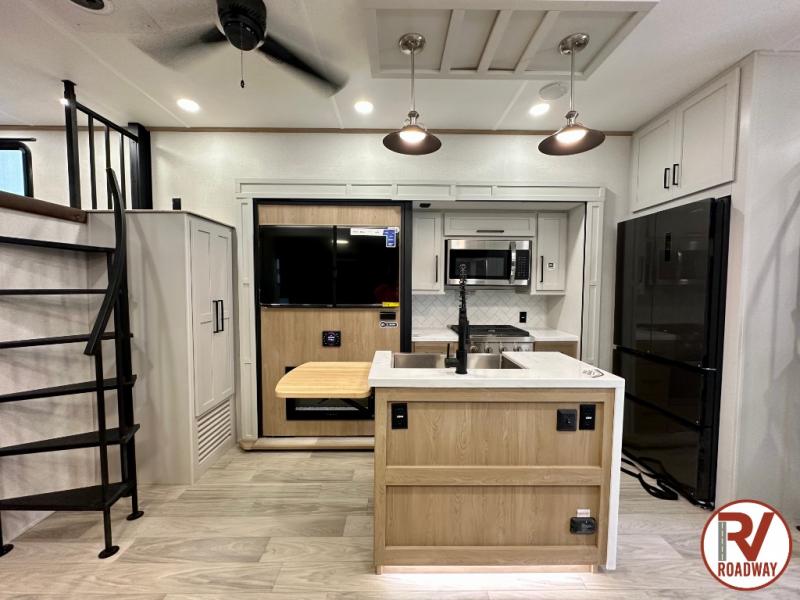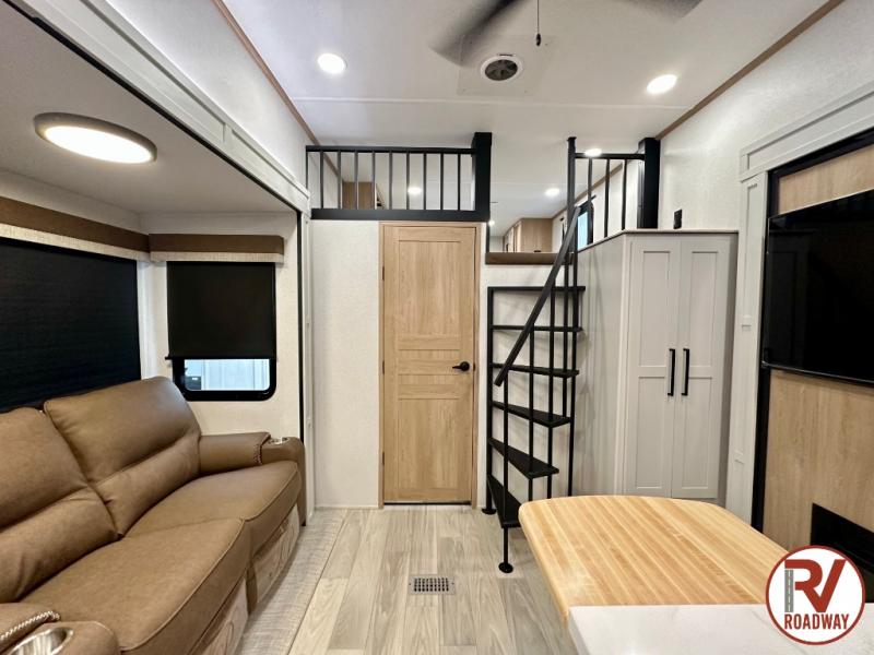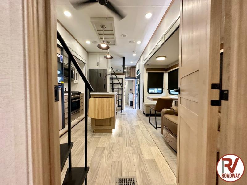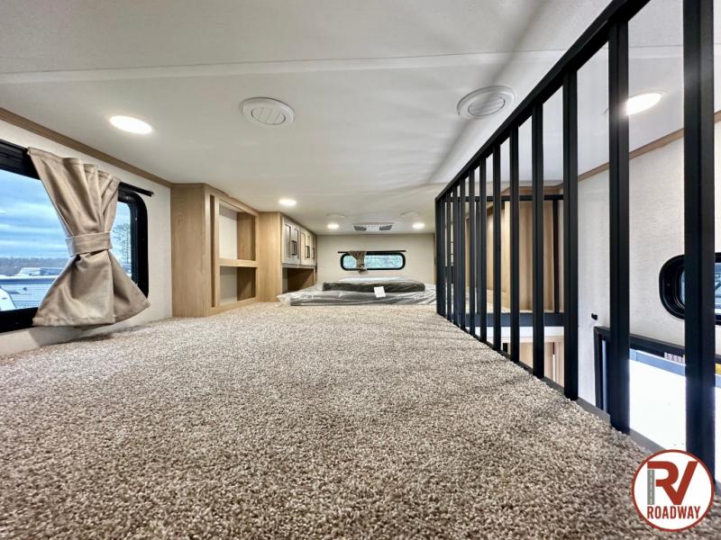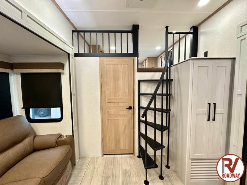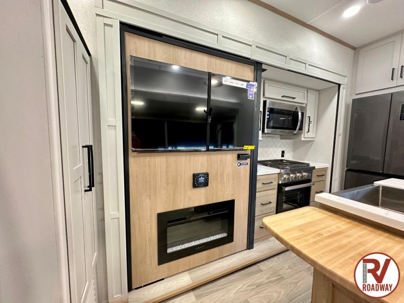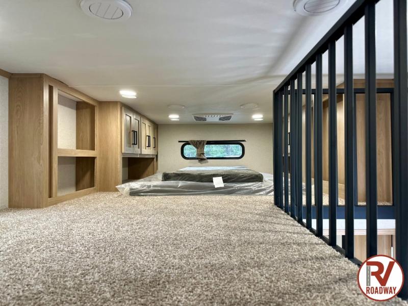 You won't believe the comfort and convenience found in this destination trailer. There are two private bedrooms; one up front with a queen bed slide out and storage space, and one in back with a queen bed slide out and a half bath! There is even washer and dryer prep here if you want to add those appliances and the second entry door is found here so you can easily slip out in the morning. Above each of these rooms is a loft area three total bunk mats, storage cabinets, and TV prep in the front loft if you want to add entertainment. Everyone can meet in the combined kitchen and living room that includes dual opposing slides, theater seating across from the 50" flat screen TV and fireplace, plus a free-standing dinette with chairs and bench seating. The chef of your group will love the large kitchen island with a countertop extension, a 16.2 cu. ft. 12V refrigerator, a hidden pantry, and more!