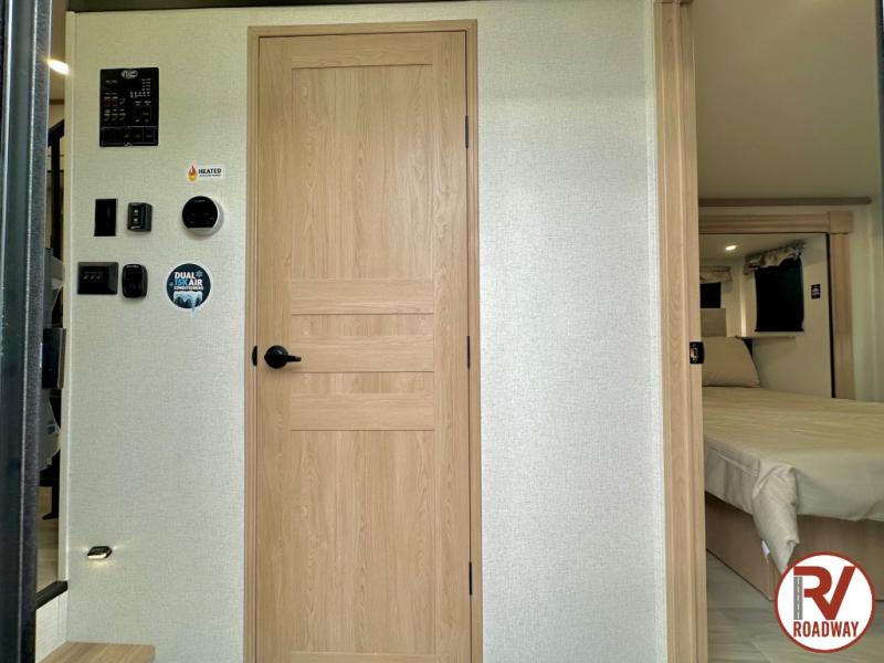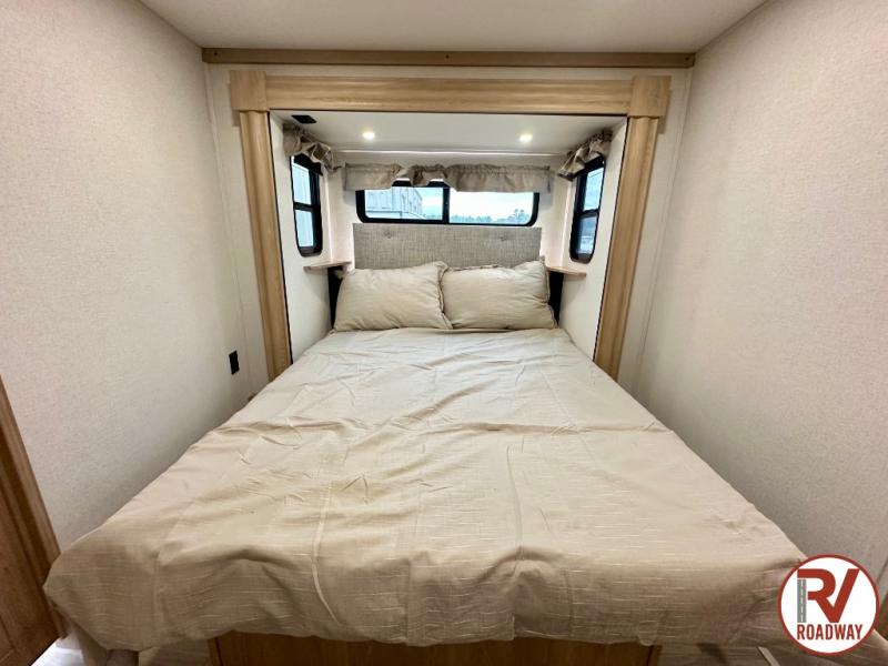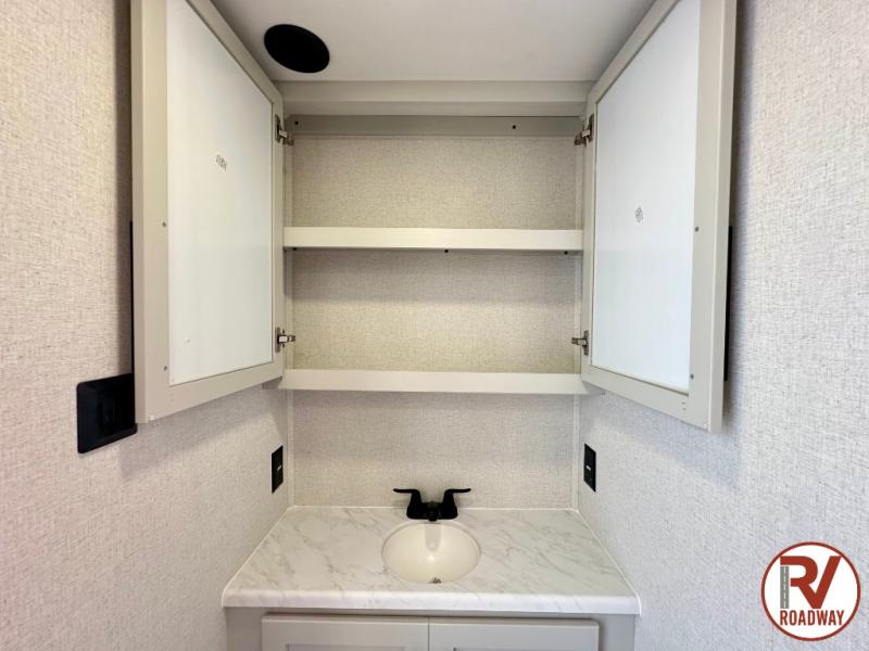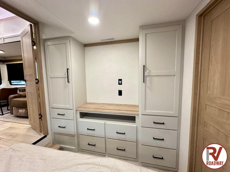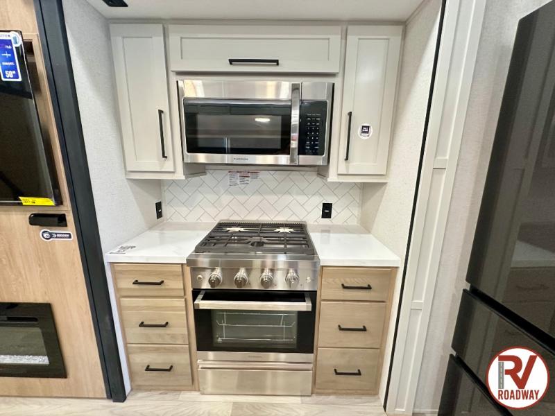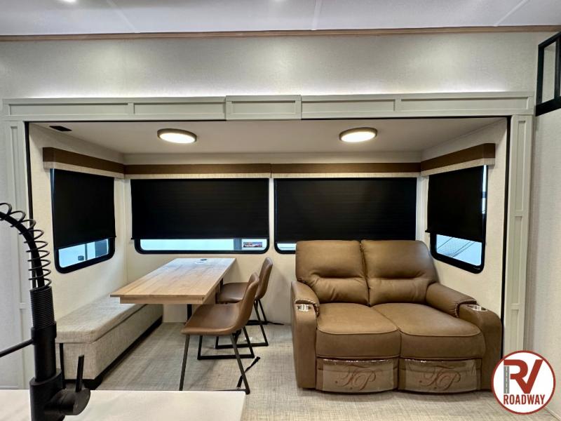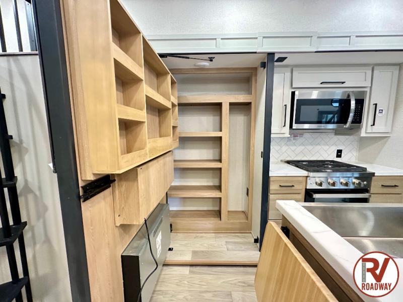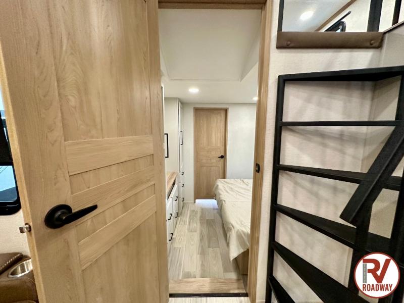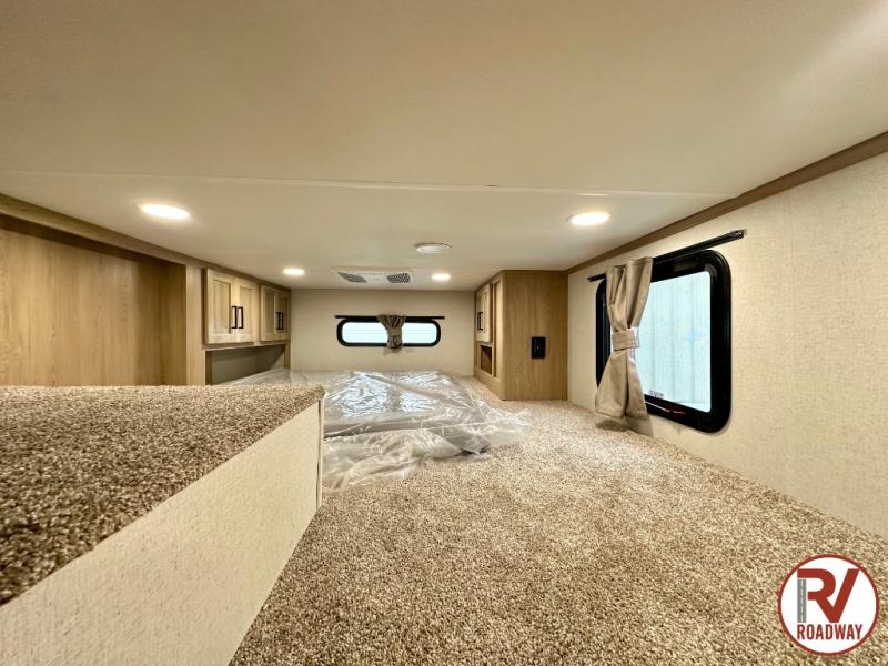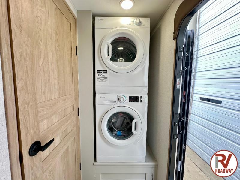 You won't believe the comfort and convenience found in this destination trailer. There are two private bedrooms; one up front with a queen bed slide out and storage space, and one in back with a queen bed slide out and a half bath! There is even washer and dryer prep here if you want to add those appliances and the second entry door is found here so you can easily slip out in the morning. Above each of these rooms is a loft area three total bunk mats, storage cabinets, and TV prep in the front loft if you want to add entertainment. Everyone can meet in the combined kitchen and living room that includes dual opposing slides, theater seating across from the 50" flat screen TV and fireplace, plus a free-standing dinette with chairs and bench seating. The chef of your group will love the large kitchen island with a countertop extension, a 16.2 cu. ft. 12V refrigerator, a hidden pantry, and more!
