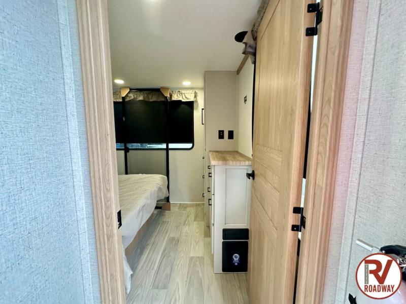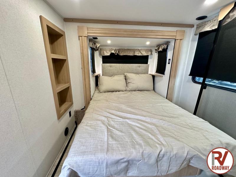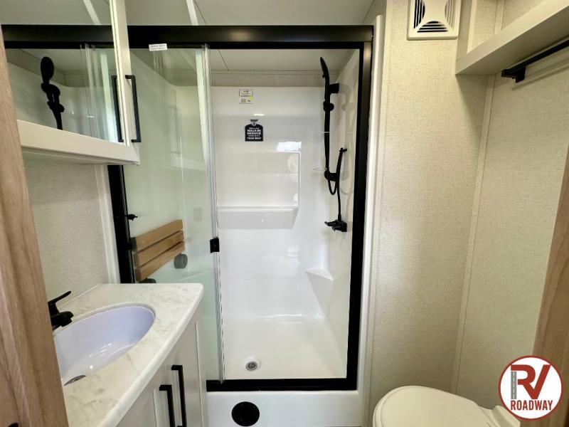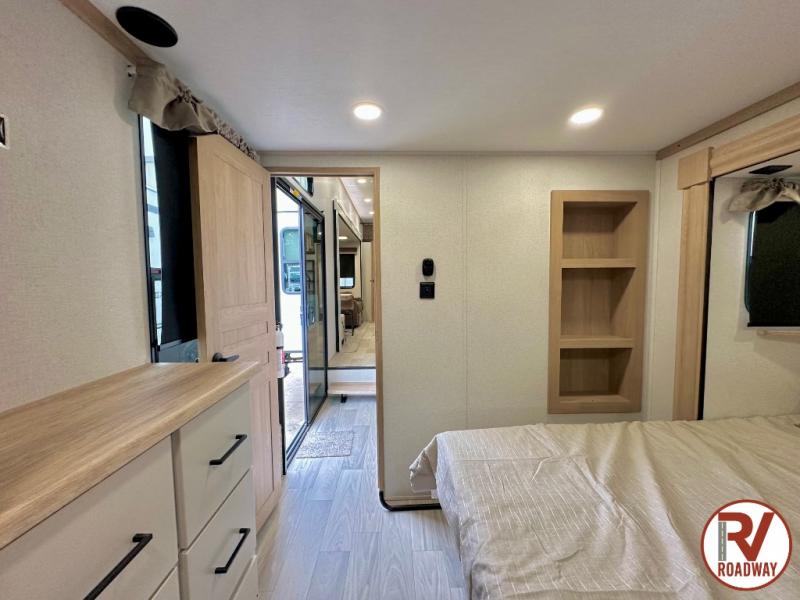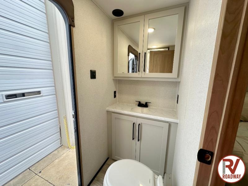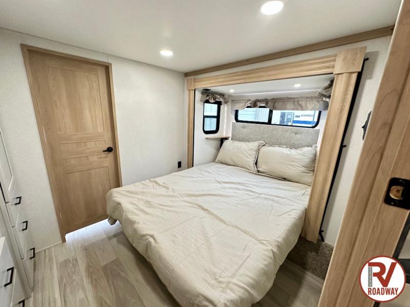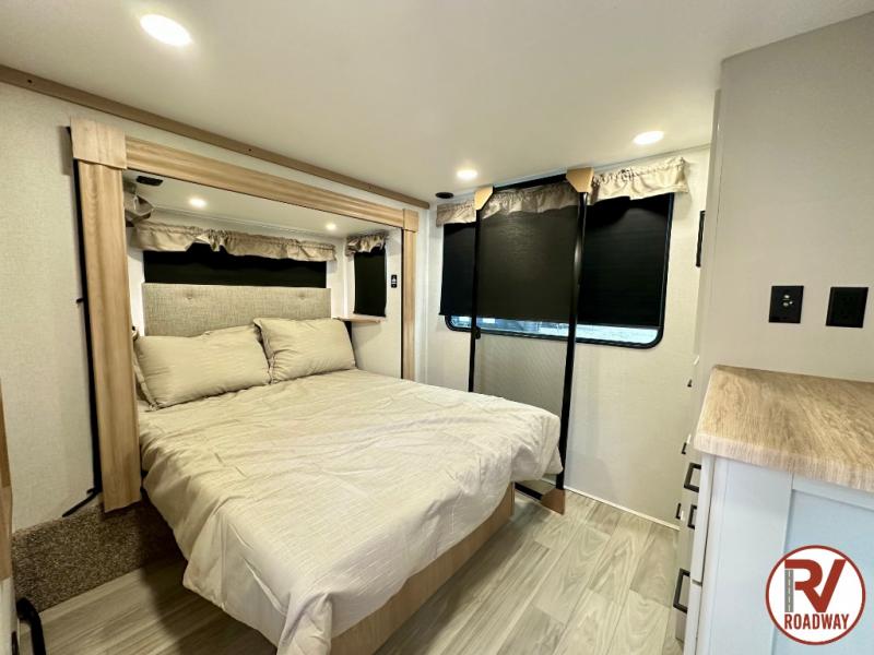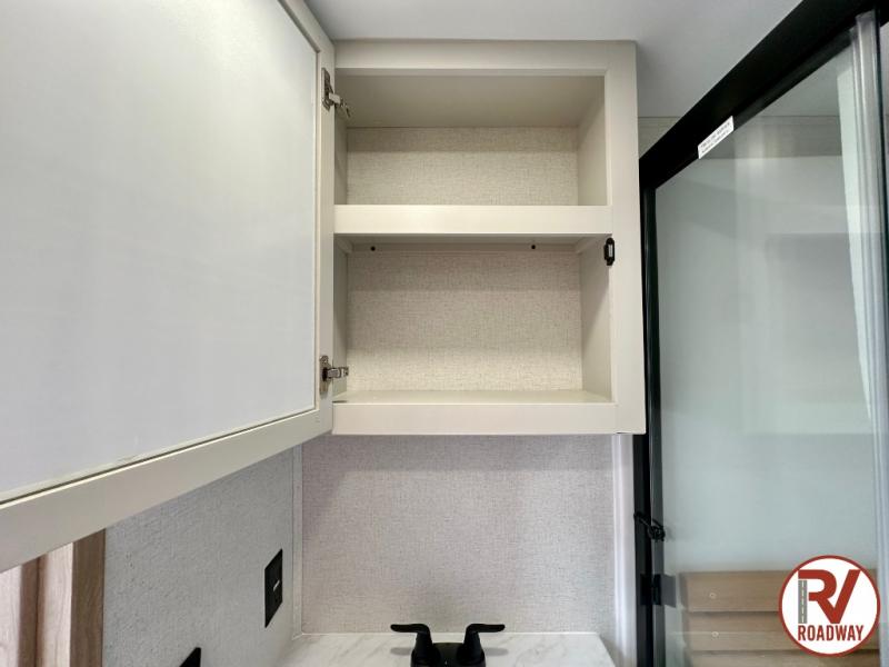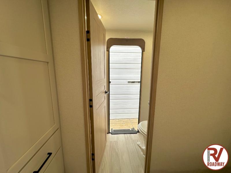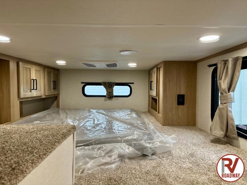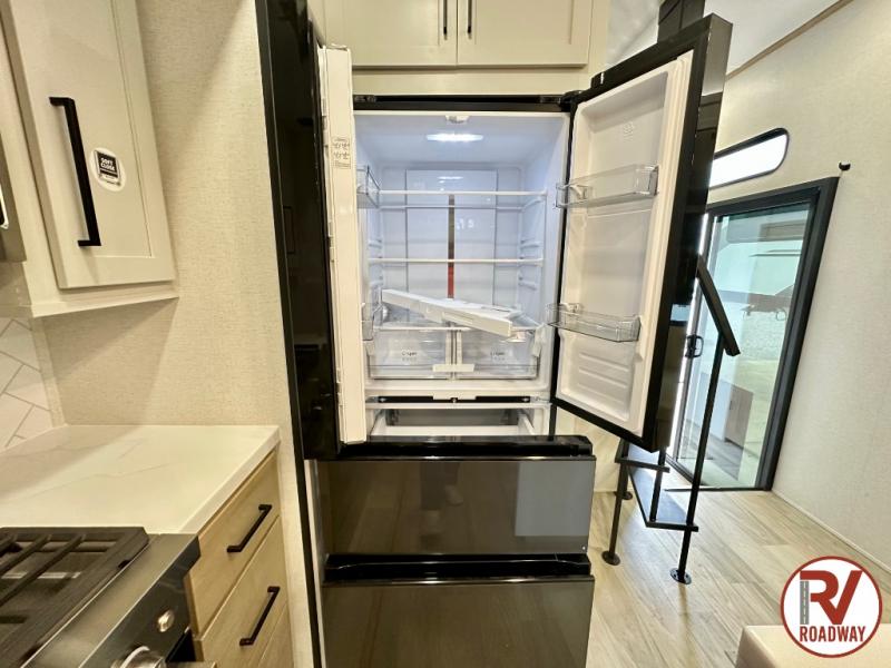 You won't believe the comfort and convenience found in this destination trailer. There are two private bedrooms; one up front with a queen bed slide out and storage space, and one in back with a queen bed slide out and a half bath! There is even washer and dryer prep here if you want to add those appliances and the second entry door is found here so you can easily slip out in the morning. Above each of these rooms is a loft area three total bunk mats, storage cabinets, and TV prep in the front loft if you want to add entertainment. Everyone can meet in the combined kitchen and living room that includes dual opposing slides, theater seating across from the 50" flat screen TV and fireplace, plus a free-standing dinette with chairs and bench seating. The chef of your group will love the large kitchen island with a countertop extension, a 16.2 cu. ft. 12V refrigerator, a hidden pantry, and more!
