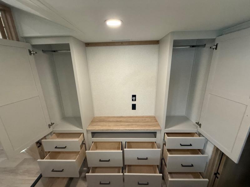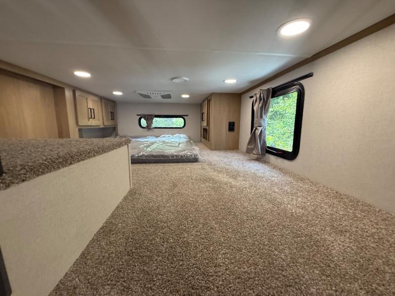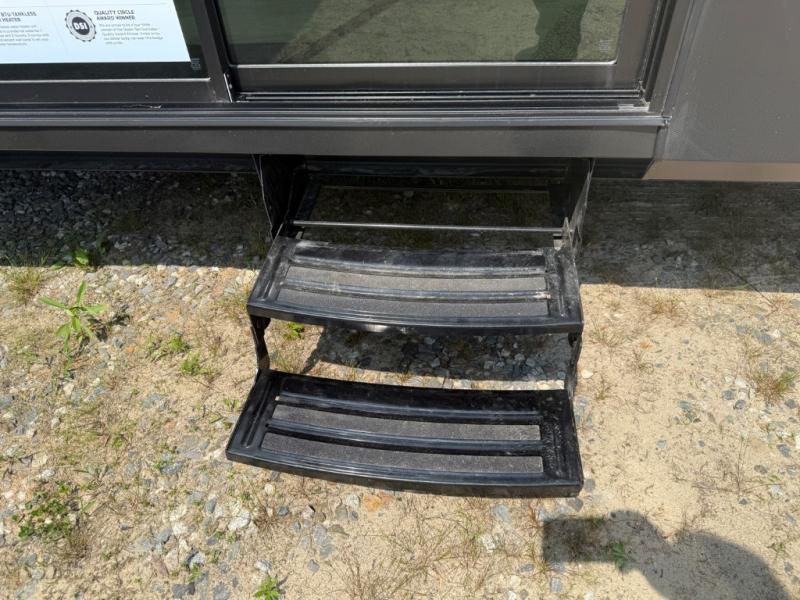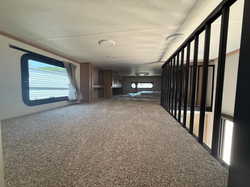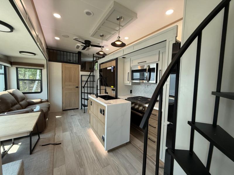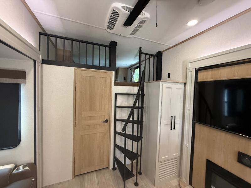 You won't believe the comfort and convenience found in this destination trailer. There are two private bedrooms; one up front with a queen bed slide out and storage space, and one in back with a queen bed slide out and a half bath! There is even washer and dryer prep here if you want to add those appliances and the second entry door is found here so you can easily slip out in the morning. Above each of these rooms is a loft area three total bunk mats, storage cabinets, and TV prep in the front loft if you want to add entertainment. Everyone can meet in the combined kitchen and living room that includes dual opposing slides, theater seating across from the 50" flat screen TV and fireplace, plus a free-standing dinette with chairs and bench seating. The chef of your group will love the large kitchen island with a countertop extension, a 16.2 cu. ft. 12V refrigerator, a hidden pantry, and more!