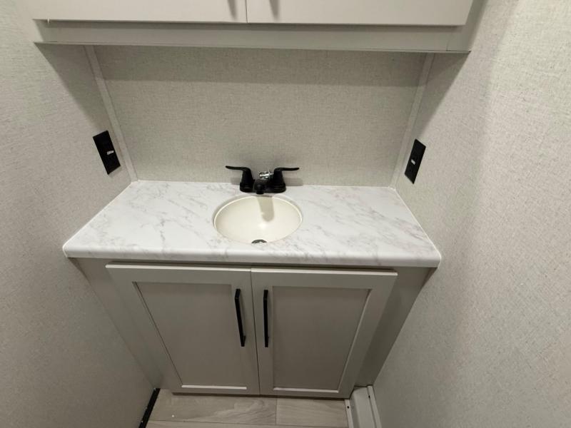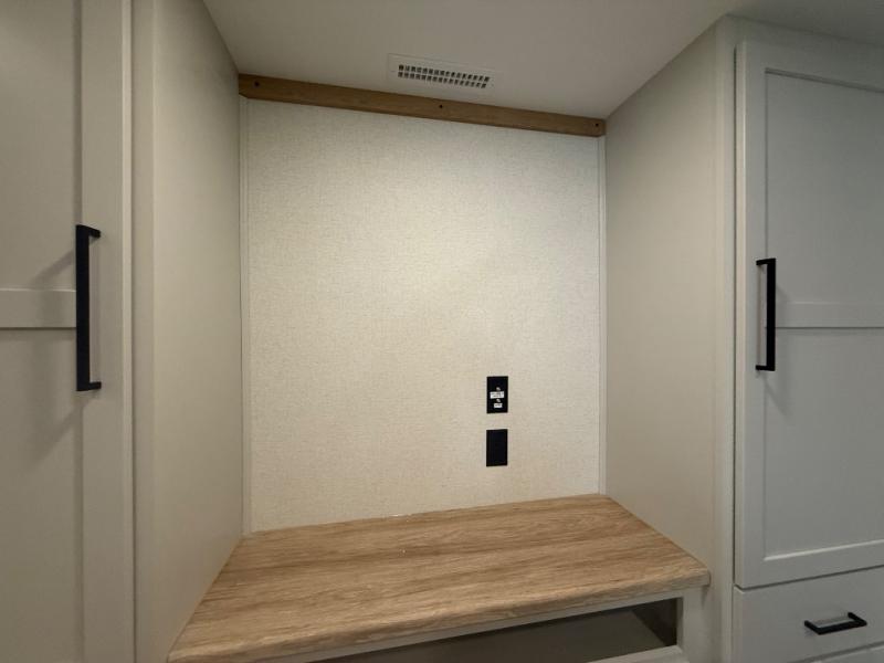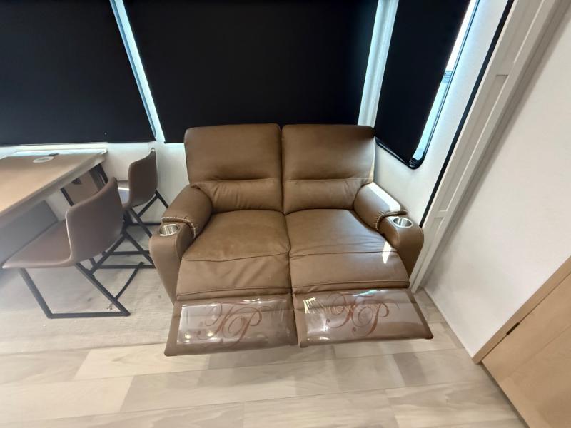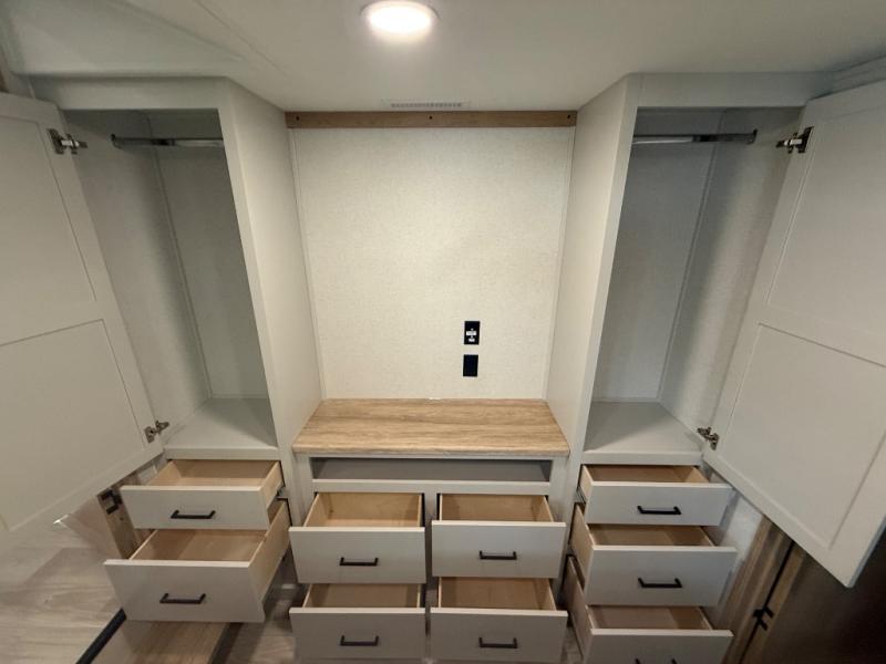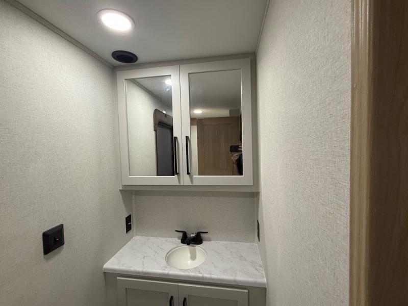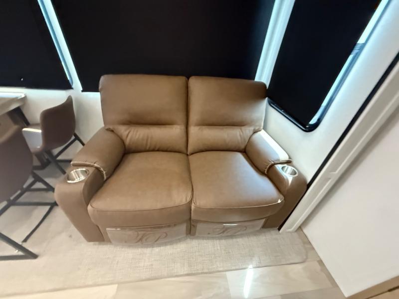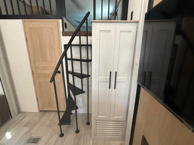 You won't believe the comfort and convenience found in this destination trailer. There are two private bedrooms; one up front with a queen bed slide out and storage space, and one in back with a queen bed slide out and a half bath! There is even washer and dryer prep here if you want to add those appliances and the second entry door is found here so you can easily slip out in the morning. Above each of these rooms is a loft area three total bunk mats, storage cabinets, and TV prep in the front loft if you want to add entertainment. Everyone can meet in the combined kitchen and living room that includes dual opposing slides, theater seating across from the 50" flat screen TV and fireplace, plus a free-standing dinette with chairs and bench seating. The chef of your group will love the large kitchen island with a countertop extension, a 16.2 cu. ft. 12V refrigerator, a hidden pantry, and more!